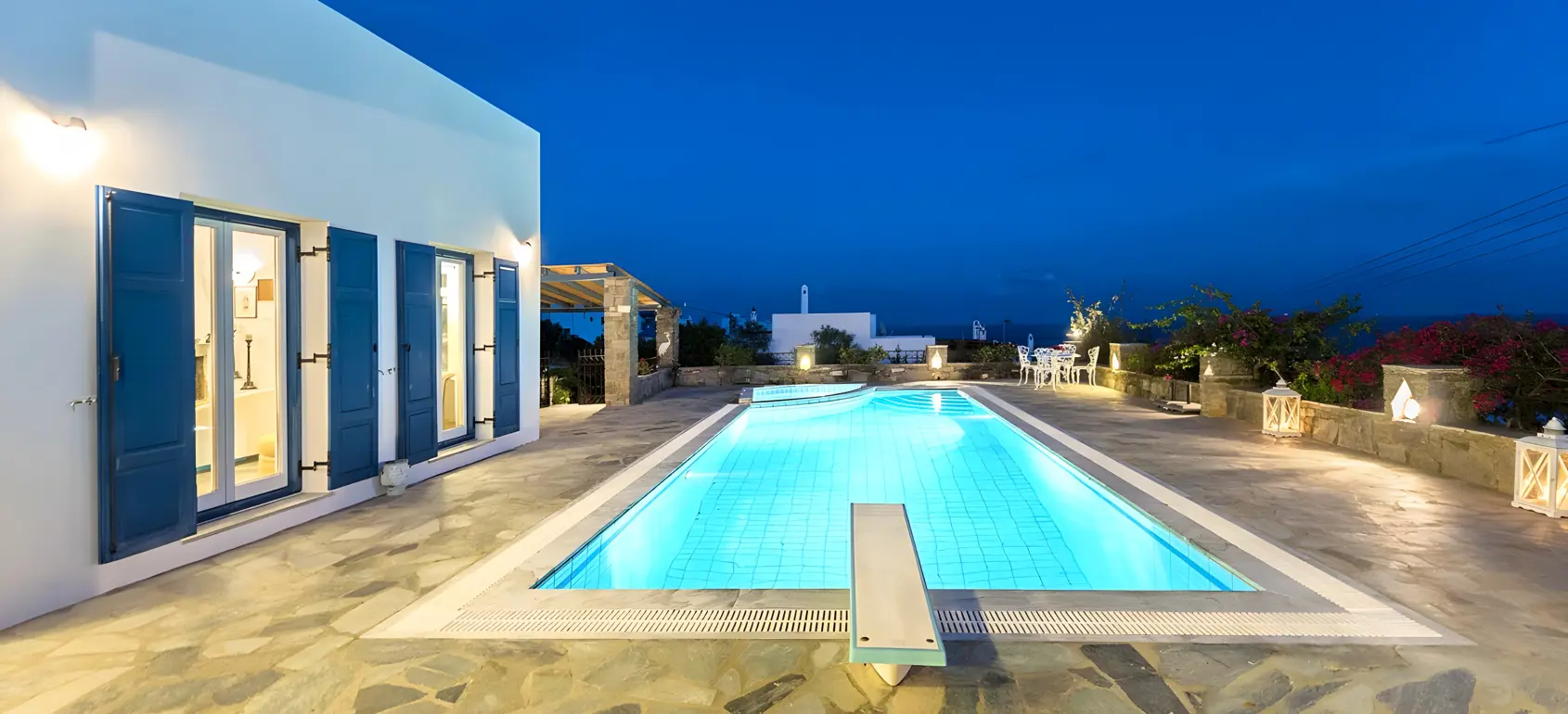 Set in the quiet village of Aspro Chorio on the southern coast of Paros, this modernised Cycladic villa occupies a private 1,000 m² plot and extends to 385 m². The accommodation includes seven en-suite bedrooms with marble bathrooms, a bright living room with fireplace and a fully fitted kitchen. Designed for easy island living, the home blends simple interiors with spacious outdoor areas, including a 70 m² private pool with Jacuzzi, shaded dining terrace and BBQ zone.