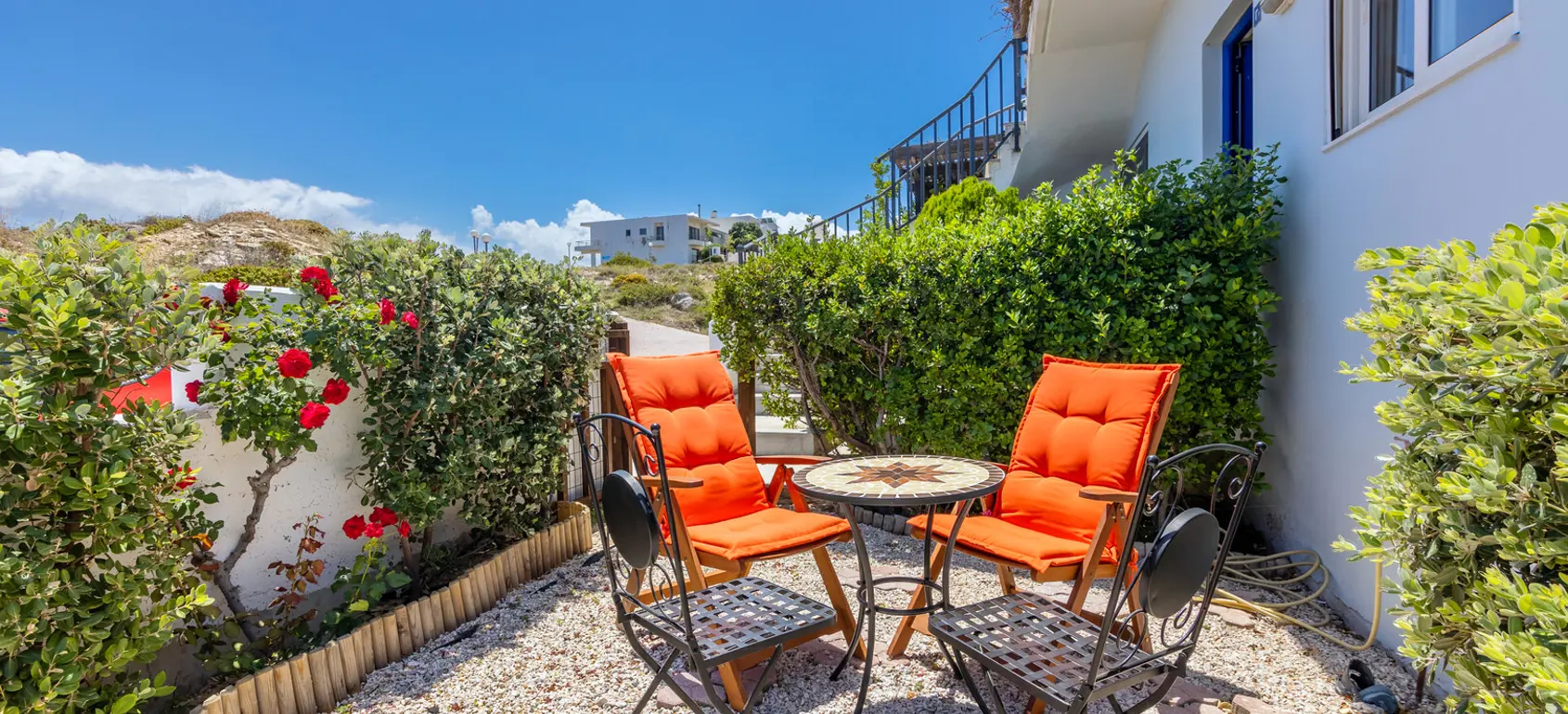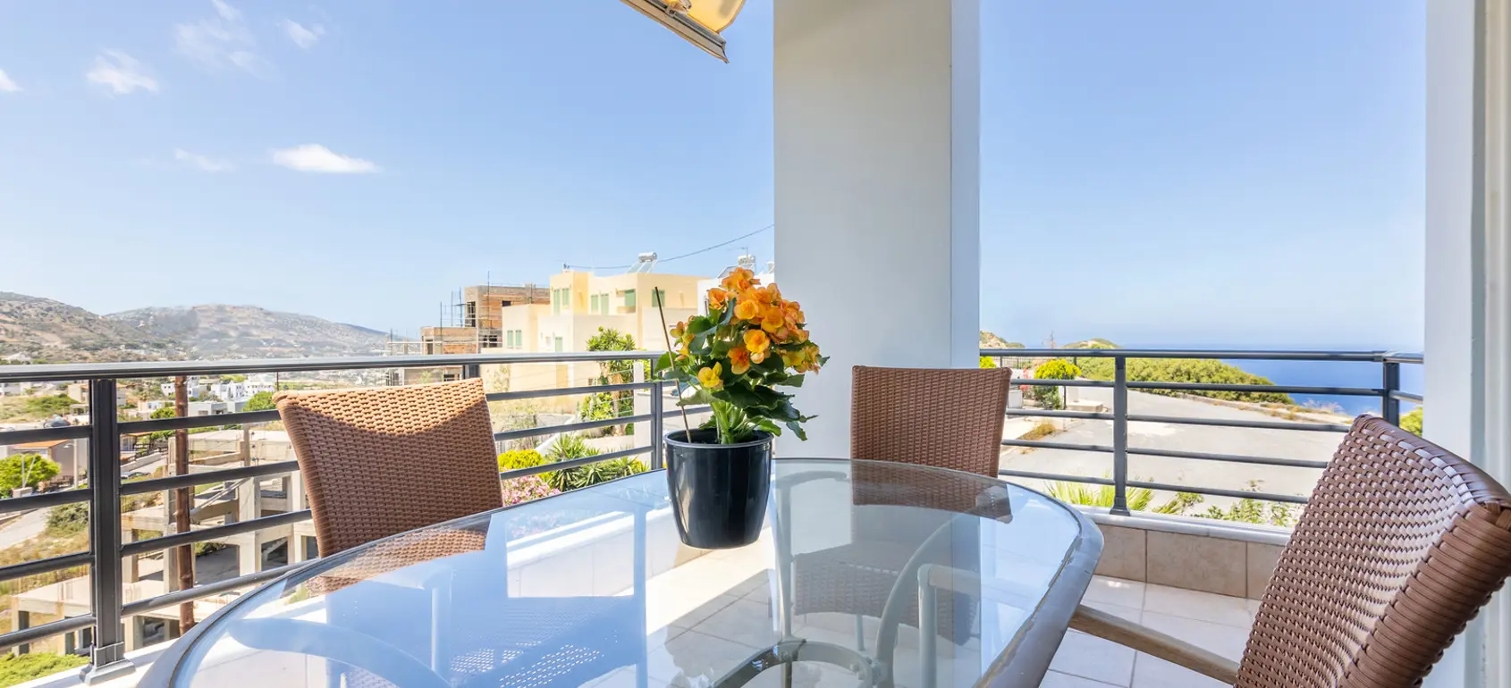 The home features two bedrooms, one bathroom, and an open-plan living area with a fully equipped modern kitchen. A spacious corner veranda faces northwest and east, capturing views of the Cretan Sea and Ligaria Bay.