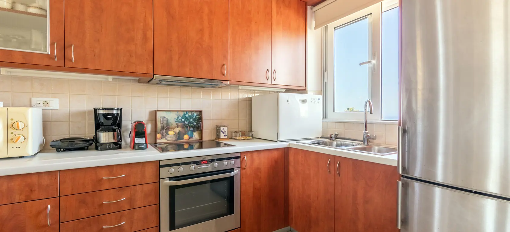 This beautifully maintained 80 m² raised ground-floor apartment lies within the sought-after seaside complex “Theseas,” just 500 m from Ligaria Beach.
