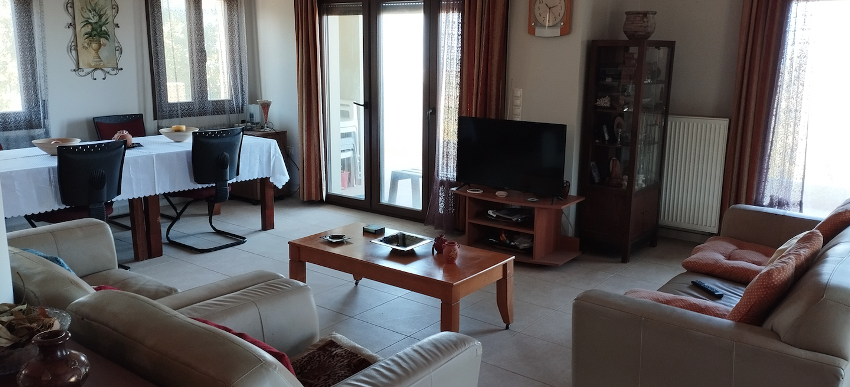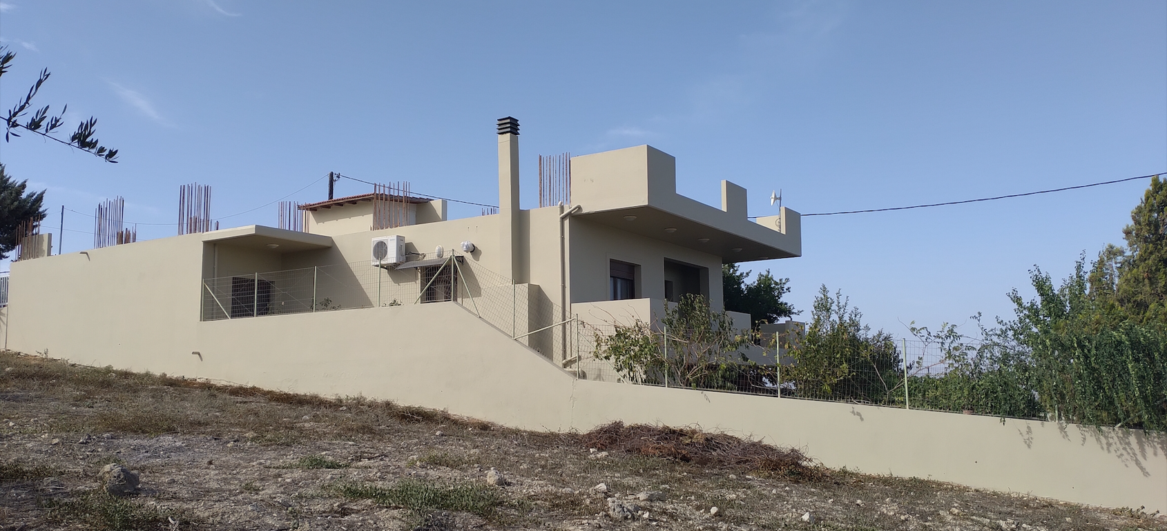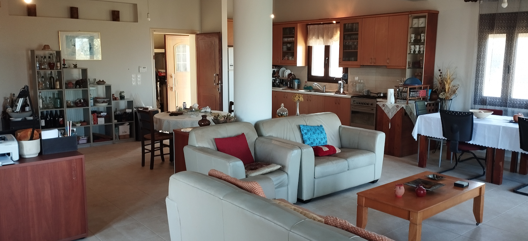 This spacious detached house sits on a 515 m² fenced plot in the tranquil suburb of Agios Vlasios, just outside Heraklion. Surrounded by nature with no immediate neighbours, the home offers privacy, panoramic views, and a calm atmosphere.