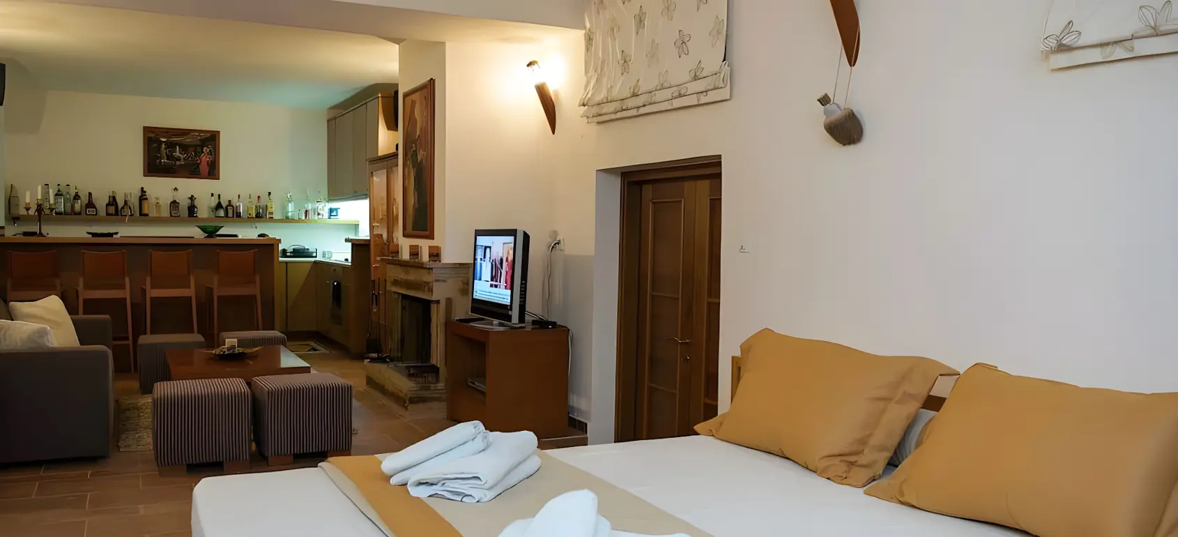 Set within a 5,000 m² private estate, this villa offers 280 m² of well-planned living space across two levels, combining comfort, privacy, and proximity to Sitia. The ground level features an open-plan living and dining area with fireplace, a fully equipped kitchen, two bedrooms, and two bathrooms. Large terraces frame the main living spaces, creating a seamless indoor–outdoor experience.