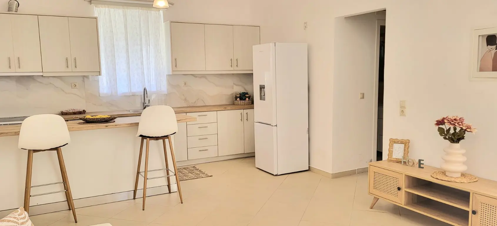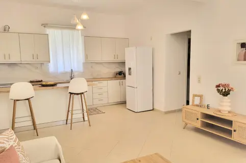 Originally built in 1955 and fully renovated in 2025, this restored stone home offers 88 m² of single-level living on a 220 m² plot in the quiet village of Kastelli near Moires. The interior includes an open-plan living and dining area, a modern kitchen with energy-efficient appliances, two bright bedrooms, and a contemporary bathroom. Traditional stone walls, aluminium frames, double glazing, shutters, insect screens, air conditioning, and solar water heating ensure year-round comfort.