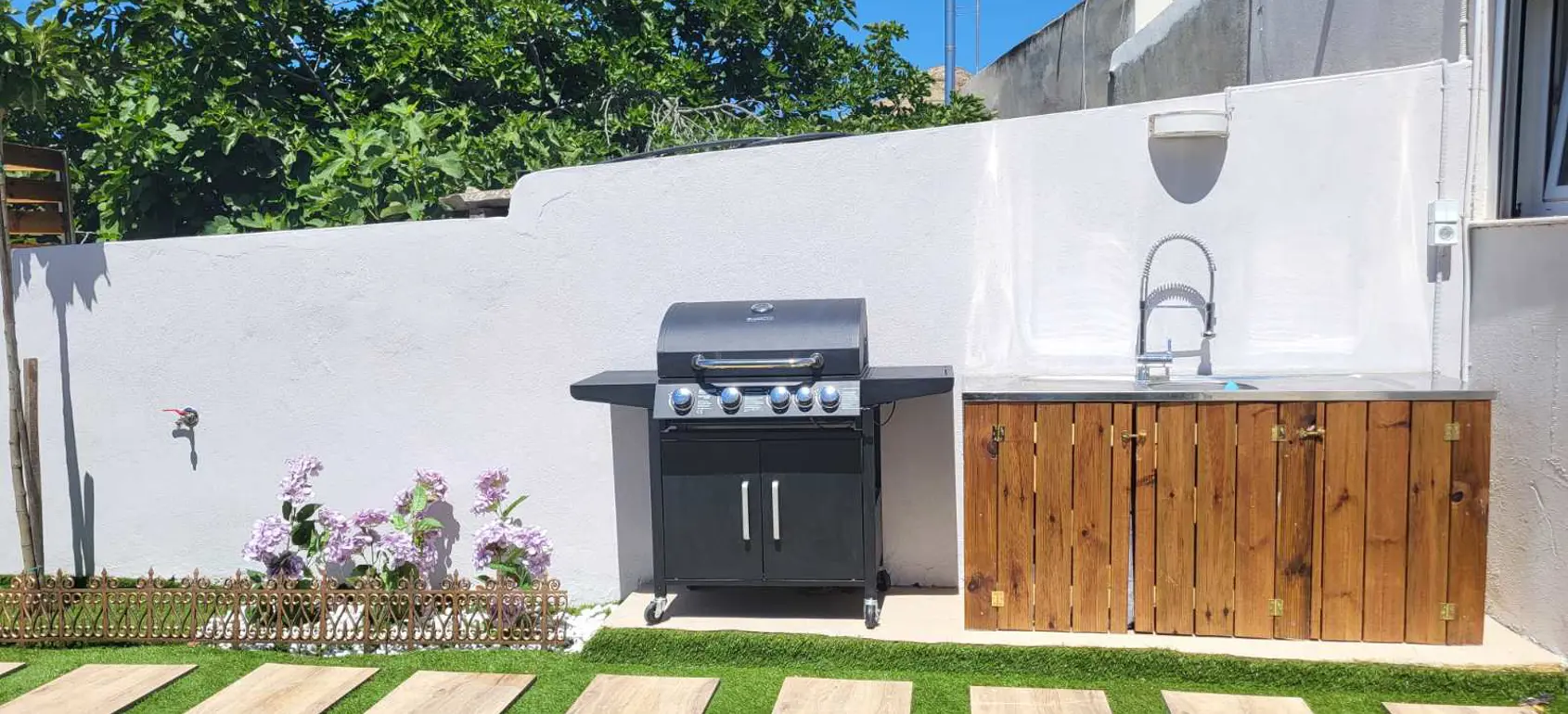 Outdoor areas feature a private pool, sunny terrace, BBQ with stone outdoor kitchen, and a grassy garden designed for both relaxation and entertaining. The gated parking area provides direct access and added convenience. An optional 40 m² unrenovated stone building on a nearby 80 m² plot is available for separate purchase, offering potential for a guesthouse or rental unit.