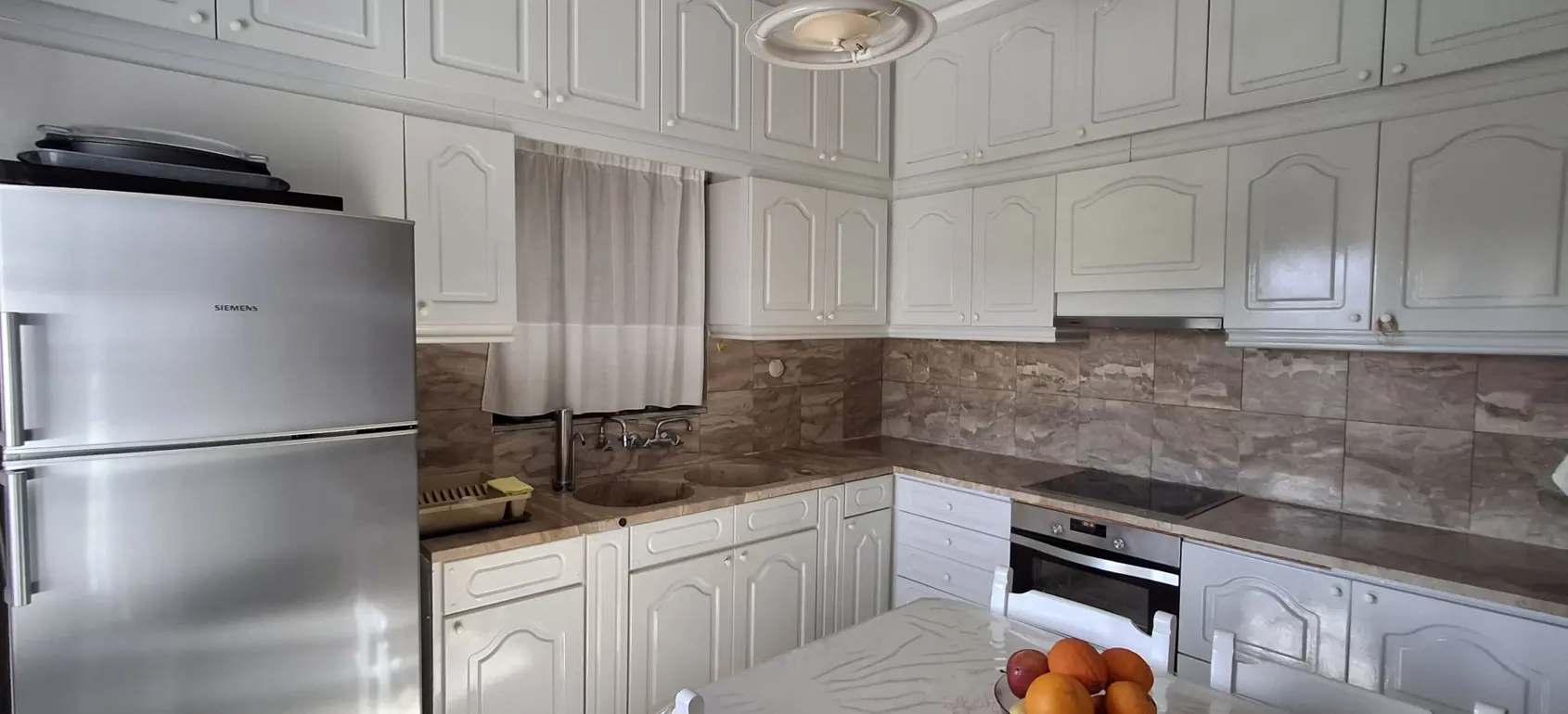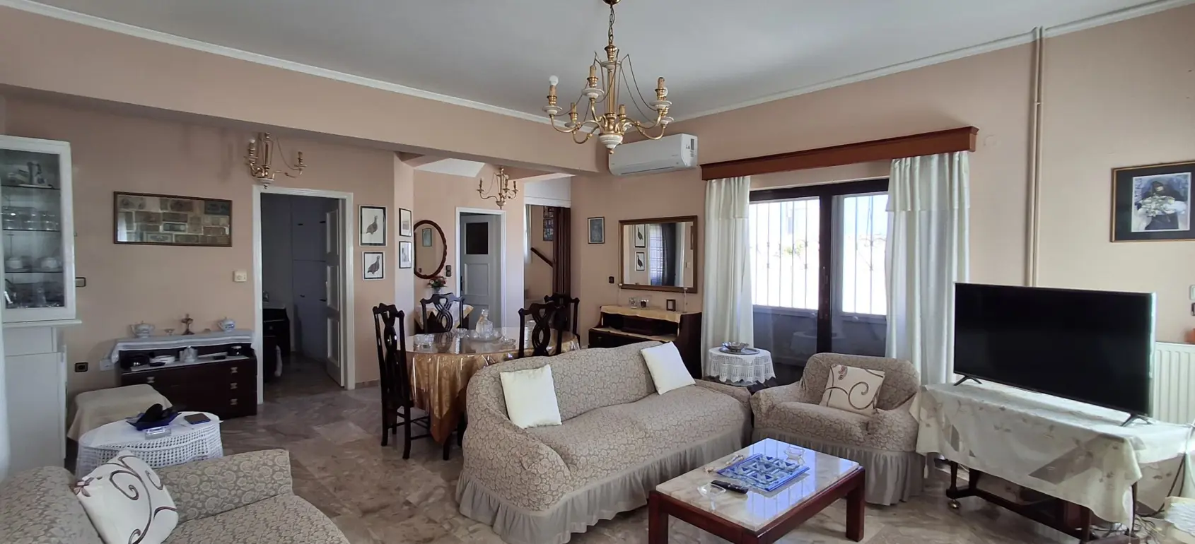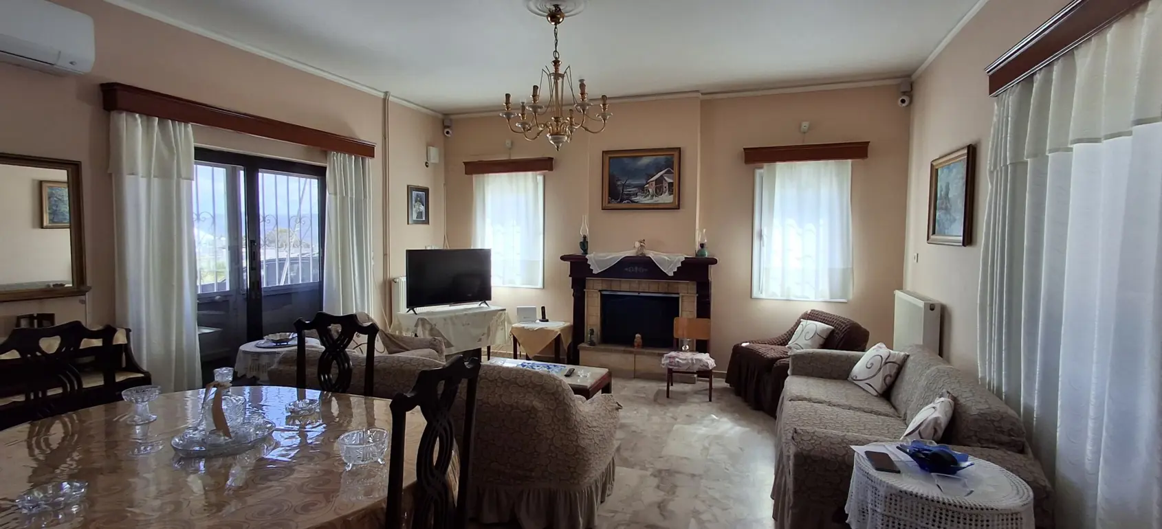 The 206 m² maisonette comprises a main residence and two separate studios. The ground floor includes a spacious living room with marble flooring and fireplace, kitchen, bathroom and one bedroom, while an internal staircase leads to three further bedrooms and a large family bathroom on the upper level.