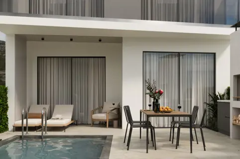 Off-plan 2-bedroom apartment with private garden and pool, 50 m from Ammoudi beach, completion mid-2027.