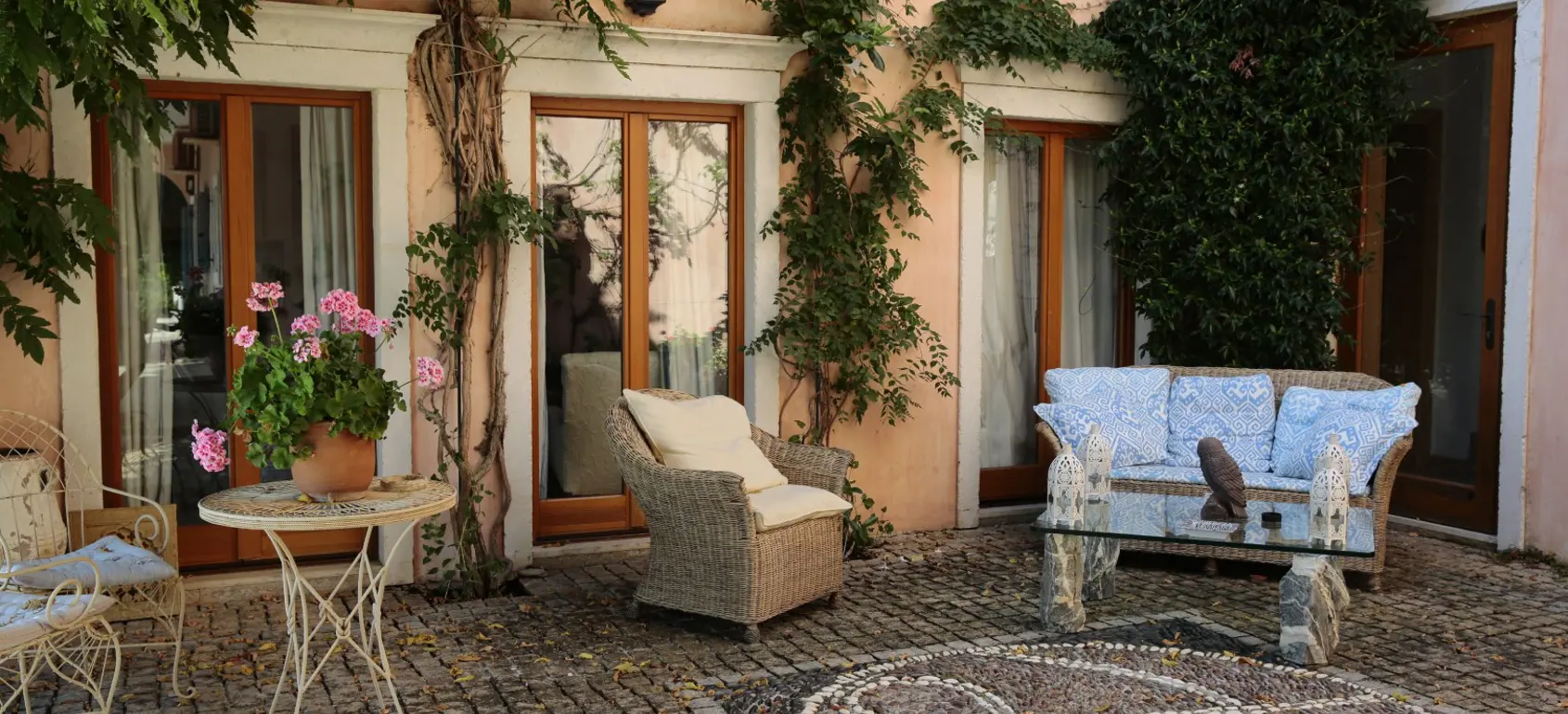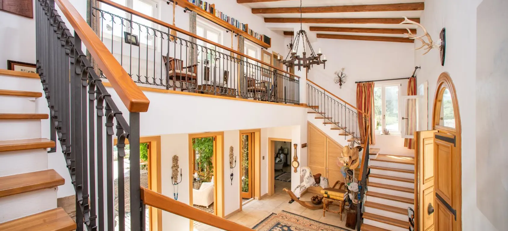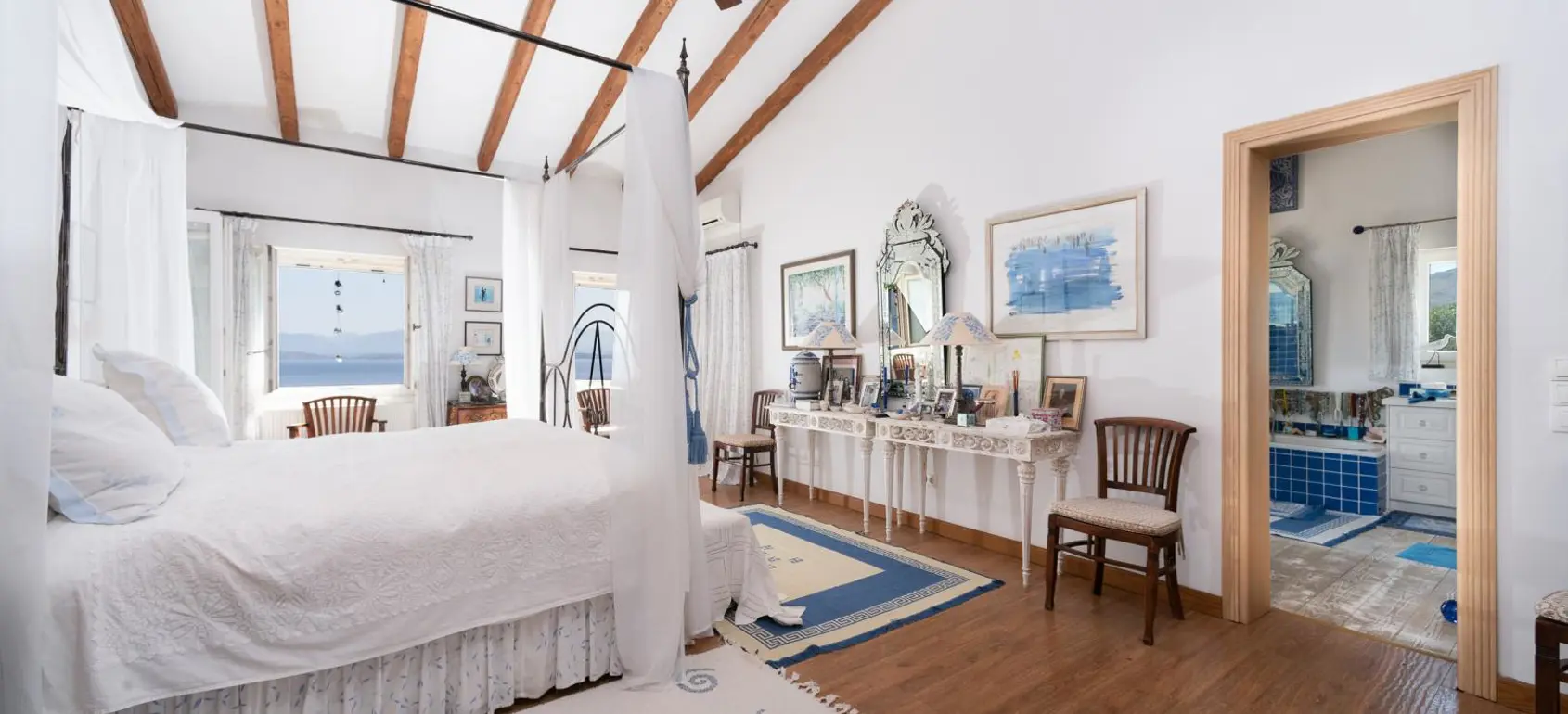 The front door opens to a beautiful, double height hallway and looks straight through to courtyard to the sea beyond. Here the spaces are the spacious sitting room with large stone fireplace, a large kitchen and spectacular dining area, a cloakroom, two large bedrooms with ensuite bathrooms. Two staircases climb from hallway to long book cased gallery above, which leads to n ensuite bedroom. On the other side, the gallery leads to a large study with fireplace and master ensuite bedroom. Two more bedrooms are located in the auxiliary buildings around the main house.