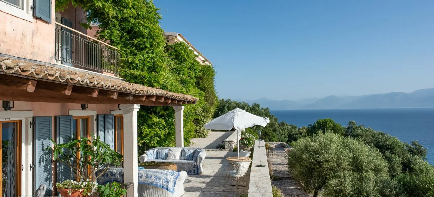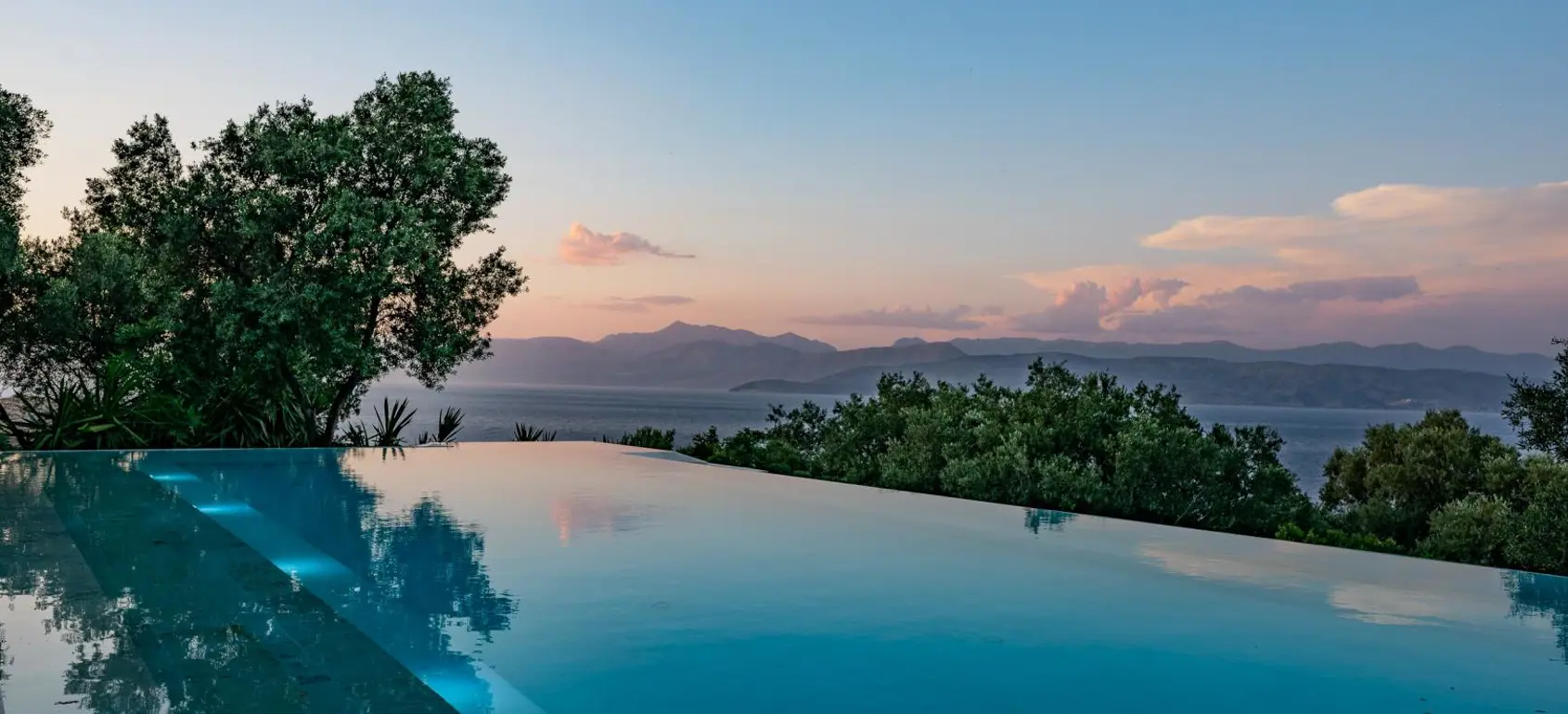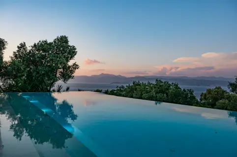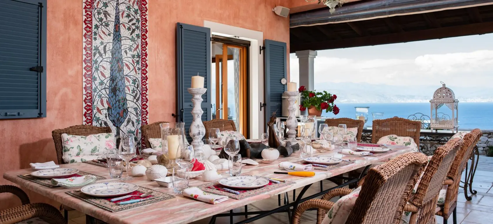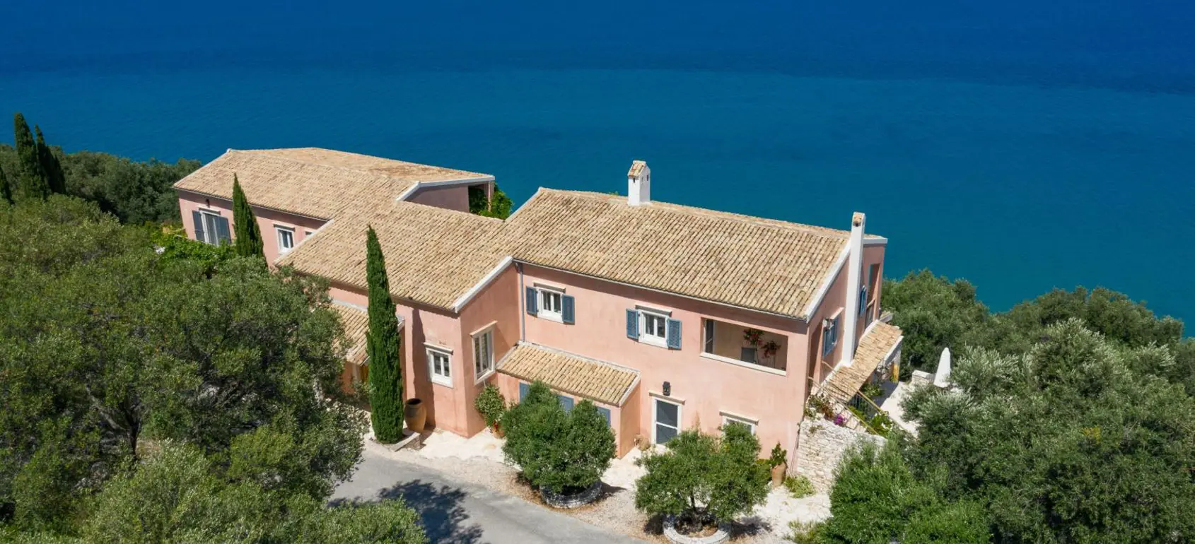 The villa stands on the northern corner of Corfu. Walled and secure, it is only a few minutes’ drive from the renowned and lively resorts of Kassiopi and Agios Stefanos. Surrounded by olive groves, all the rooms and many terraces overlook the sparkling waters of the Ionian Sea. Italian like style pervades the villa. There are extensive areas for entertaining and a spectacular dining area that adapts both to cool evenings and warm summer days. A glorious Mediterranean garden leads to the large and dazzling infinity swimming pool with its own terrace, separate dining area and pool house. On a small hill above the garden is a sunset terrace that overlooks the whole island.