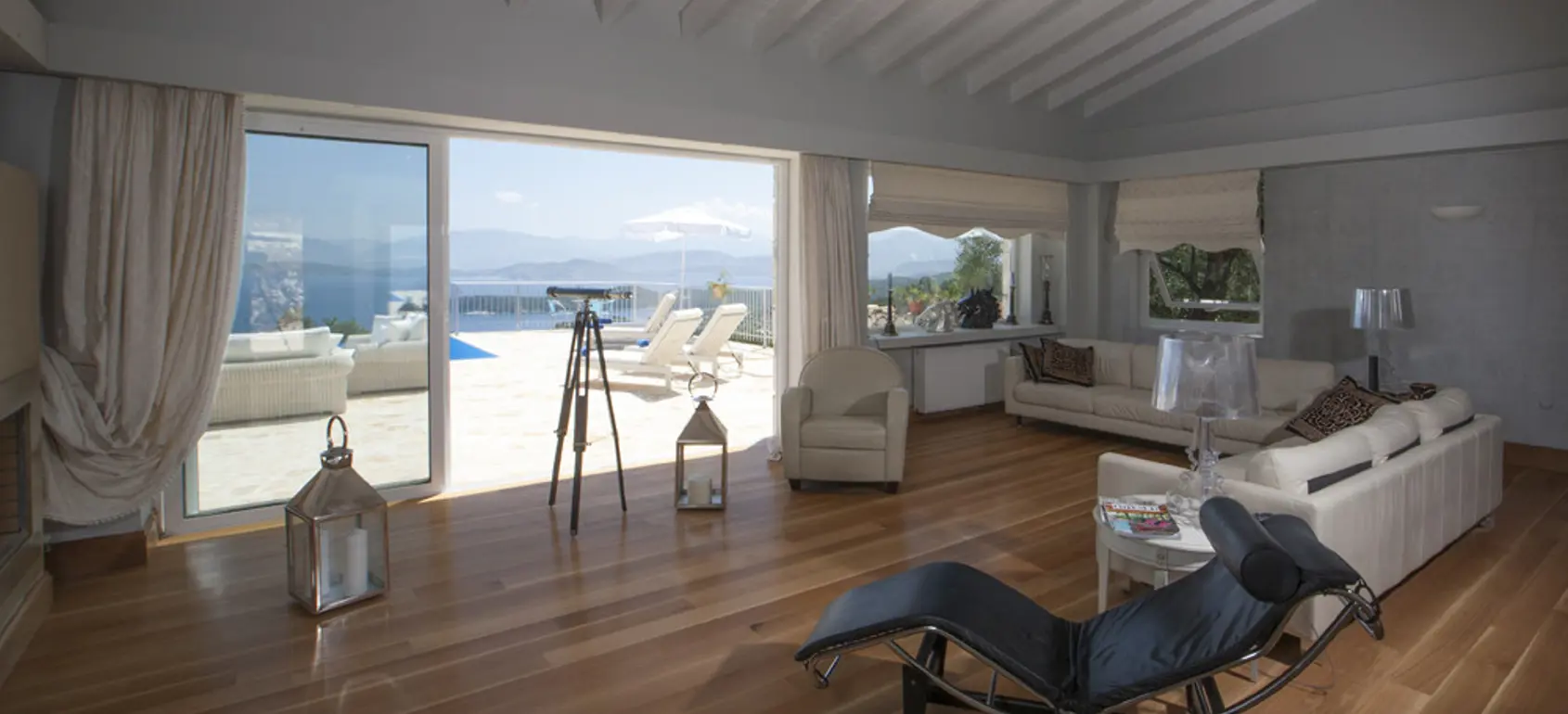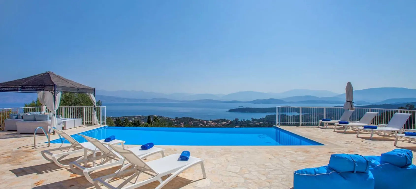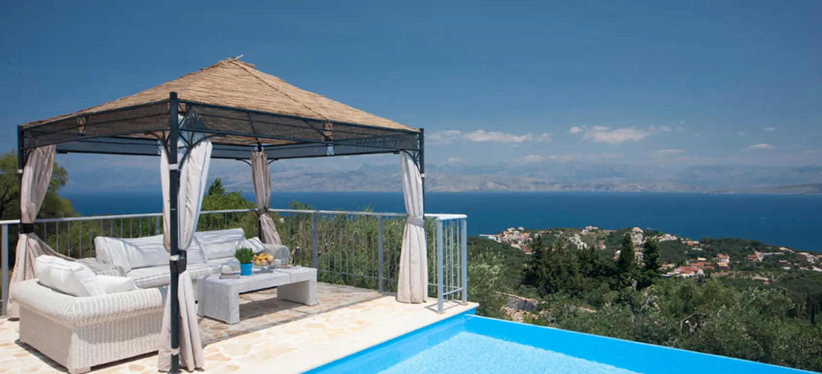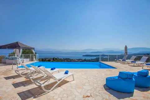 Set on a sloping plot full of greenery, this expansive four-bedroom villa overlooks Kassiopi area.