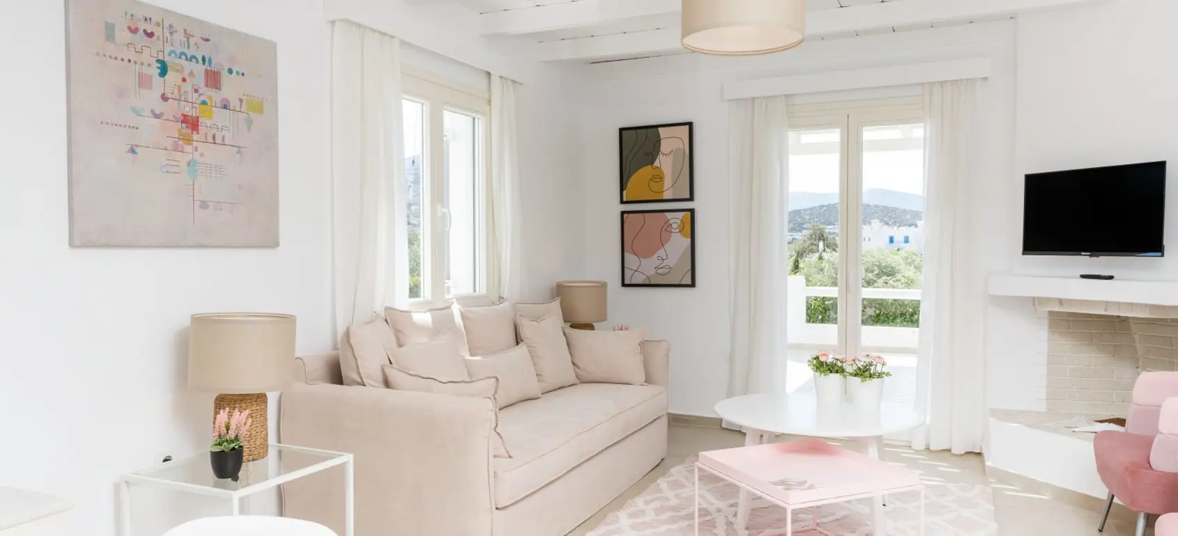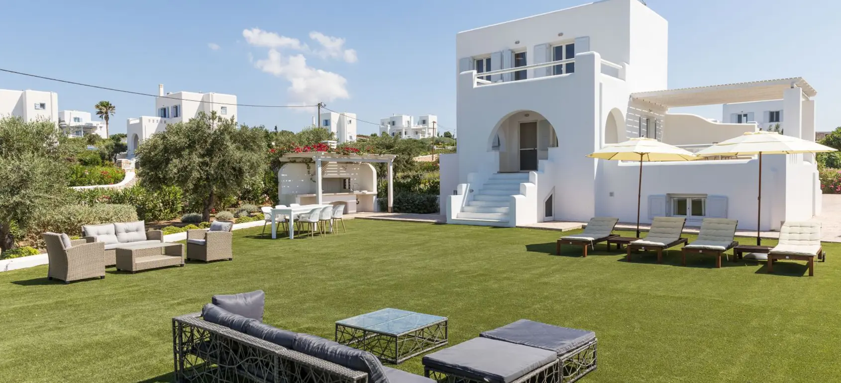 From the outdoor areas one can enjoy panoramic sea views, while its garden and private pool secures happy friends and family summer days.