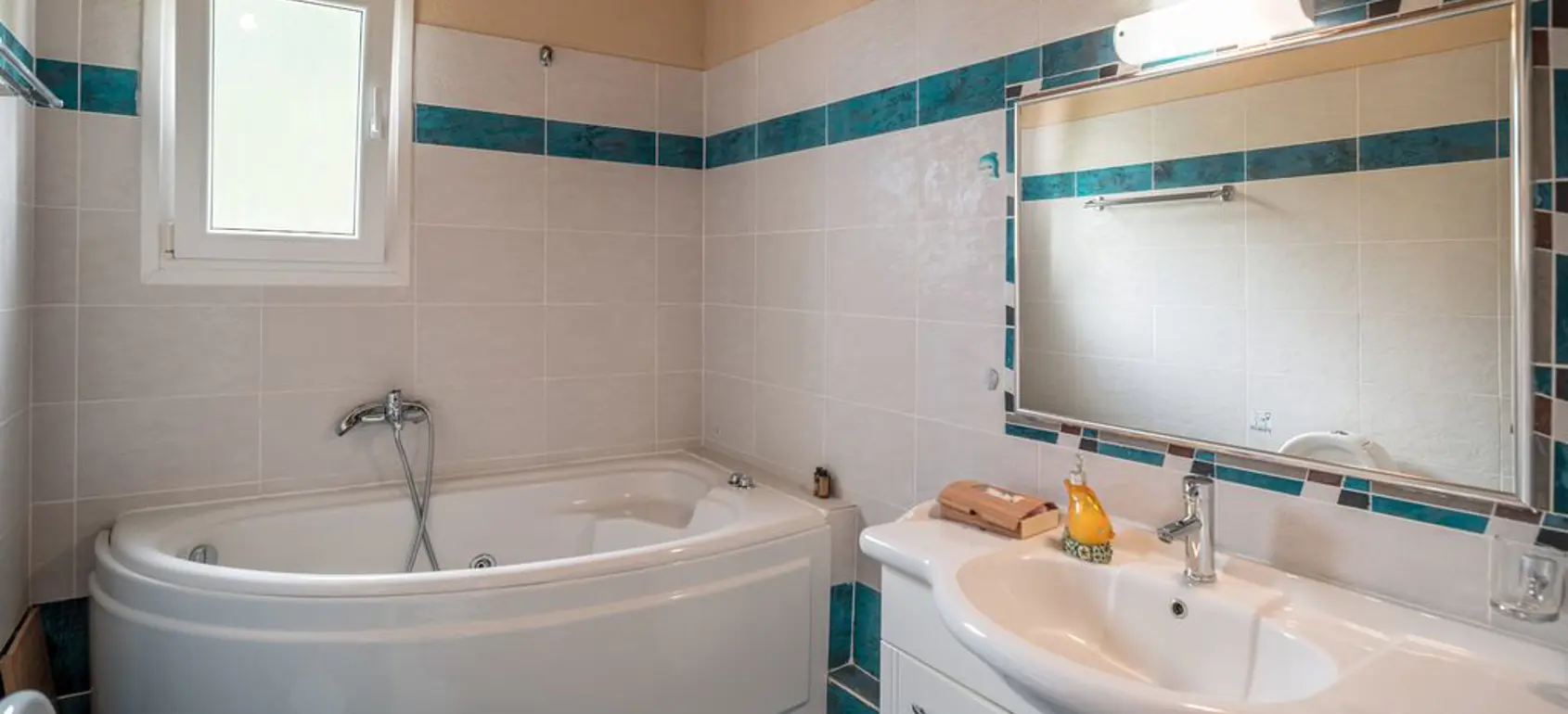 The villa is surrounded by a charming big garden, right on the long sandy beach on the north coast of the island. The garden is superbly maintained and the pool also has a private Jacuzzi.