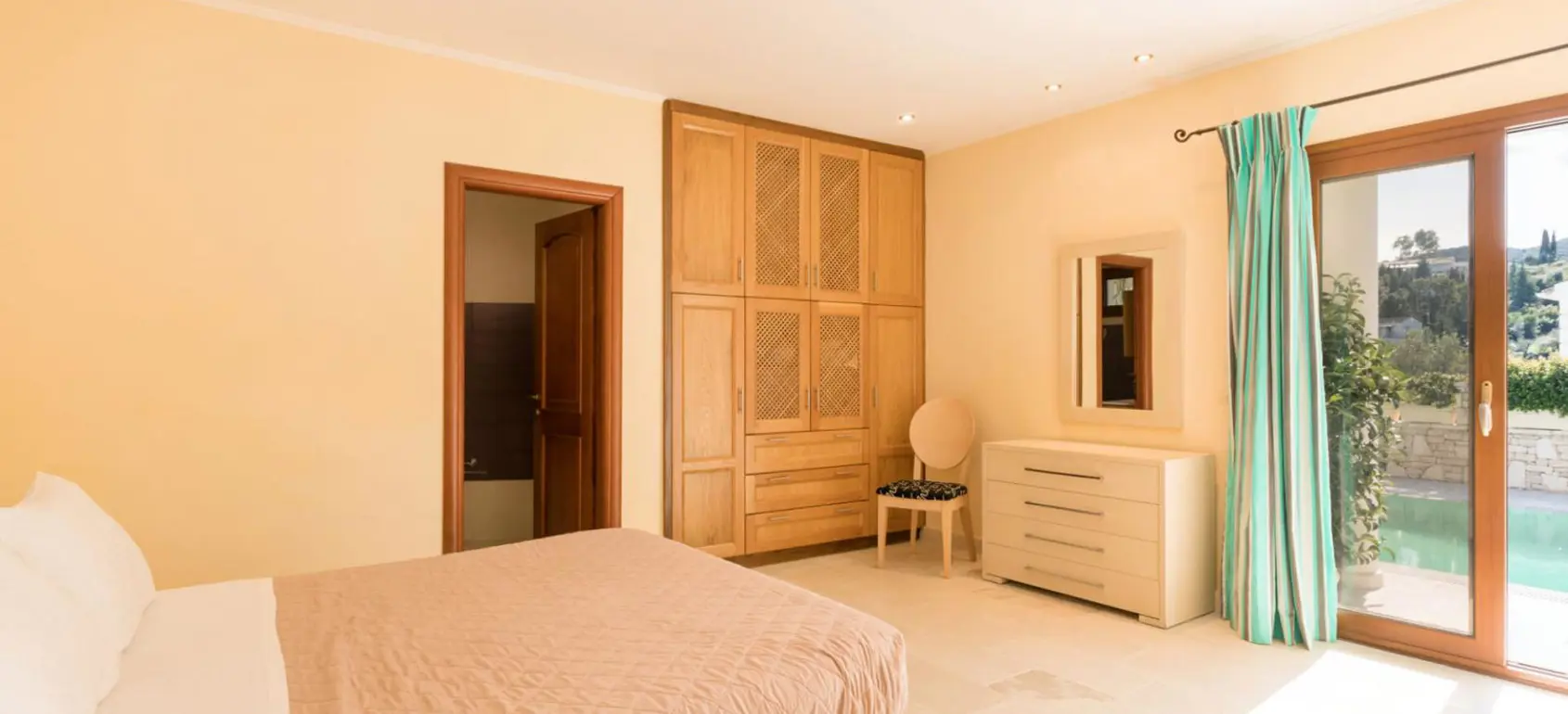 The main living area is filled with natural light and flows right into the kitchen and dining area with plenty of space for entertaining guests. All bedrooms are remarkably spacious and airy, while the first floor is occupied by the master bedroom with big verandas providing views of the sea and the surrounding area. In the lower level the rest of the bedrooms have openings to the pool terrace. Furnishings are simple but comfortable, with an emphasis on outdoor living including the large swimming pool. We also love the pergola and barbeque area which is a great spot for dining alfresco.