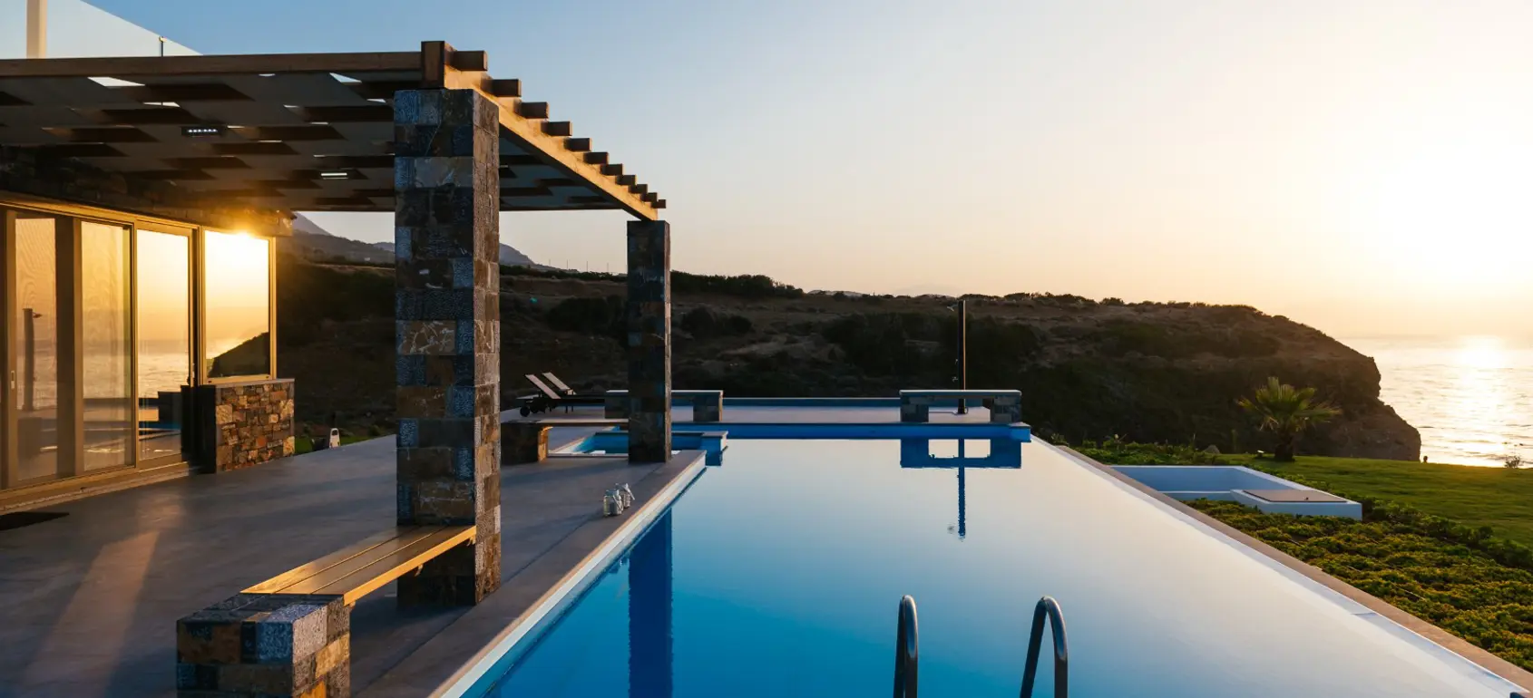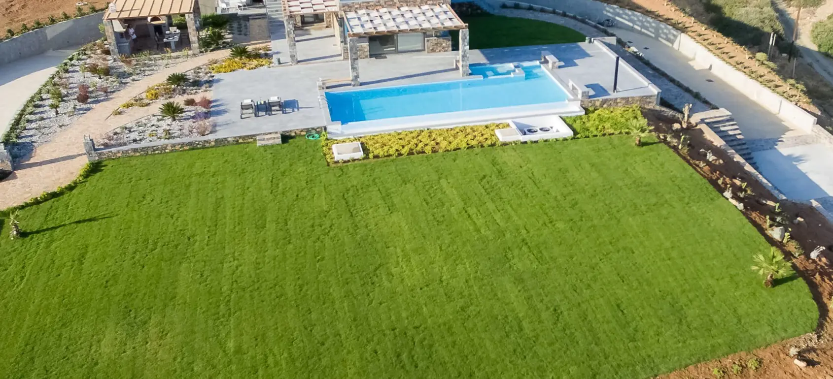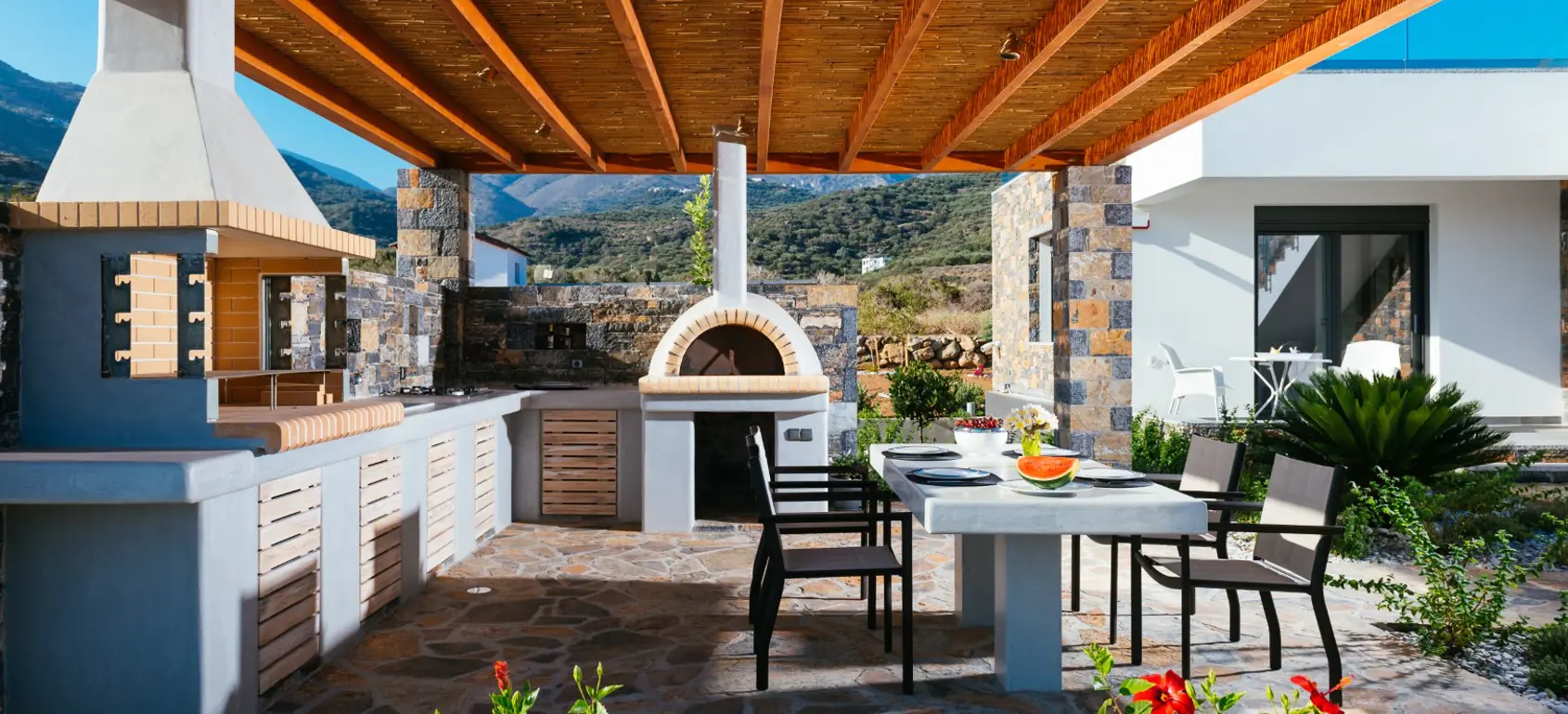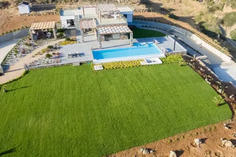 The 13.5x5.5m infinity pool is surrounded by plenty of space for sun beds and loungers. Outside there is also a bbq/kitchen area with a big dining table, while the house is surrounded by a grass area.