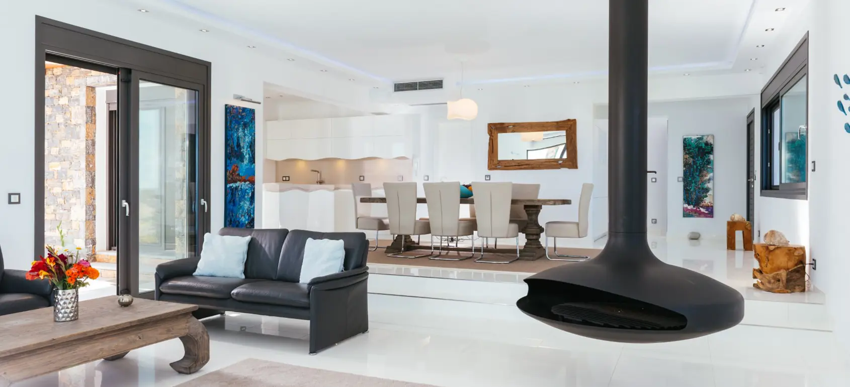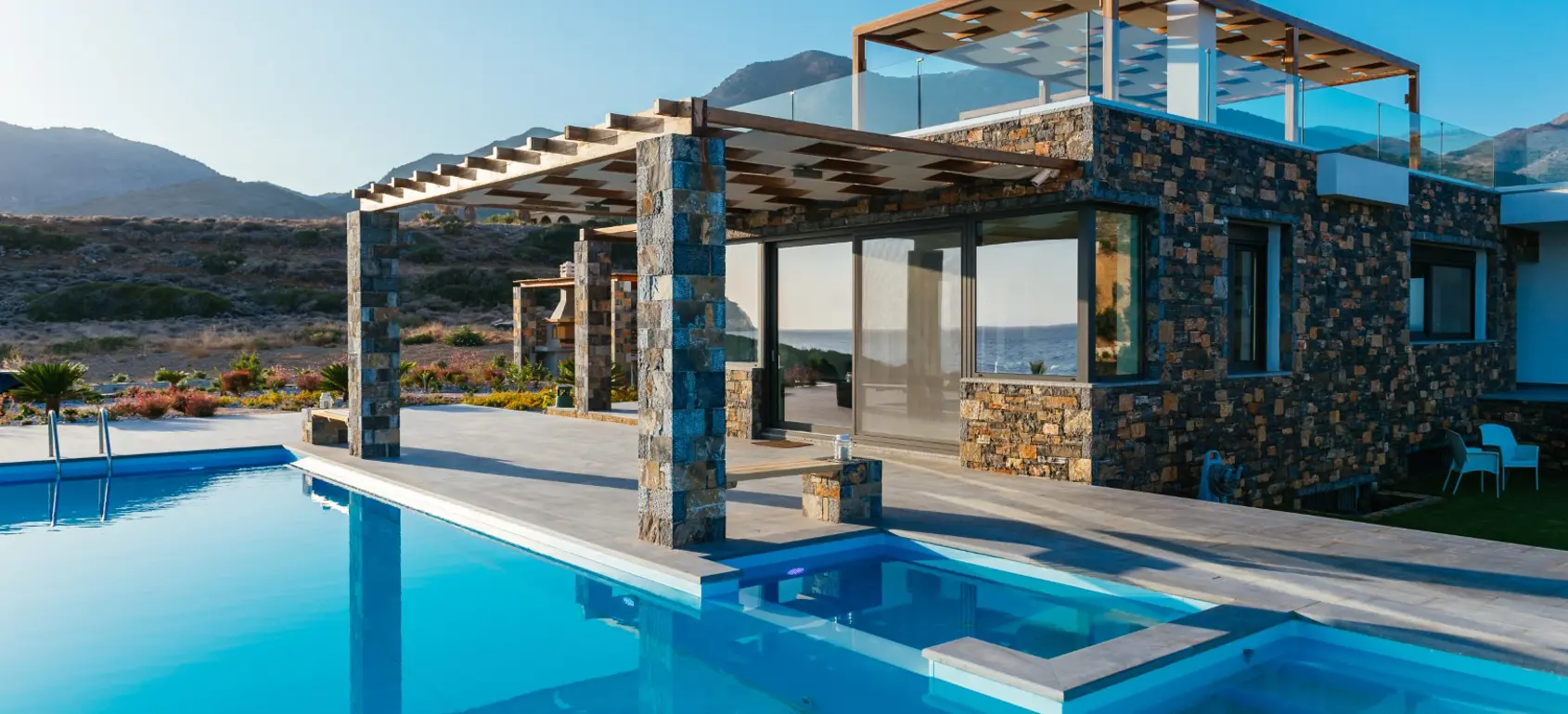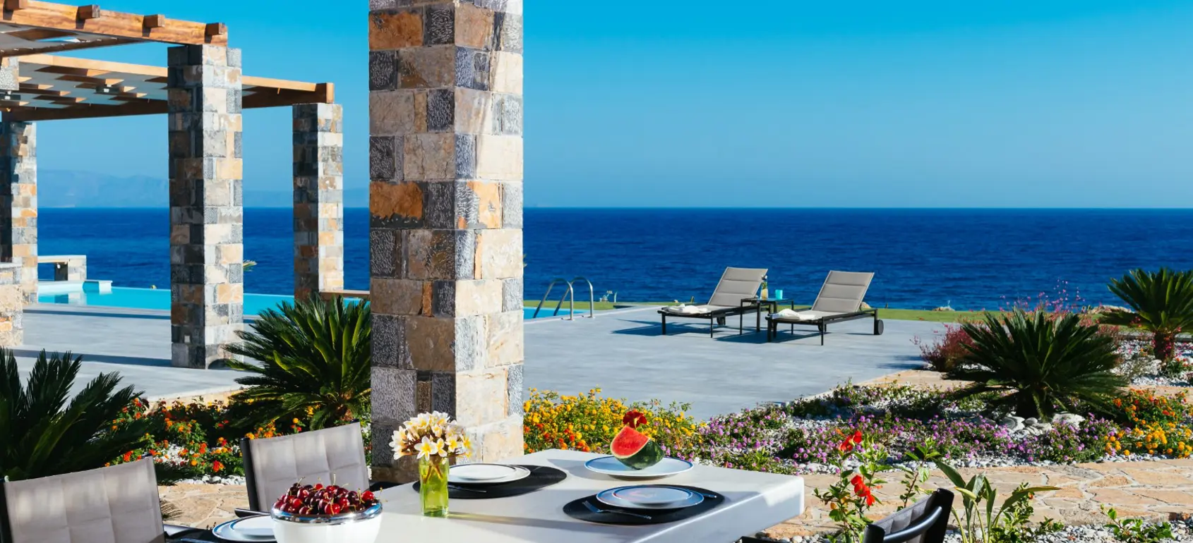 The 13.5x5.5m infinity pool is surrounded by plenty of space for sun beds and loungers. Outside there is also a bbq/kitchen area with a big dining table, while the house is surrounded by a grass area.