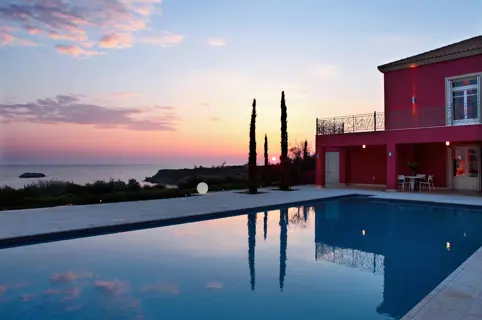 Perched dramatically on the edge of a rocky cliff, this villa commands breathtaking views of the endless blue horizon and the picturesque coastline of the Ionian Sea. Nestled within a vibrant garden adorned with centuries-old olive trees, fragrant Mediterranean herbs, and lush plants, it offers a serene retreat that seamlessly blends natural beauty with refined luxury.