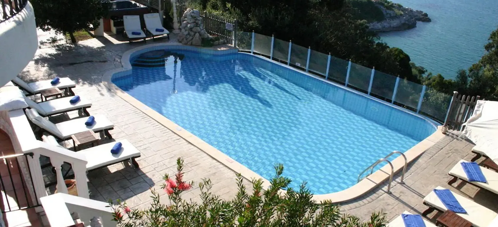 This is a villa providing an all-around sea view which turns into a sunset view in the evening. Sitting on a cliff and surrounded by beautiful gardens, is also provides a path that leads to two different isolated beaches. Outdoor amenities include a heated swimming pool and Jacuzzi, private gardens, gazebo covered bbq area, etc.
