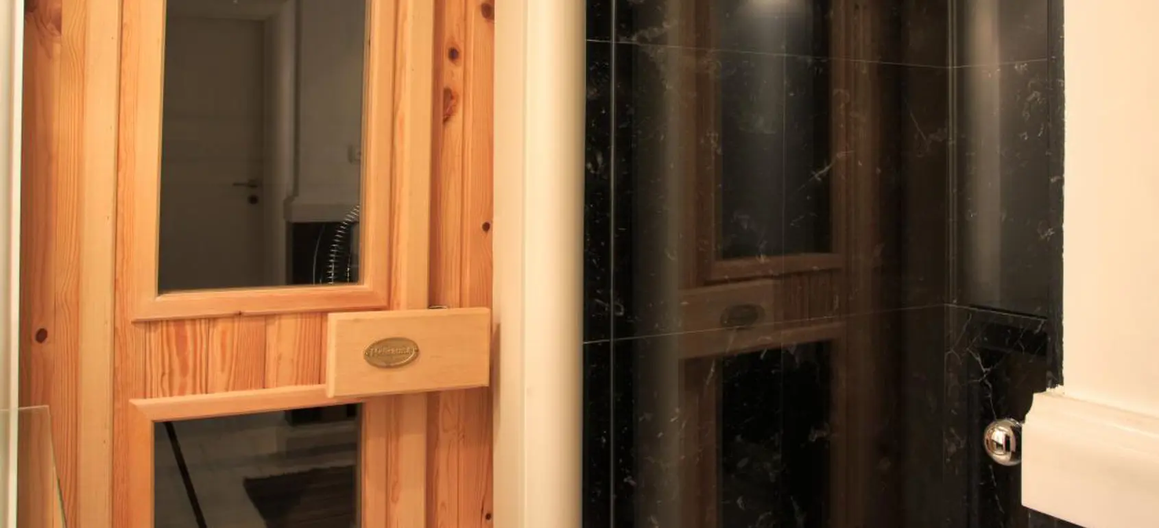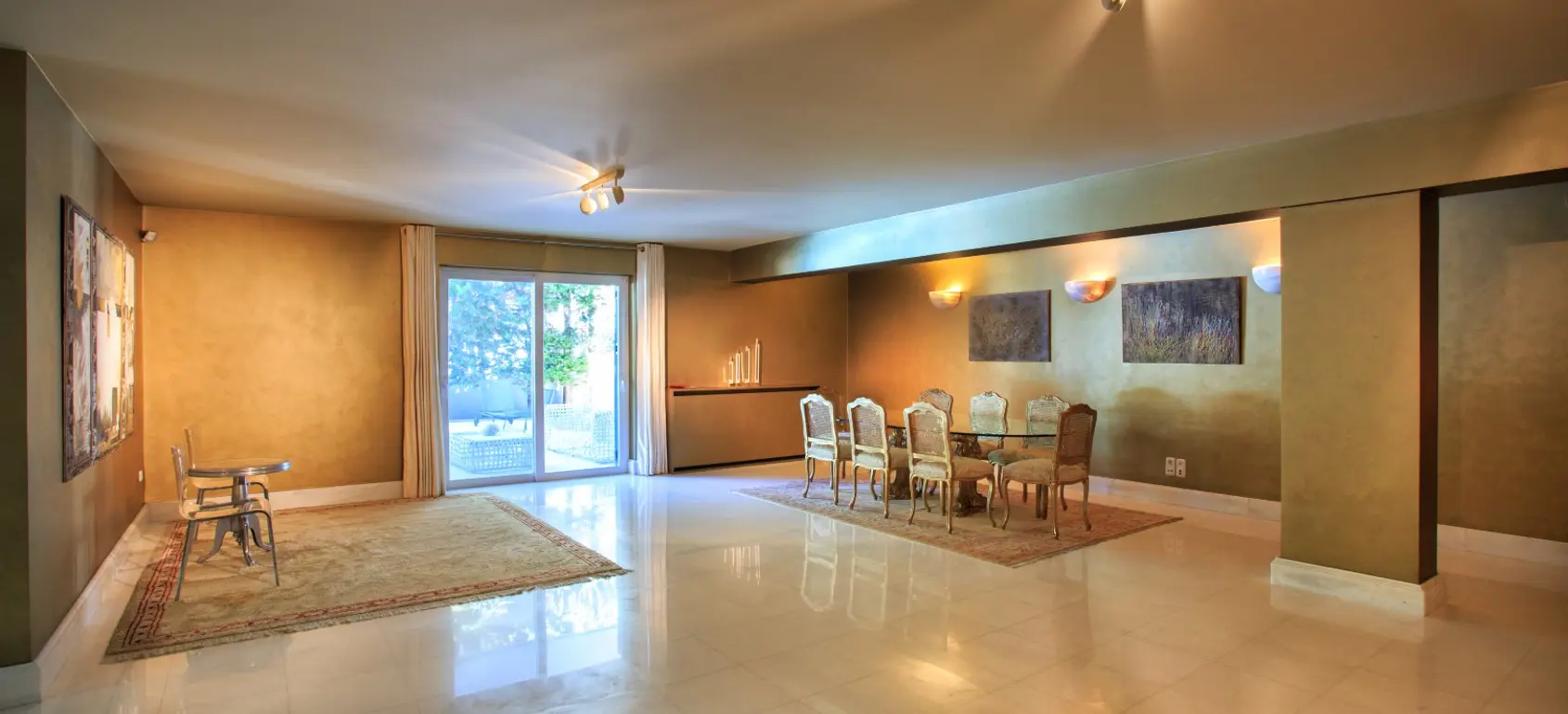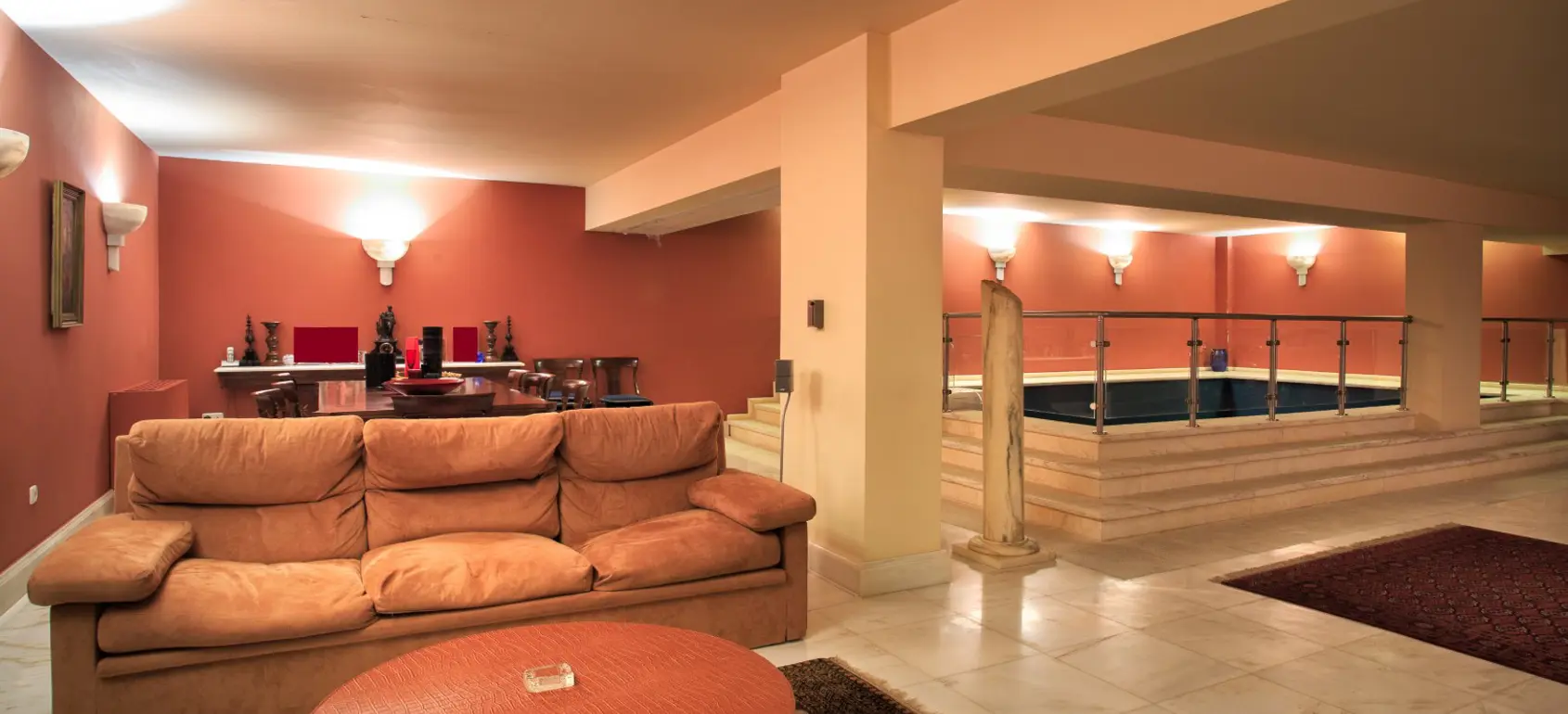 The maisonette offers unique characteristics such as the two swimming pools (a heated interior one and an outdoor) as well as sauna, while the courtyard surrounded by lush plants, offers a sense of tranquility.