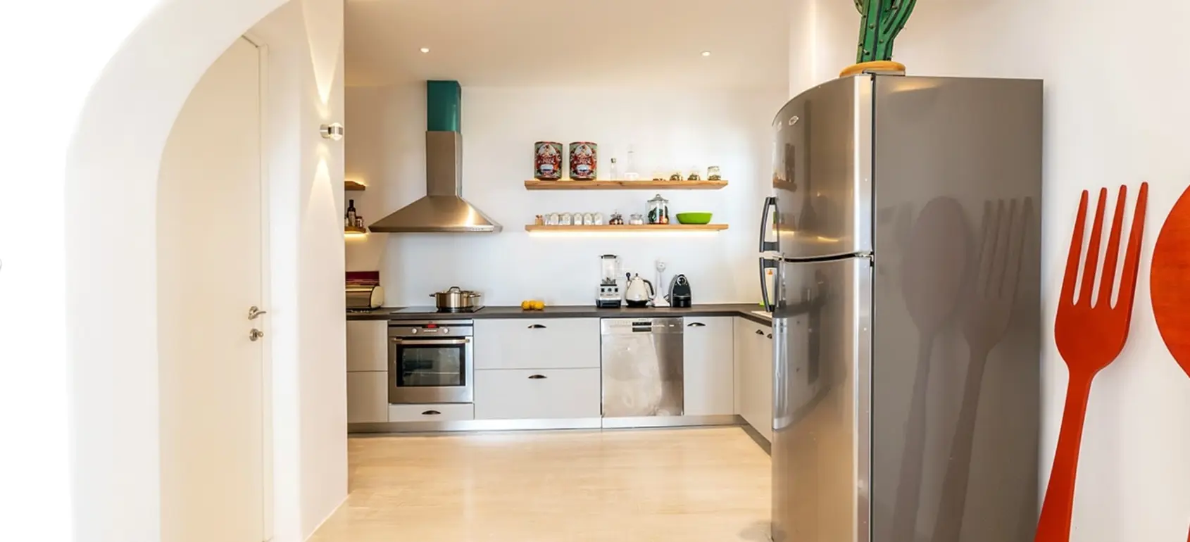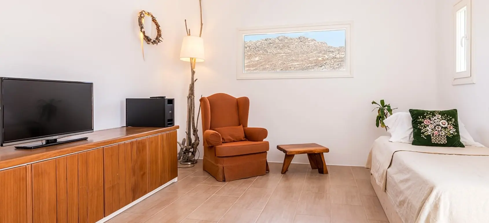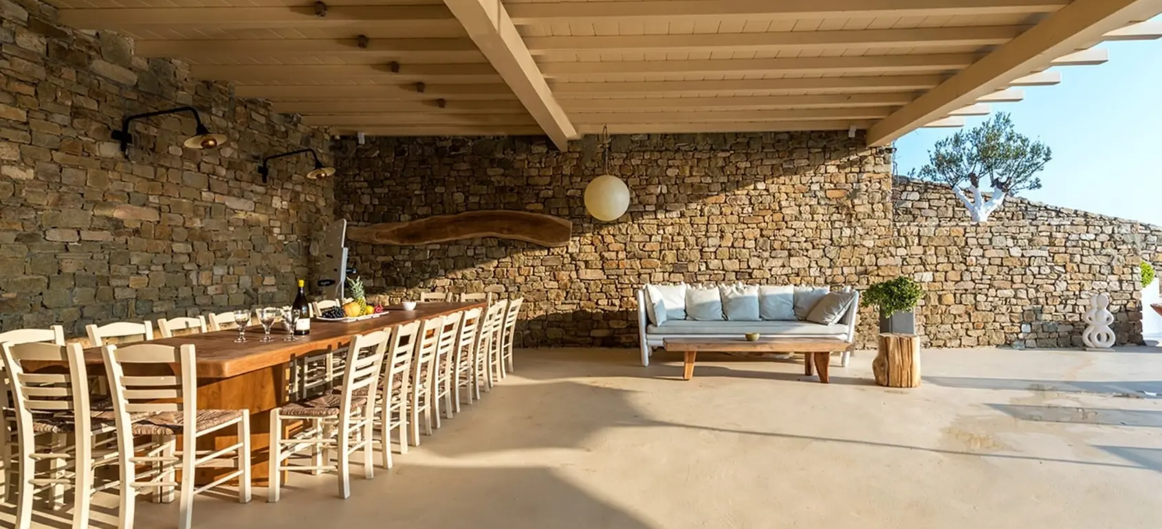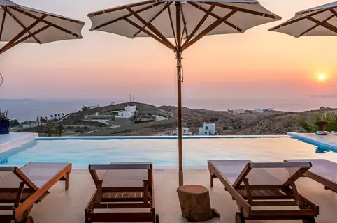 Outdoors, a glistening swimming pool and a selection of shaded and sunlit lounging areas invite relaxation, all while commanding breathtaking panoramic vistas of the iconic Cycladic islands and Aegean Sea especially through sunset time.