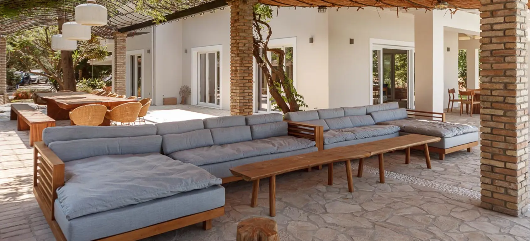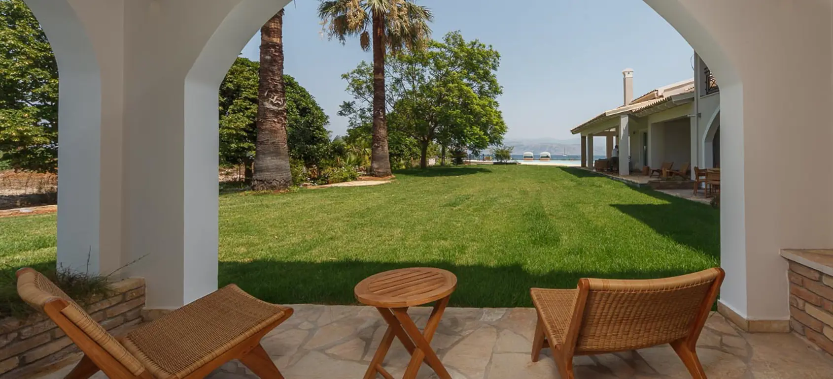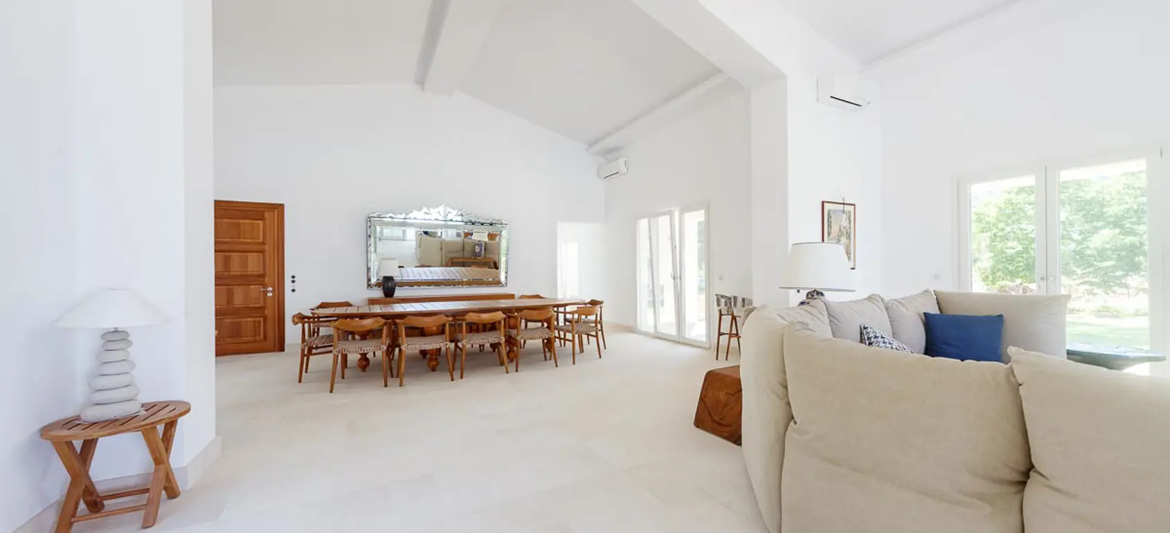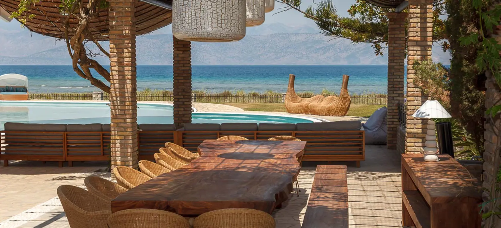 The villa’s elegant outdoors, offer a number of dining and seating options: next to the living room overlooking the pool and the sea or, under a covered terrace near the external kitchen.