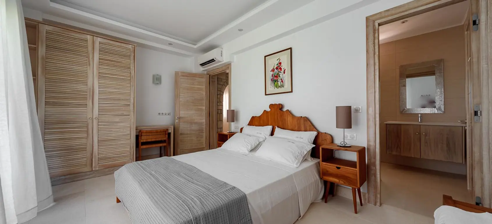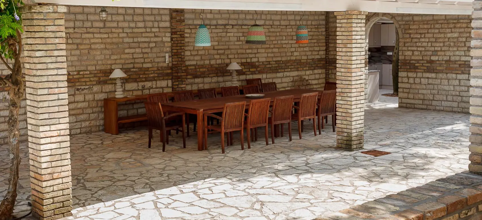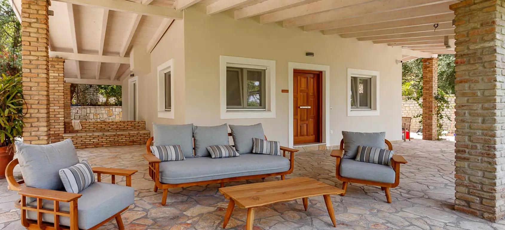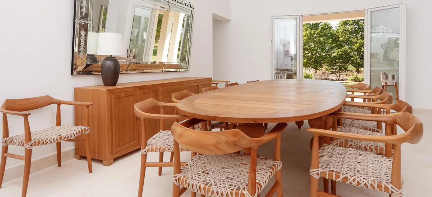 The villa’s elegant outdoors, offer a number of dining and seating options: next to the living room overlooking the pool and the sea or, under a covered terrace near the external kitchen.