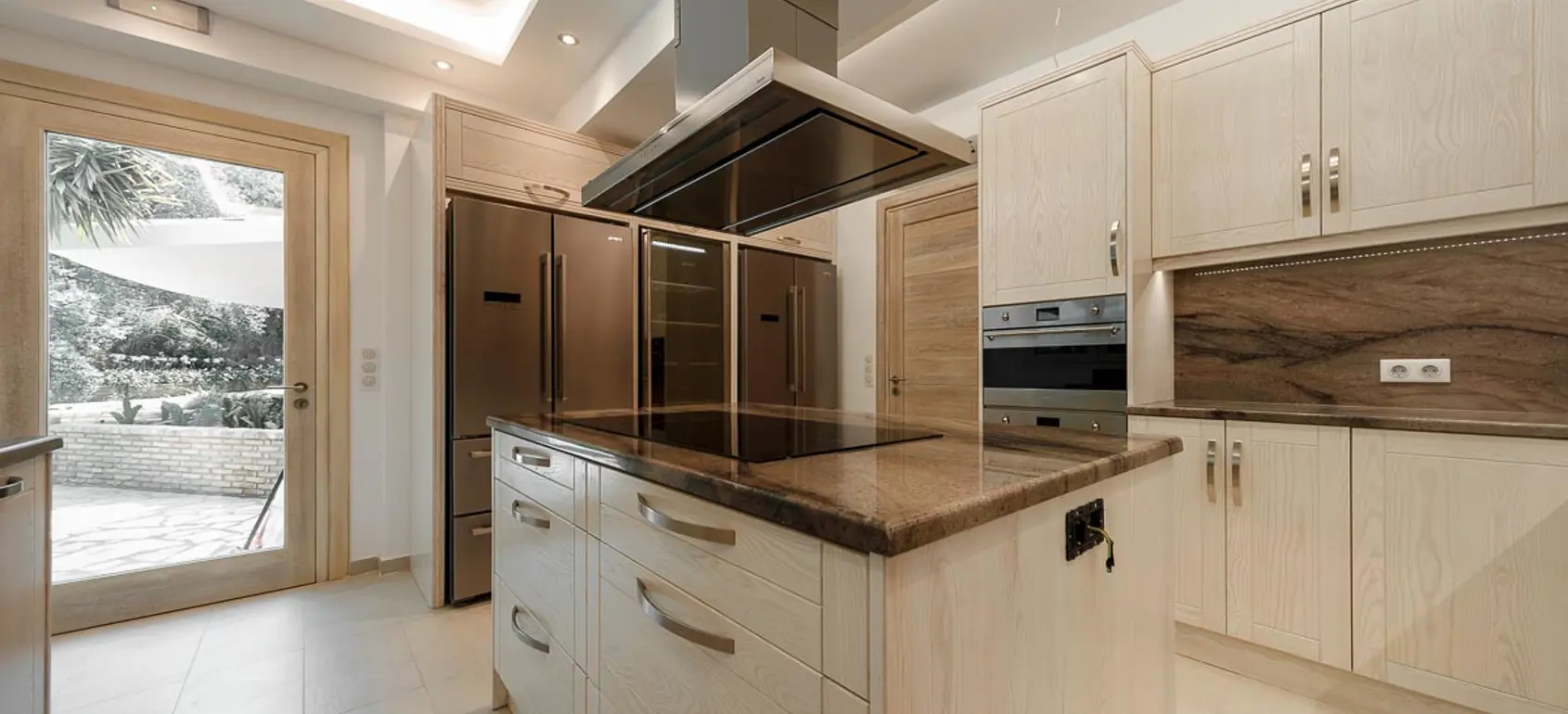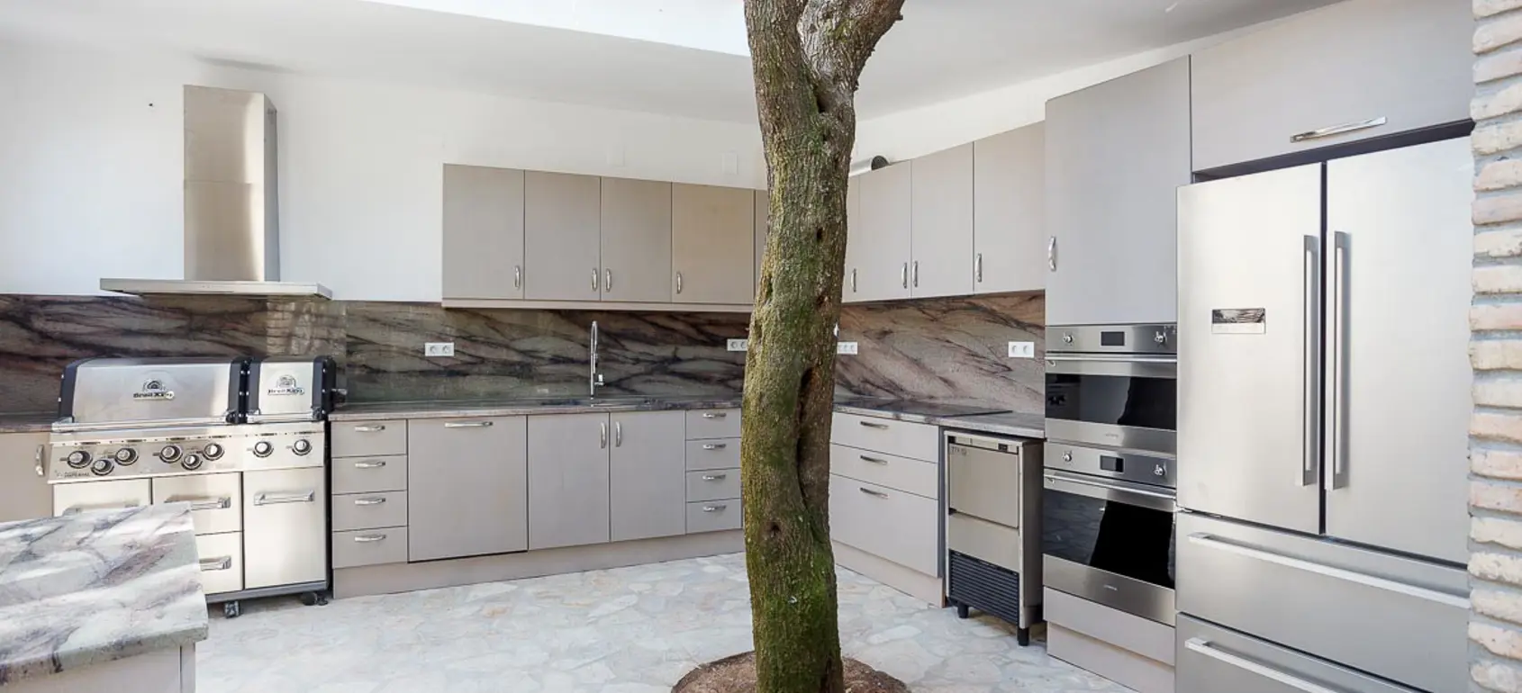 The existing villa living room is spacious, bathed in natural light. It has a direct view of the large pool, the sea and the surrounding terraces. It also features an internal and an external spacious and fully equipped kitchen.
