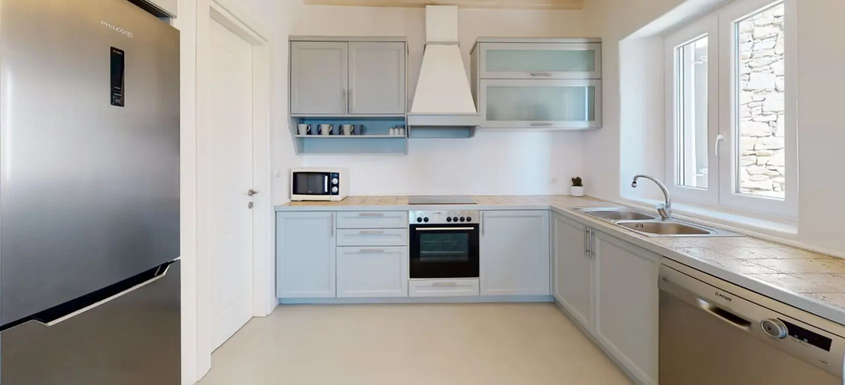 There are wonderful views from every level while from the infinity pool and the outdoor living/dining area one can enjoy panoramic Aegean Sea views.