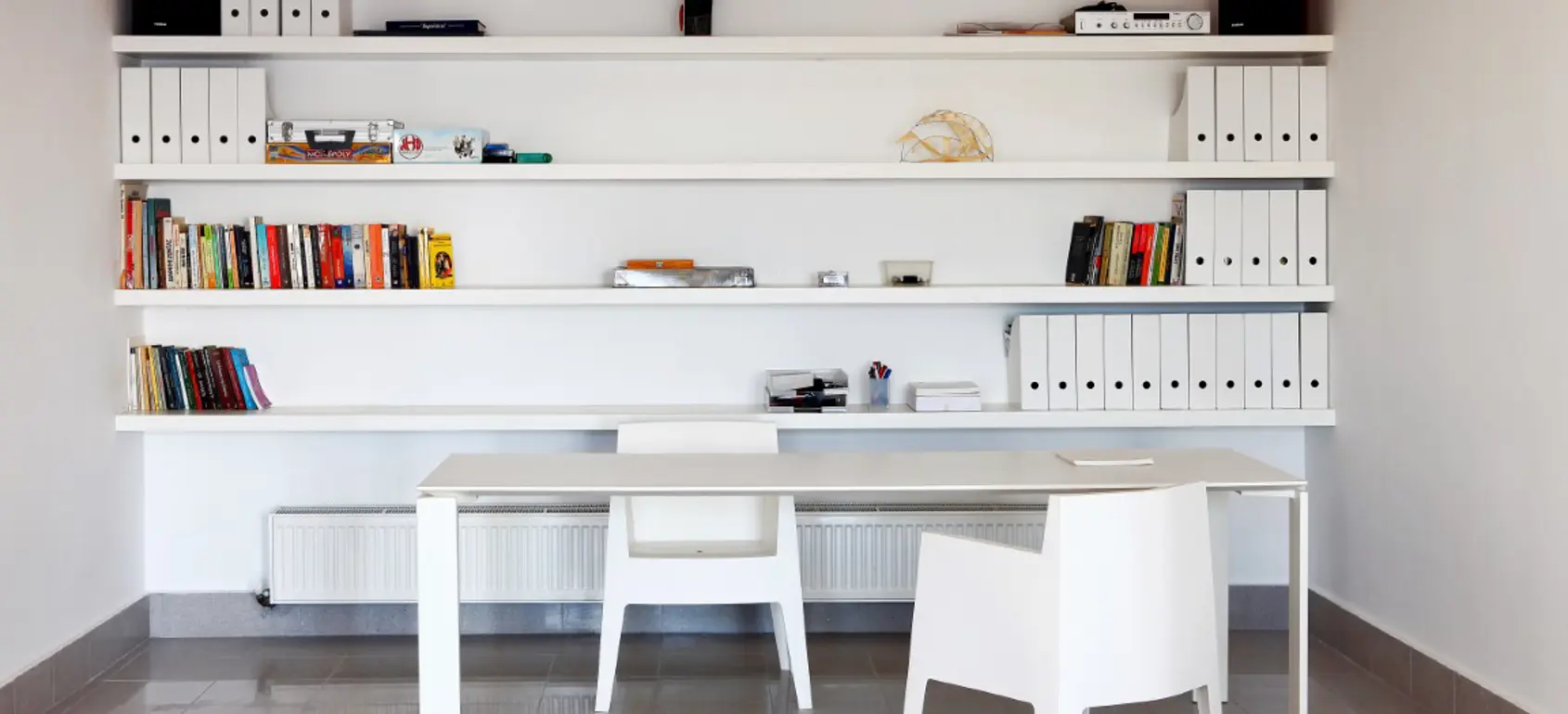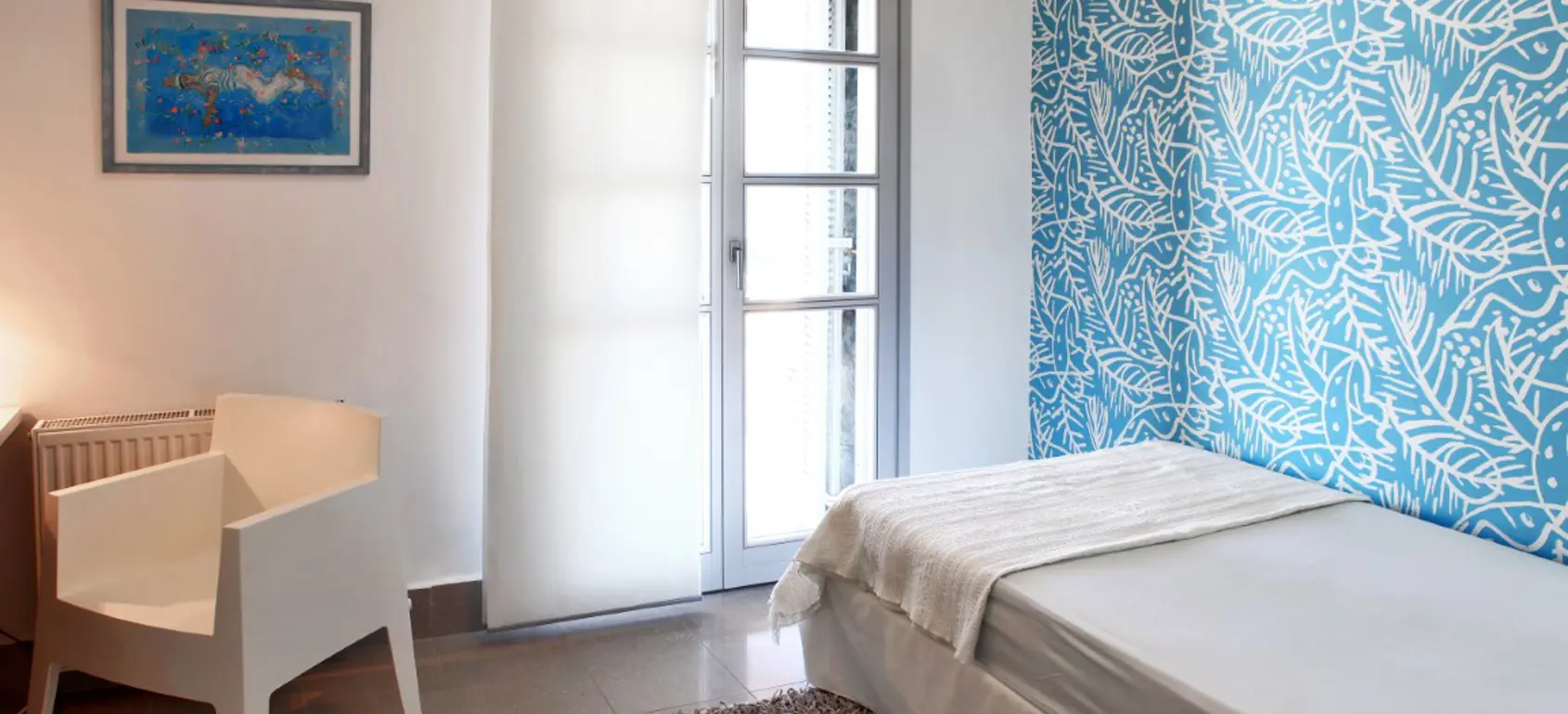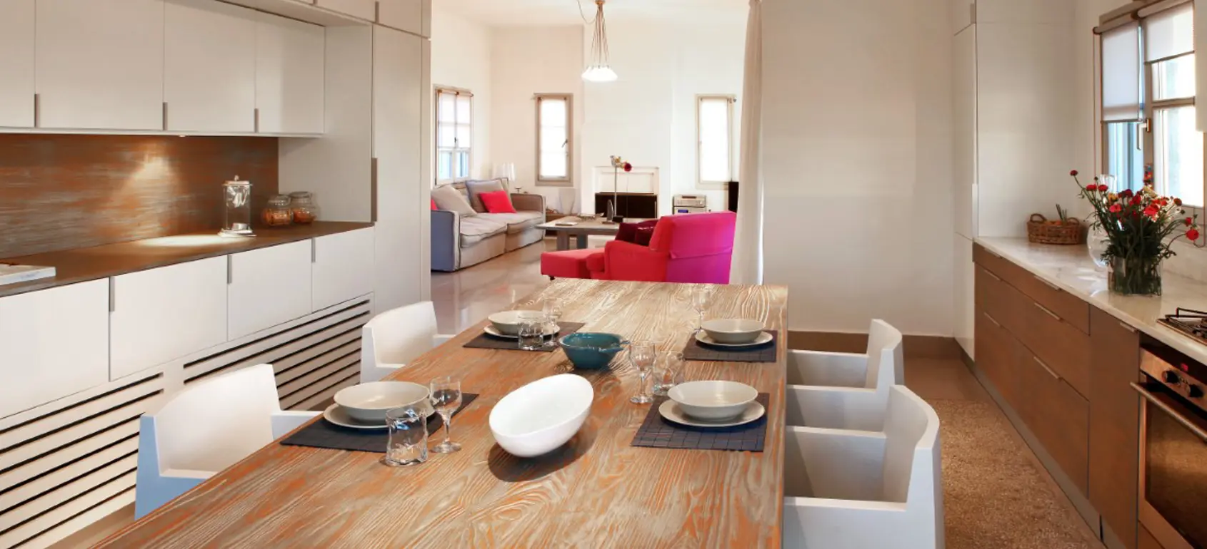 The residence features a generously sized living room with a fireplace and bespoke furnishings by Philippe Starck, a spacious built-in kitchen and dining area designed by Ingrid Frangantoni, four en-suite bedrooms, and additional auxiliary spaces. Complementing the main house is a fully independent guest residence of 40 square meters, offering privacy and convenience for visitors.