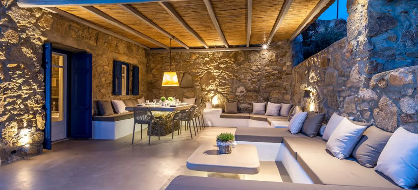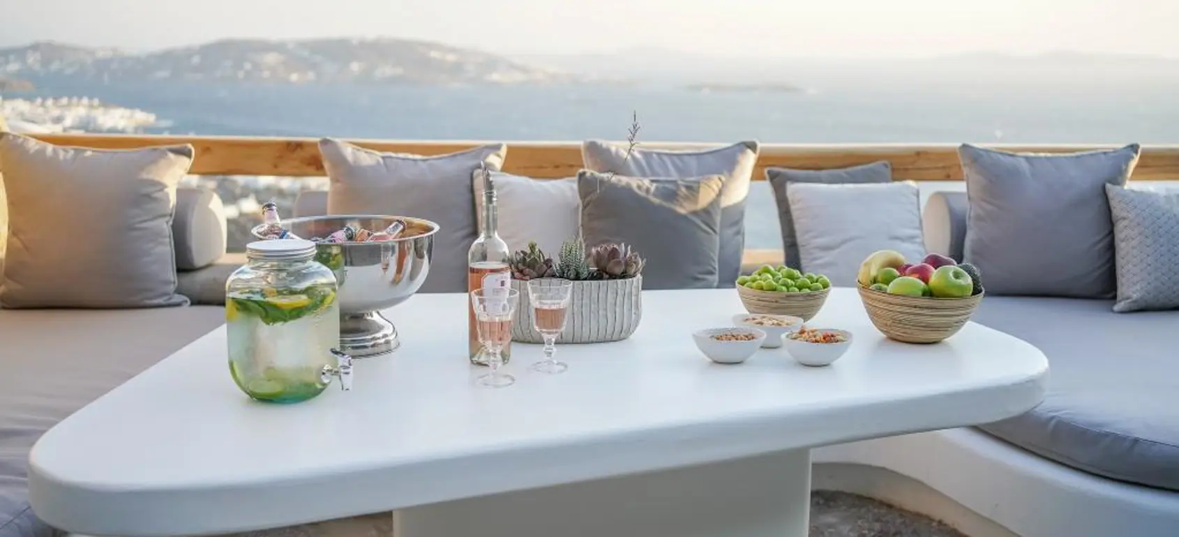 Outside, on the main exterior level, there is a large terrace with a pool and a variety of lounge areas with exquisite views over the town of Mykonos and the Aegean Sea. All property terraces provide several lounge areas, dining areas and amazing views.