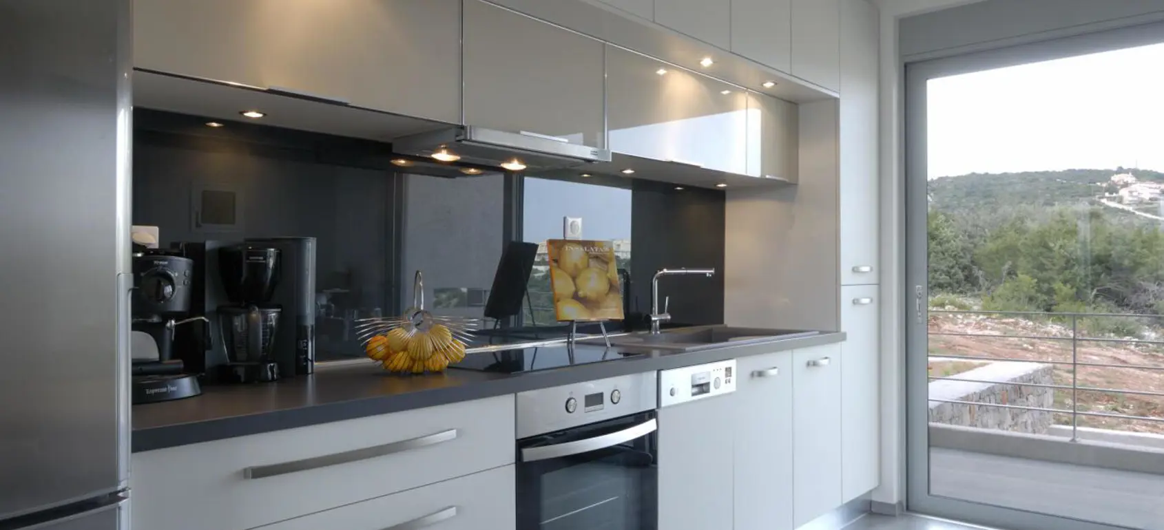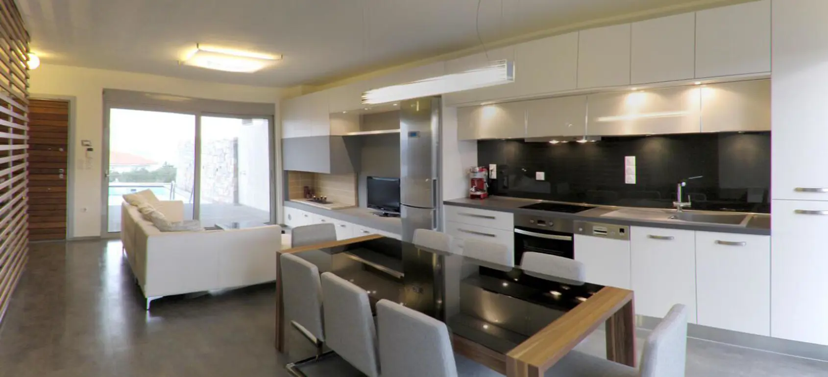 Interior spaces include two bedrooms and a spacious open-plan living, dining, and kitchen area. Additional amenities comprise an attic terrace offering panoramic sea views and a versatile lower-level space with a bathroom, ideal for use as a playroom, guest suite, or multipurpose room.