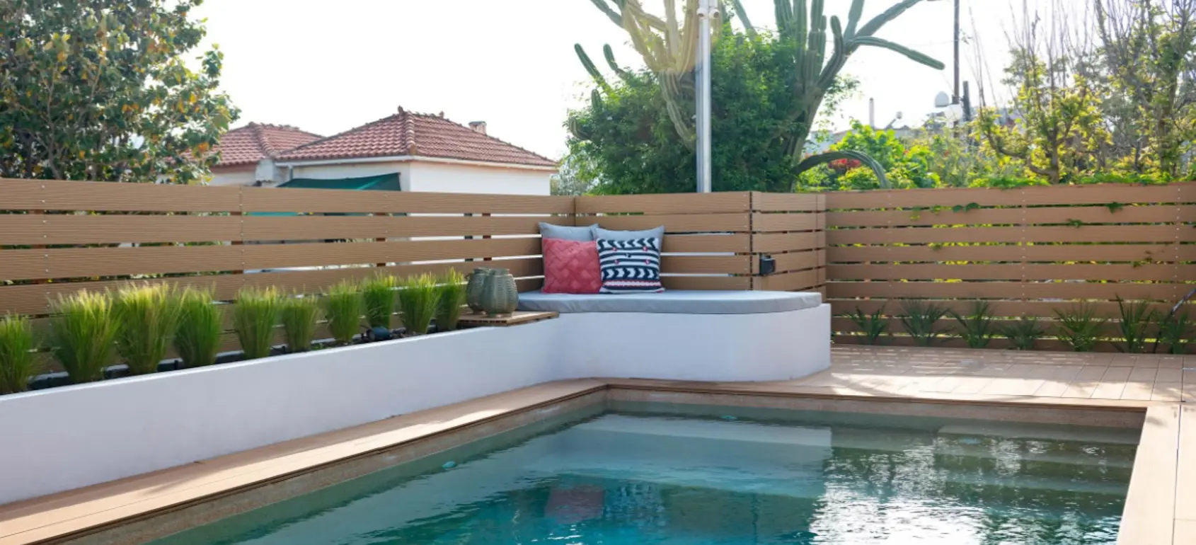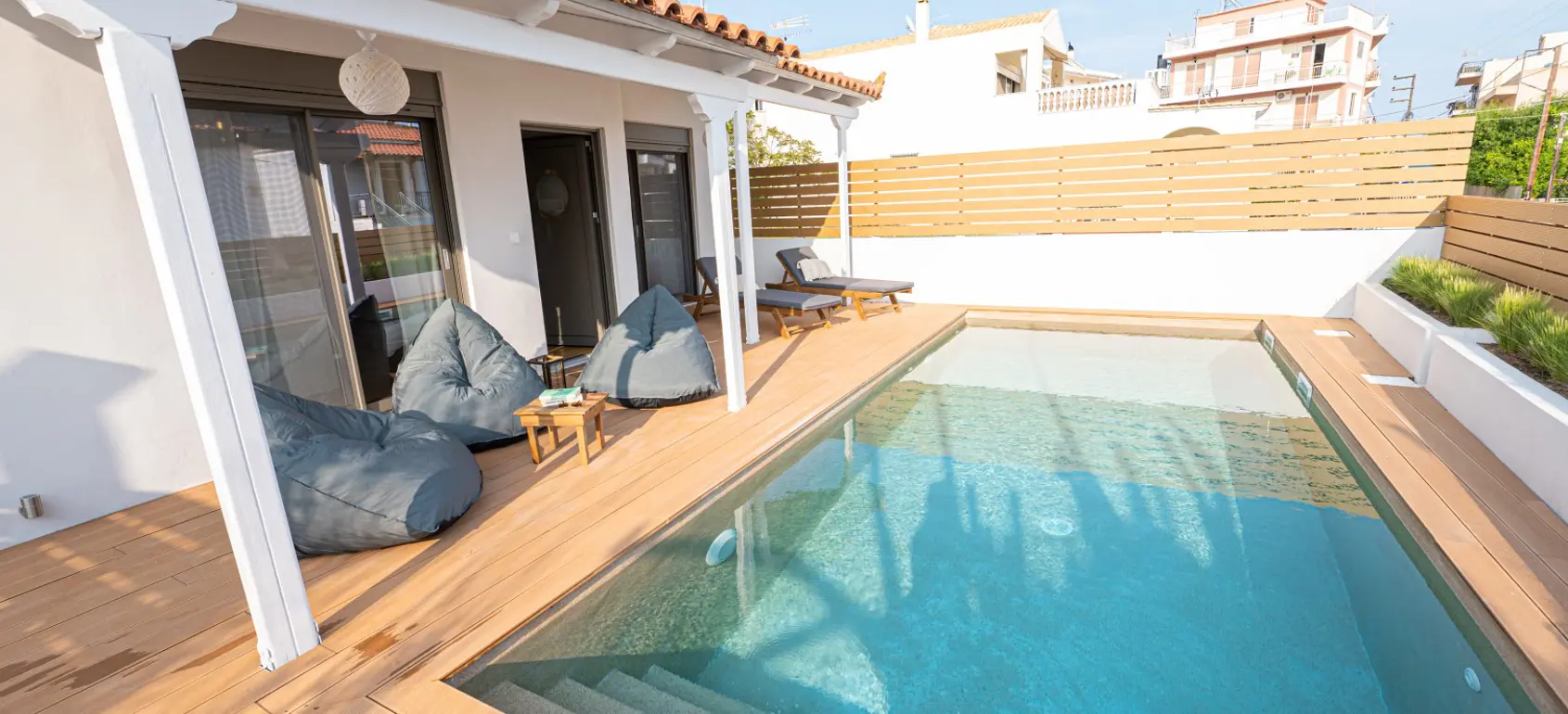 Externally, the swimming pool is the dominant feature. The pool system, using magnesium, converts the pool water into metallic water, which provides water with beneficial and therapeutic properties that contribute to overall well-being and health.