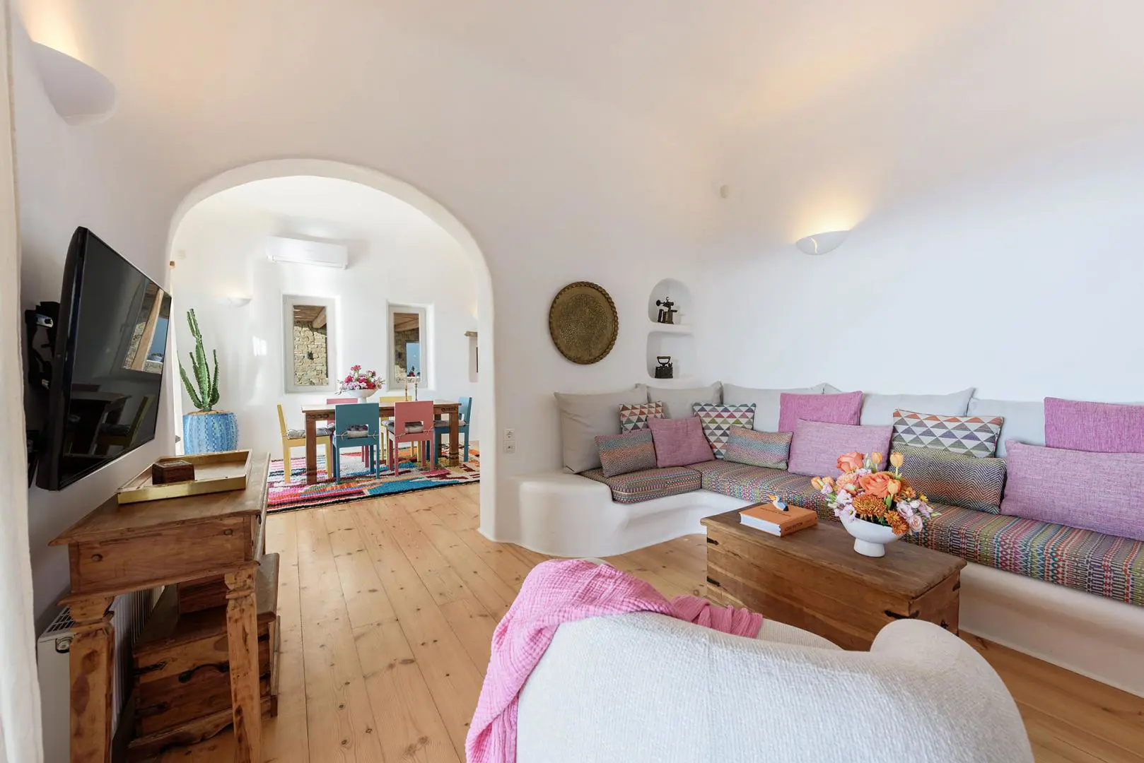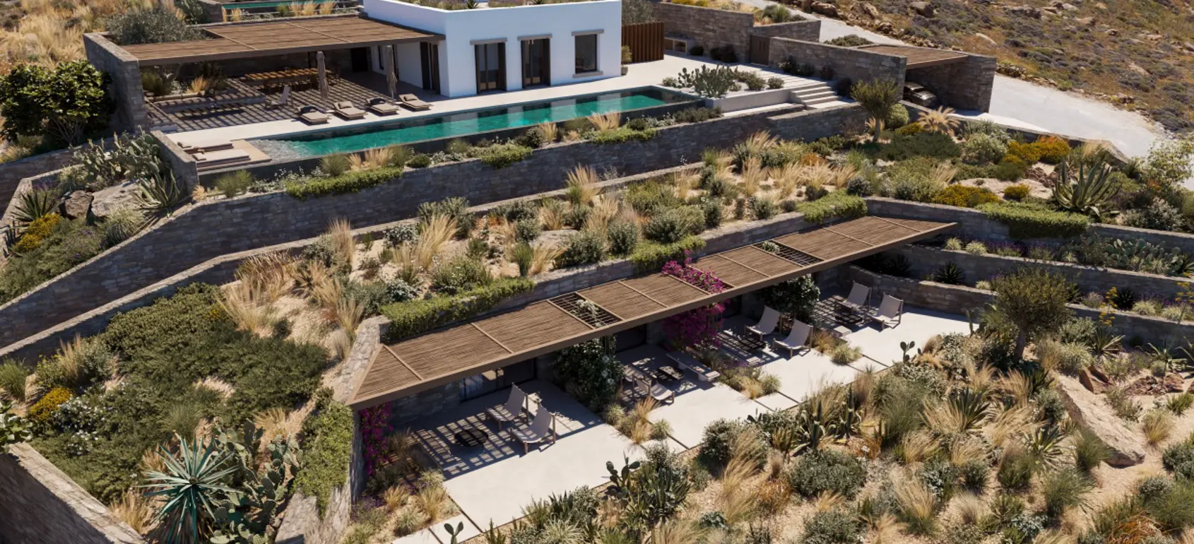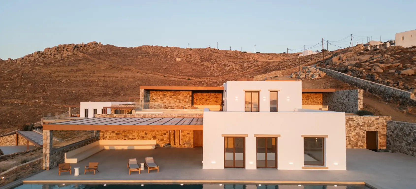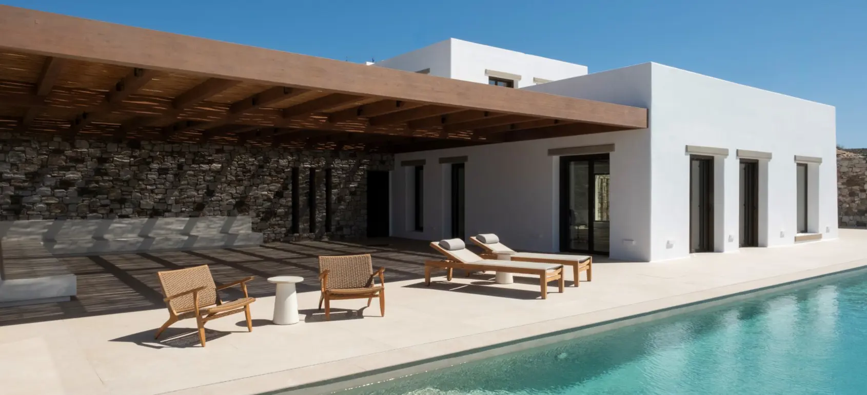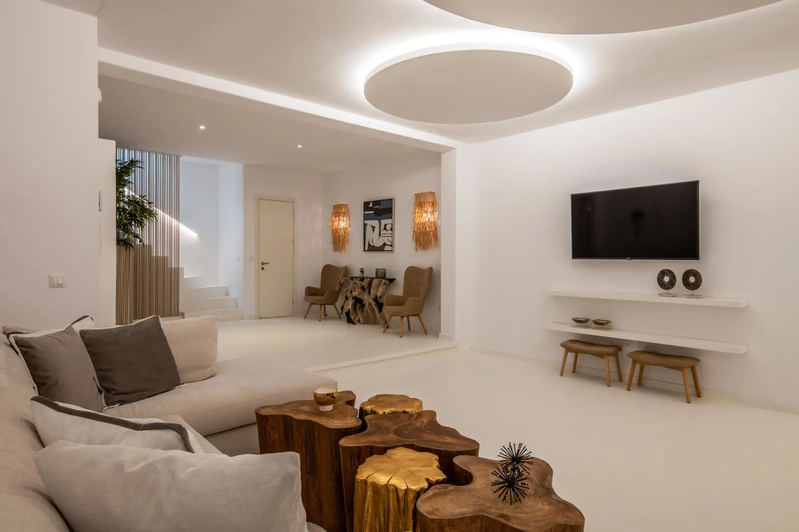 Occupying 600 sqm within a 4,000 sqm plot, the villa has been crafted to the highest standards, seamlessly blending natural elements with iconic Cycladic architecture. Clean white volumes, stone facades, wooden pergolas, and sculpted in-cave sections harmonize with the surrounding landscape, while the fluid integration of indoor and outdoor spaces creates a living experience deeply connected to the Aegean environment.