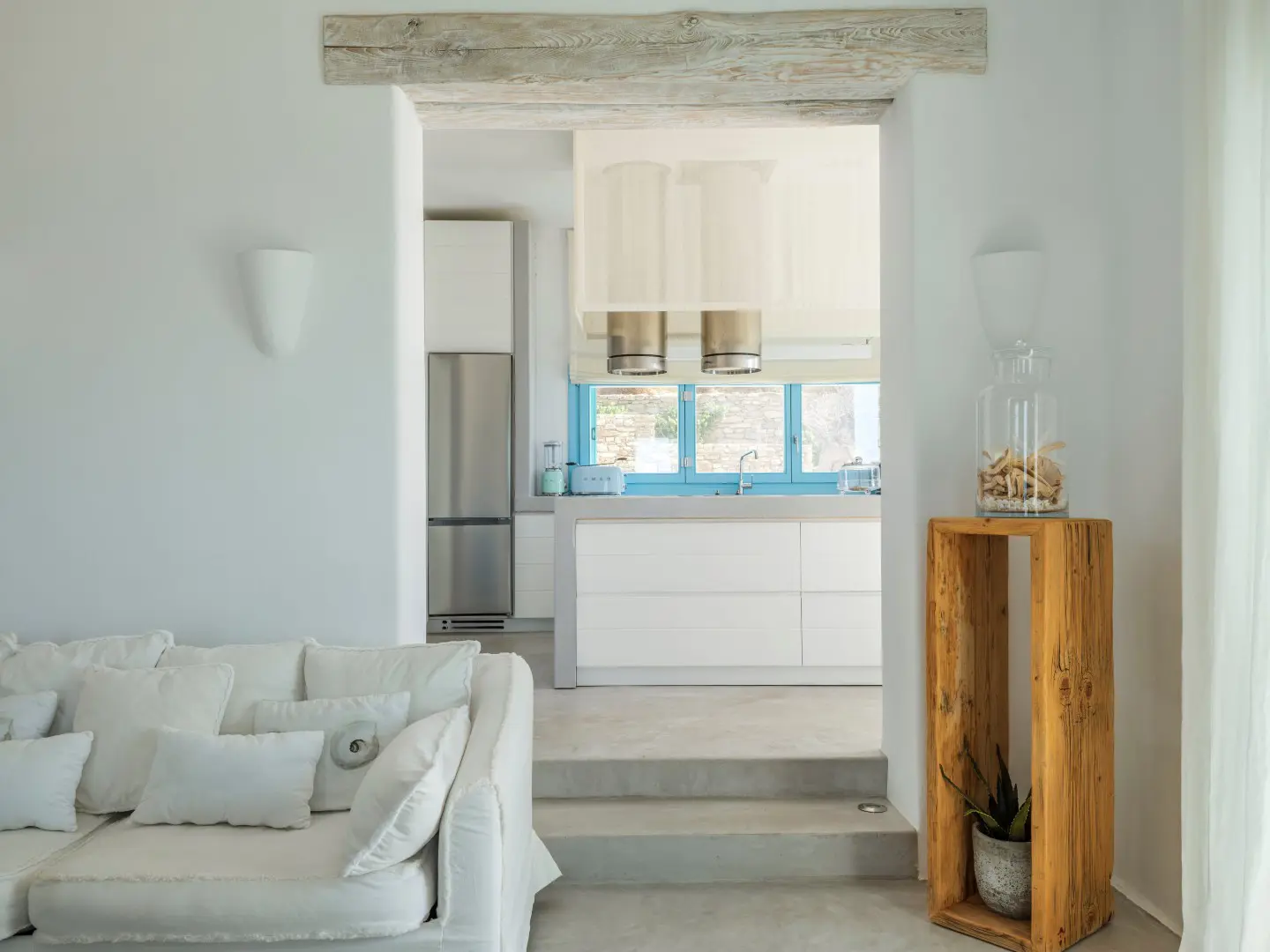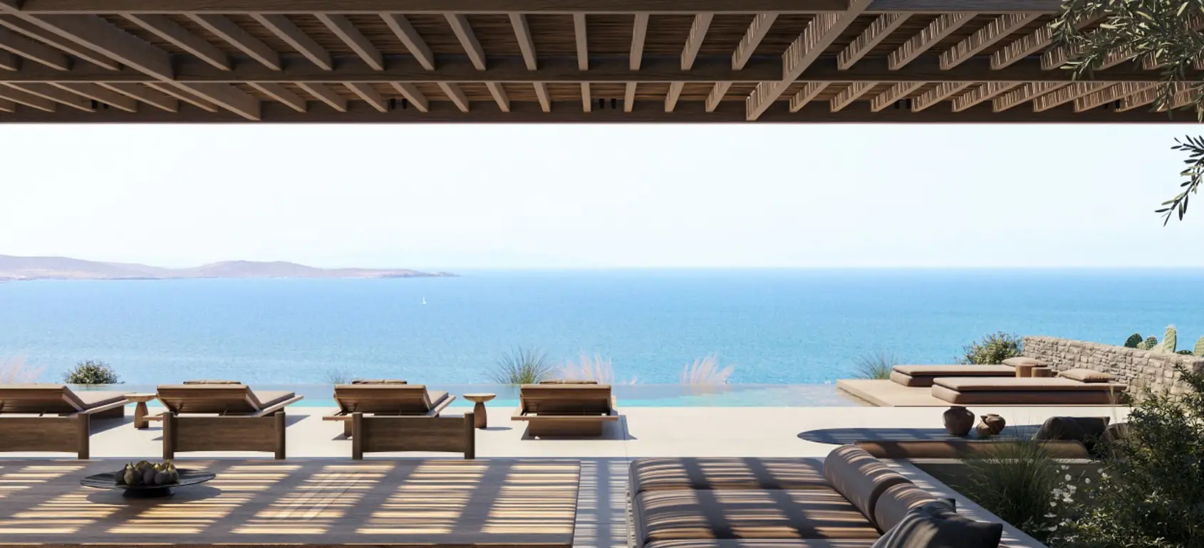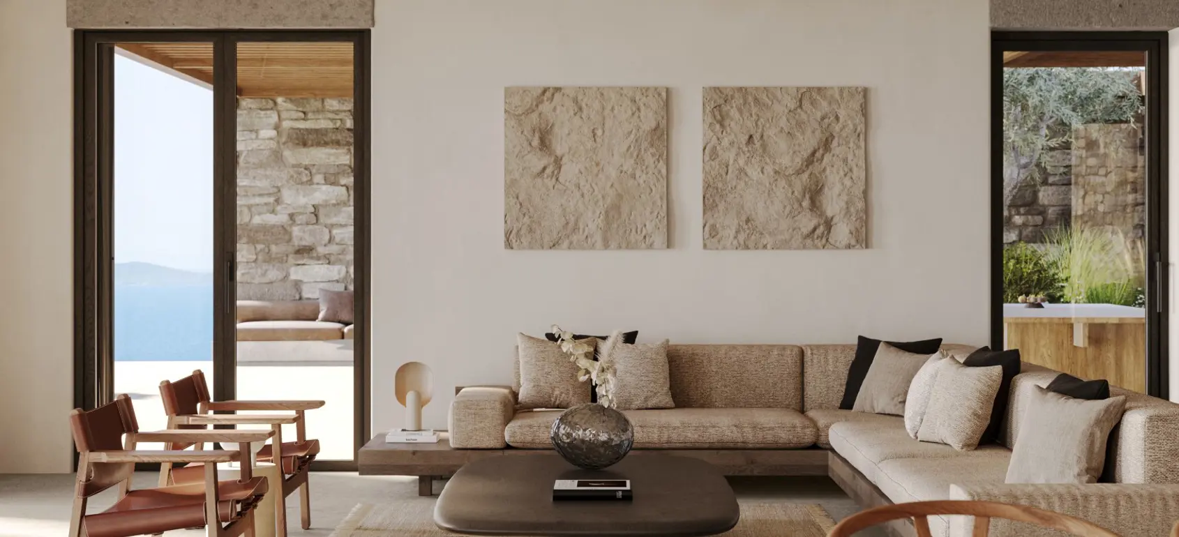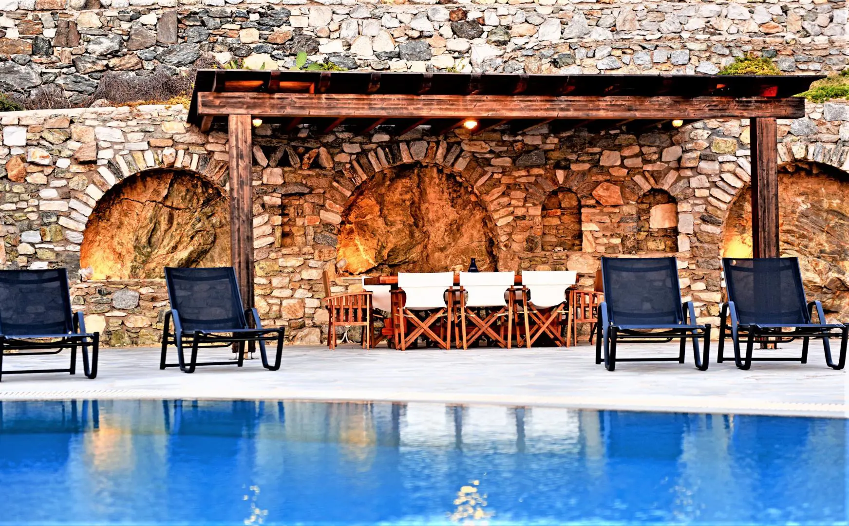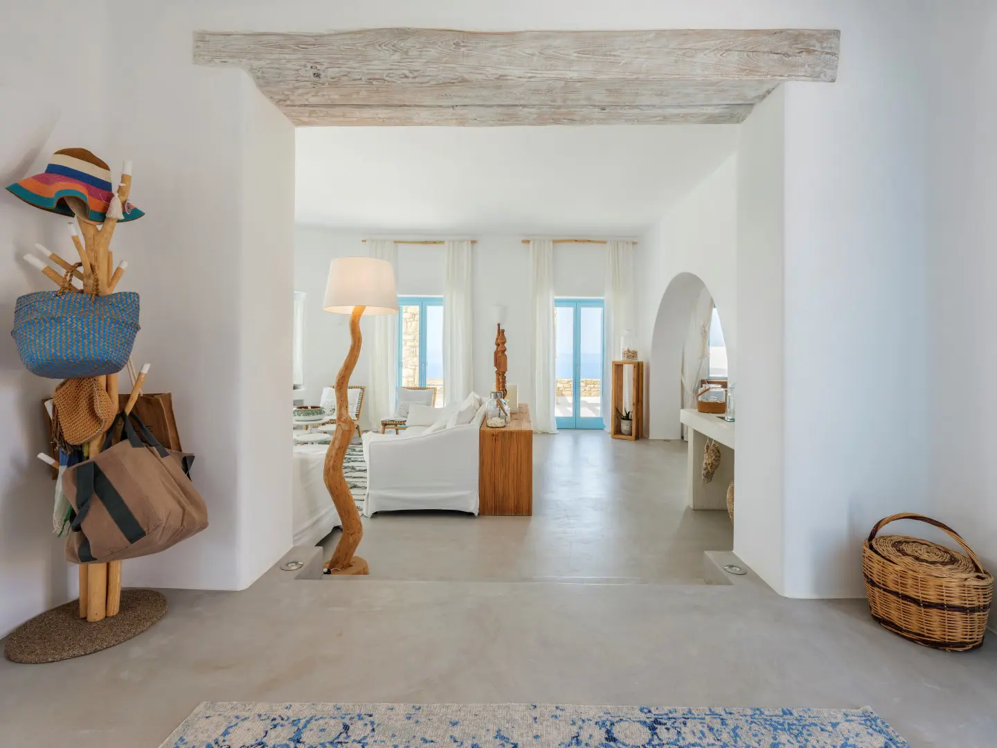 Occupying 600 sqm within a 4,000 sqm plot, the villa has been crafted to the highest standards, seamlessly blending natural elements with iconic Cycladic architecture. Clean white volumes, stone facades, wooden pergolas, and sculpted in-cave sections harmonize with the surrounding landscape, while the fluid integration of indoor and outdoor spaces creates a living experience deeply connected to the Aegean environment.