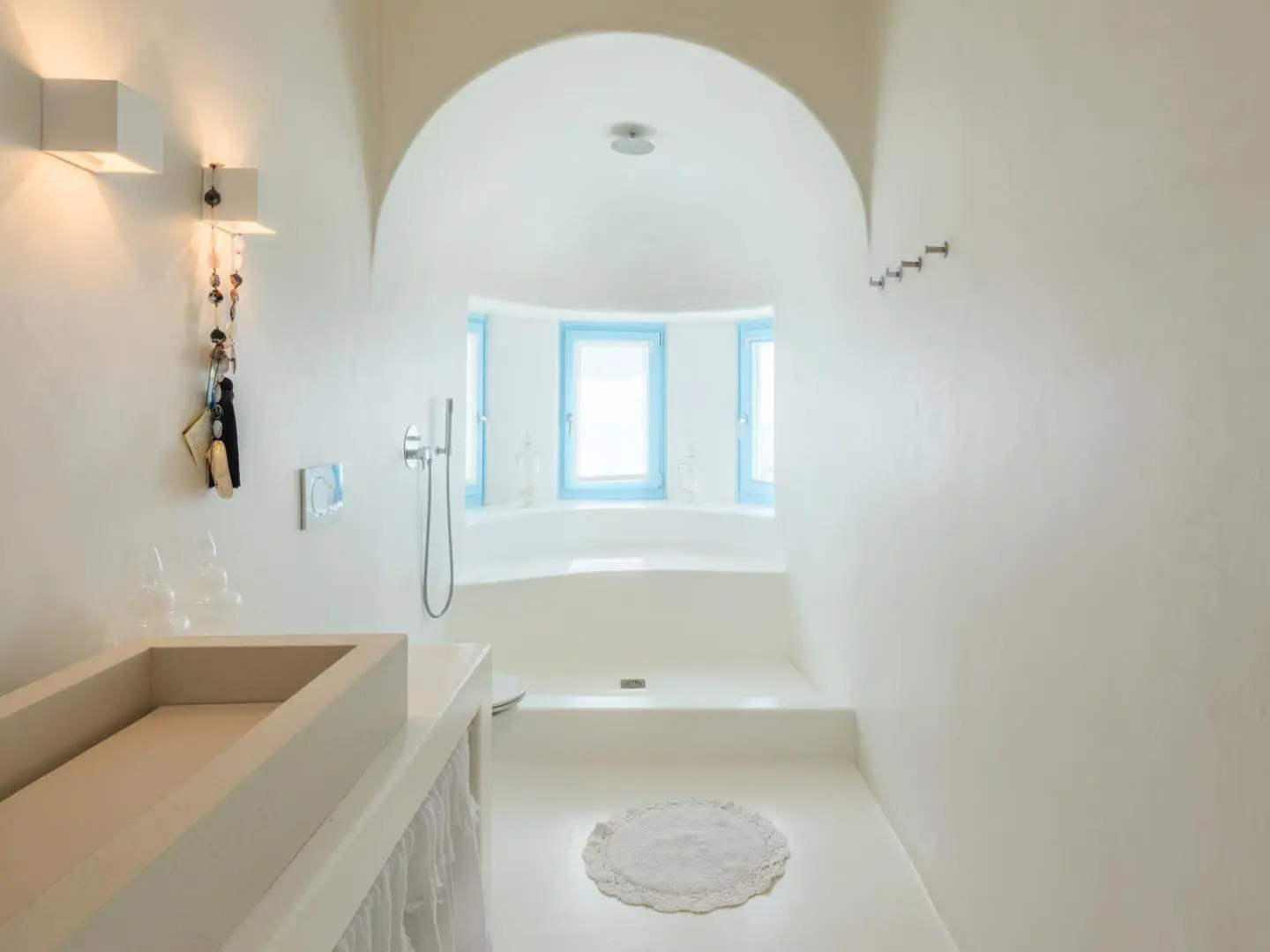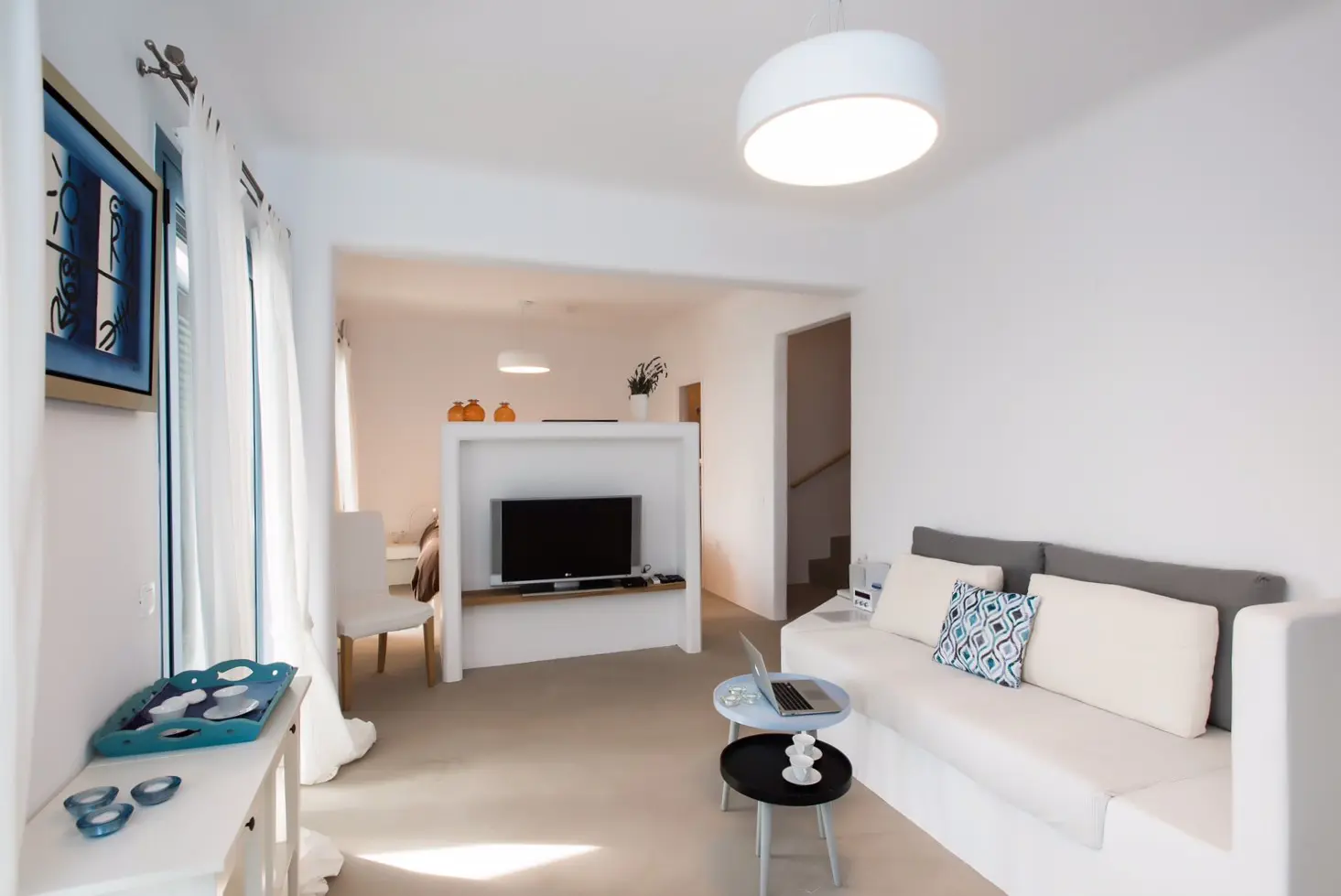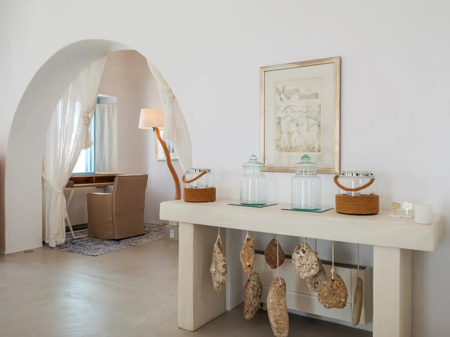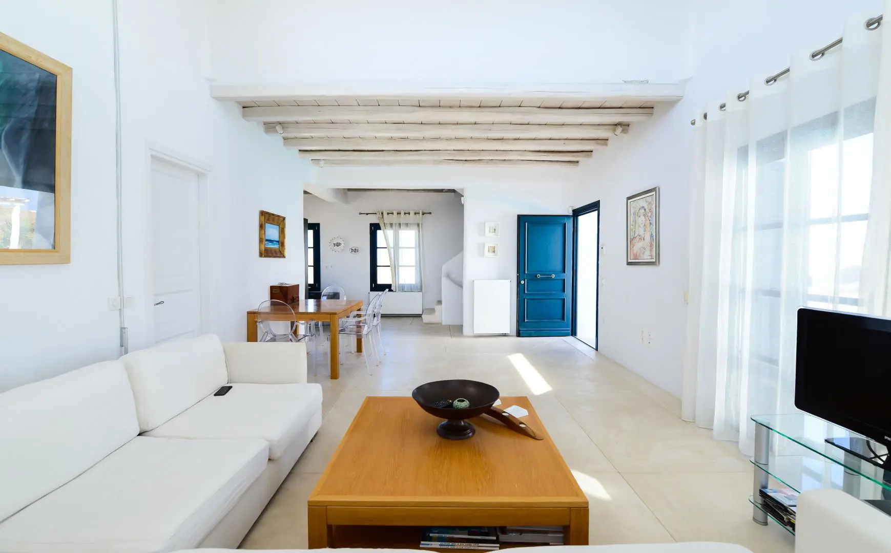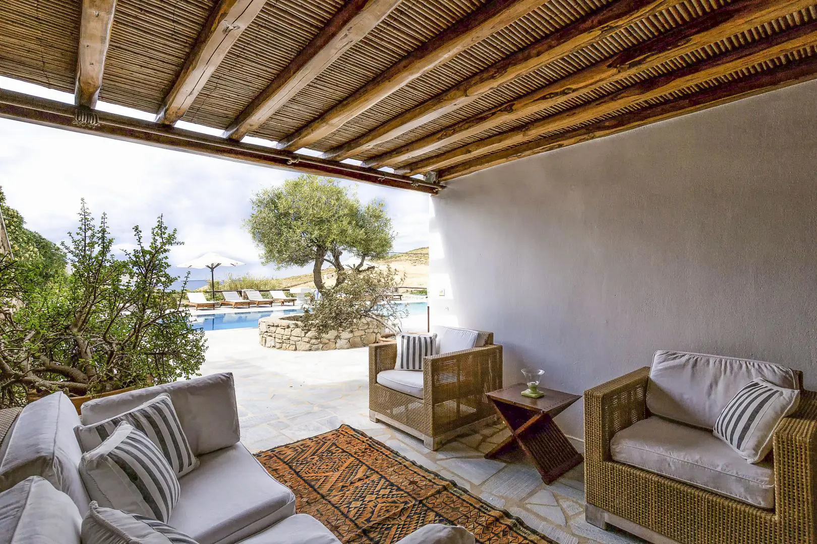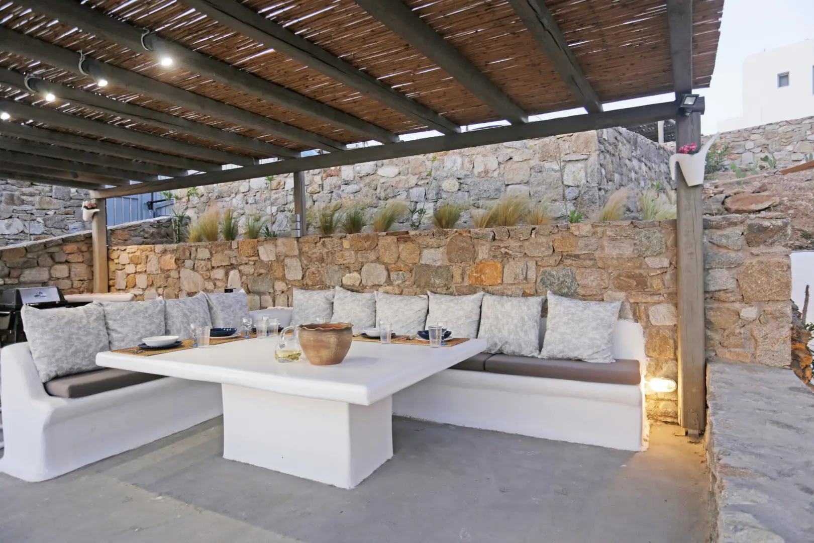 Occupying 600 sqm within a 4,000 sqm plot, the villa has been crafted to the highest standards, seamlessly blending natural elements with iconic Cycladic architecture. Clean white volumes, stone facades, wooden pergolas, and sculpted in-cave sections harmonize with the surrounding landscape, while the fluid integration of indoor and outdoor spaces creates a living experience deeply connected to the Aegean environment.