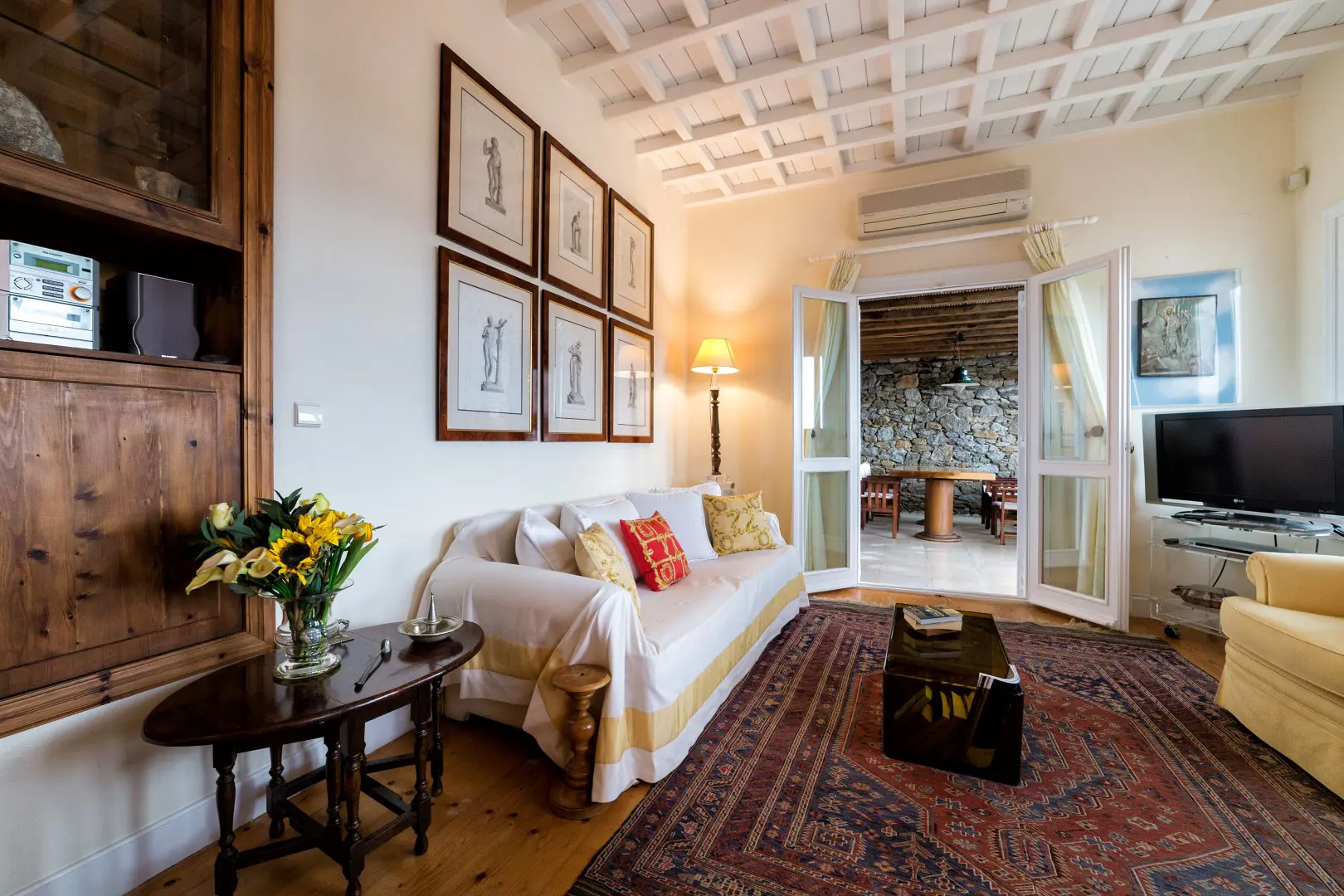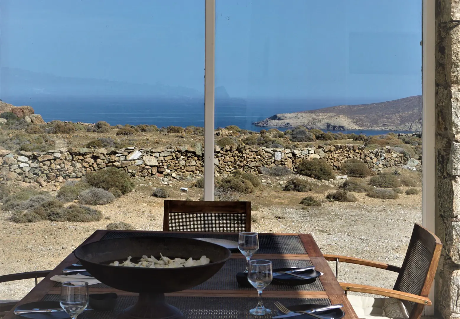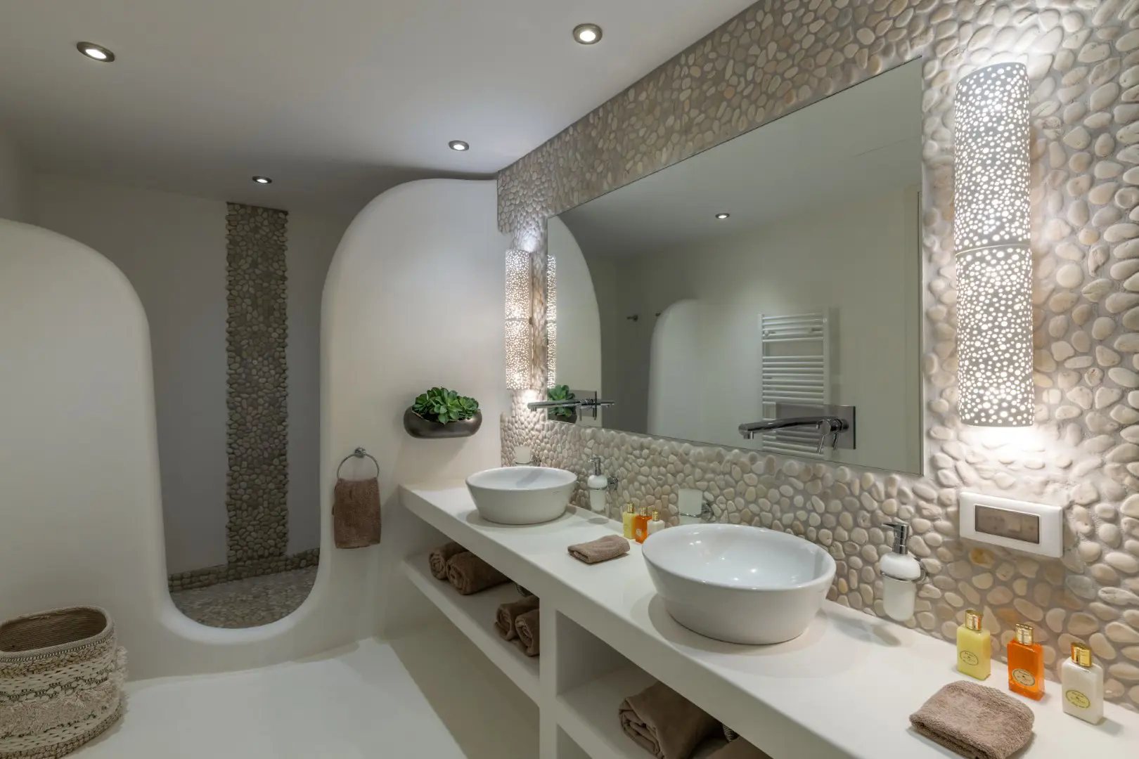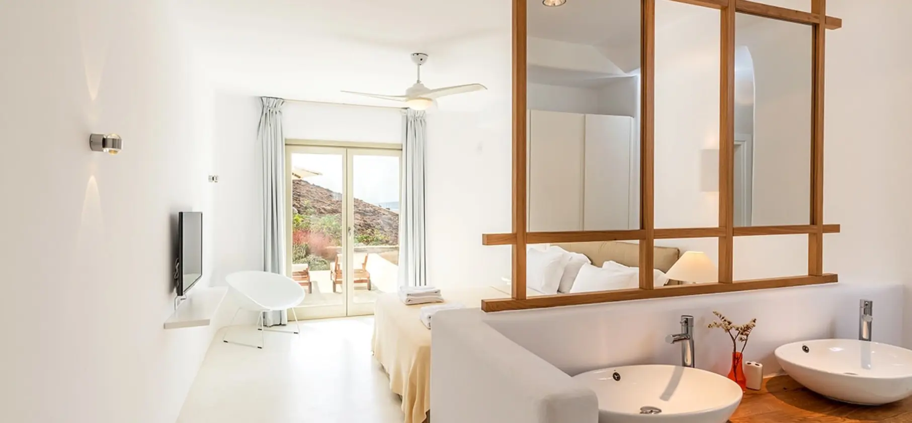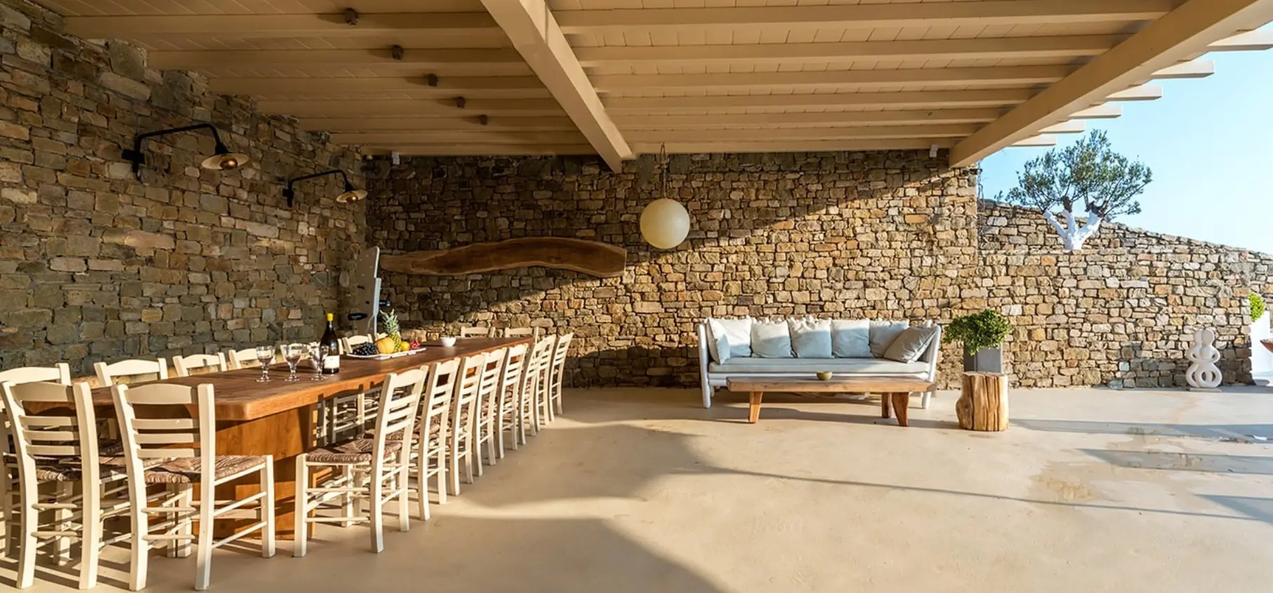 Occupying 600 sqm within a 4,000 sqm plot, the villa has been crafted to the highest standards, seamlessly blending natural elements with iconic Cycladic architecture. Clean white volumes, stone facades, wooden pergolas, and sculpted in-cave sections harmonize with the surrounding landscape, while the fluid integration of indoor and outdoor spaces creates a living experience deeply connected to the Aegean environment.