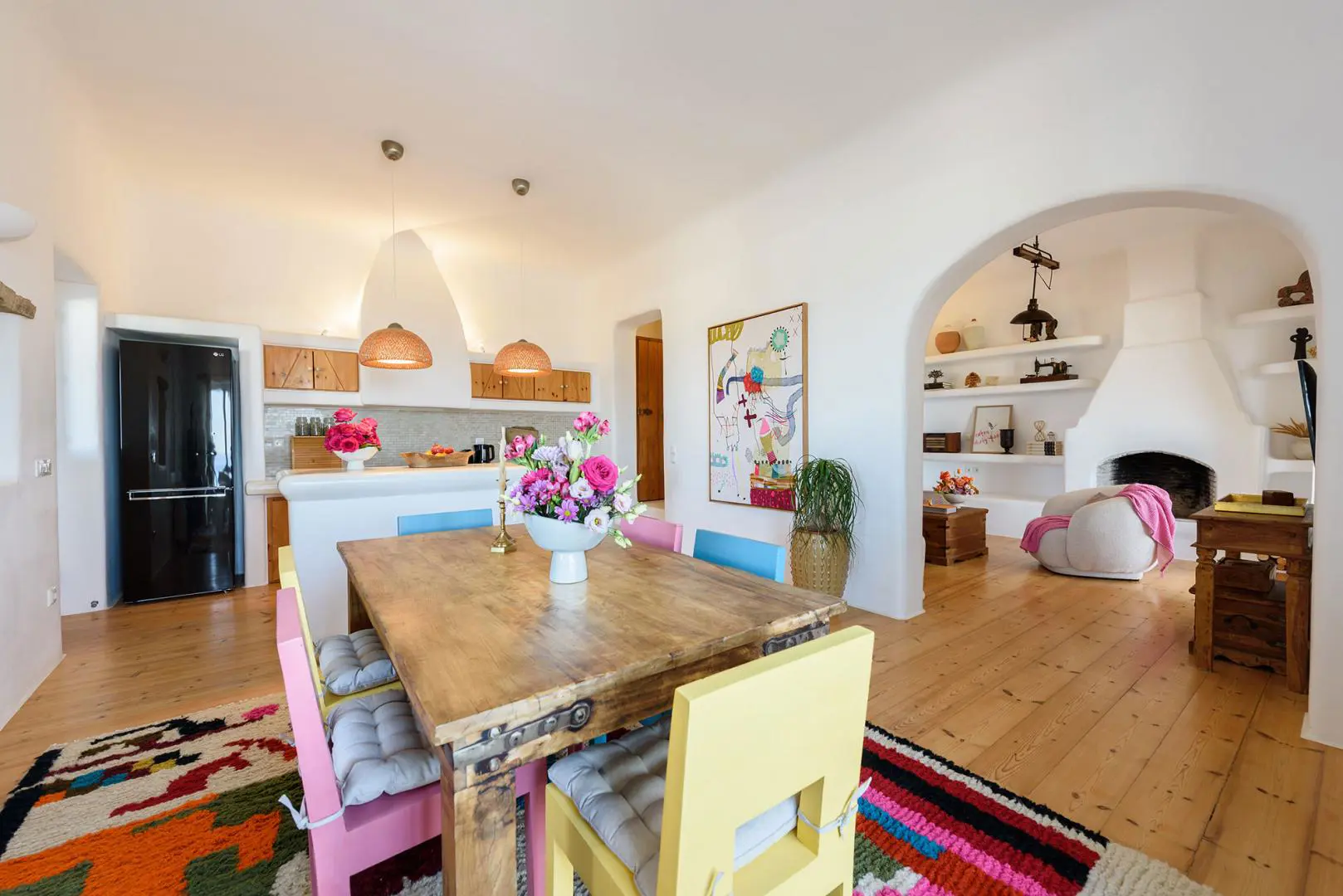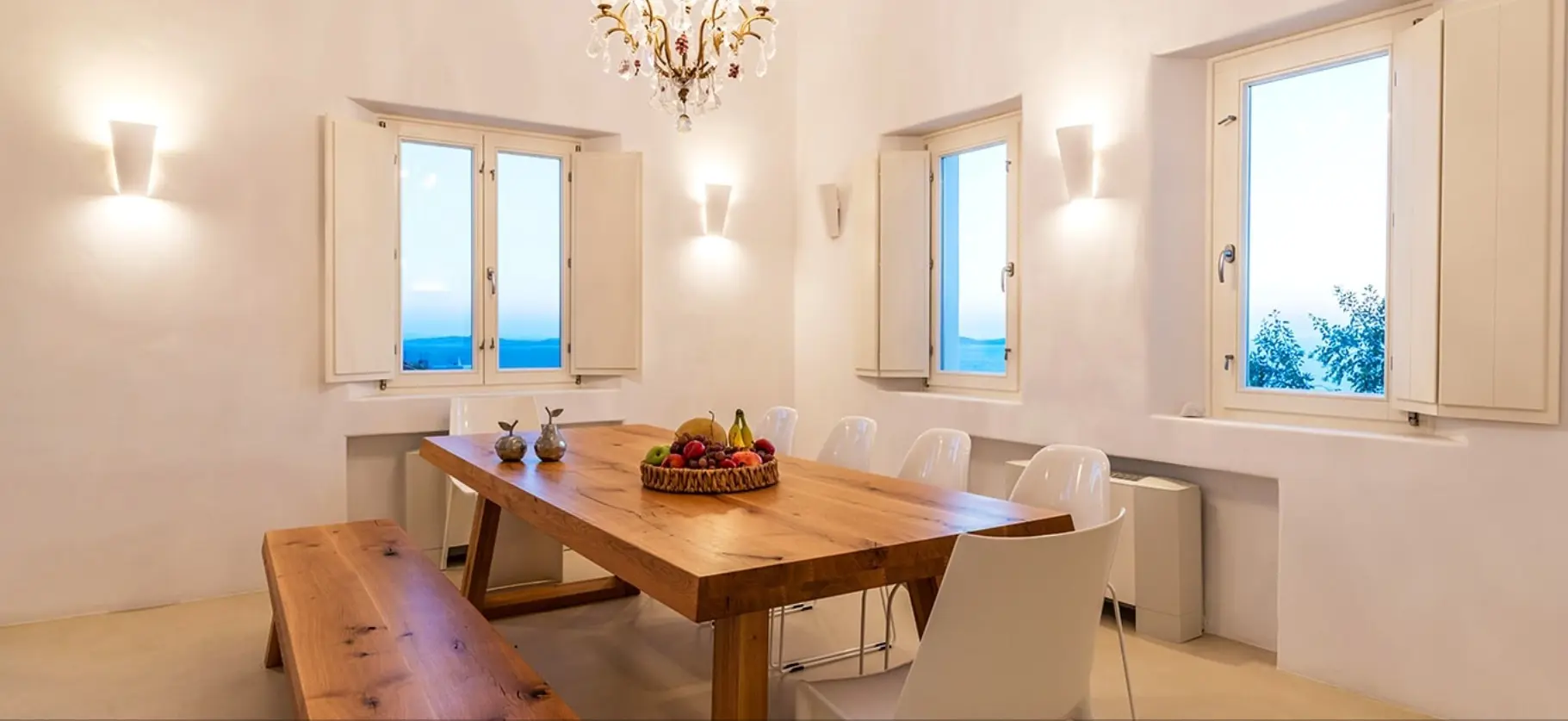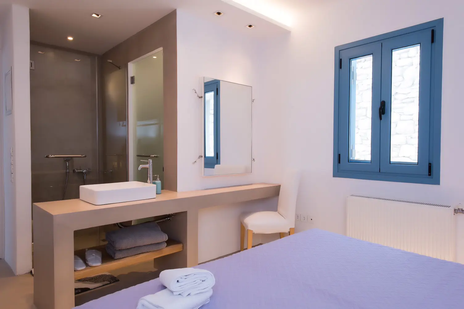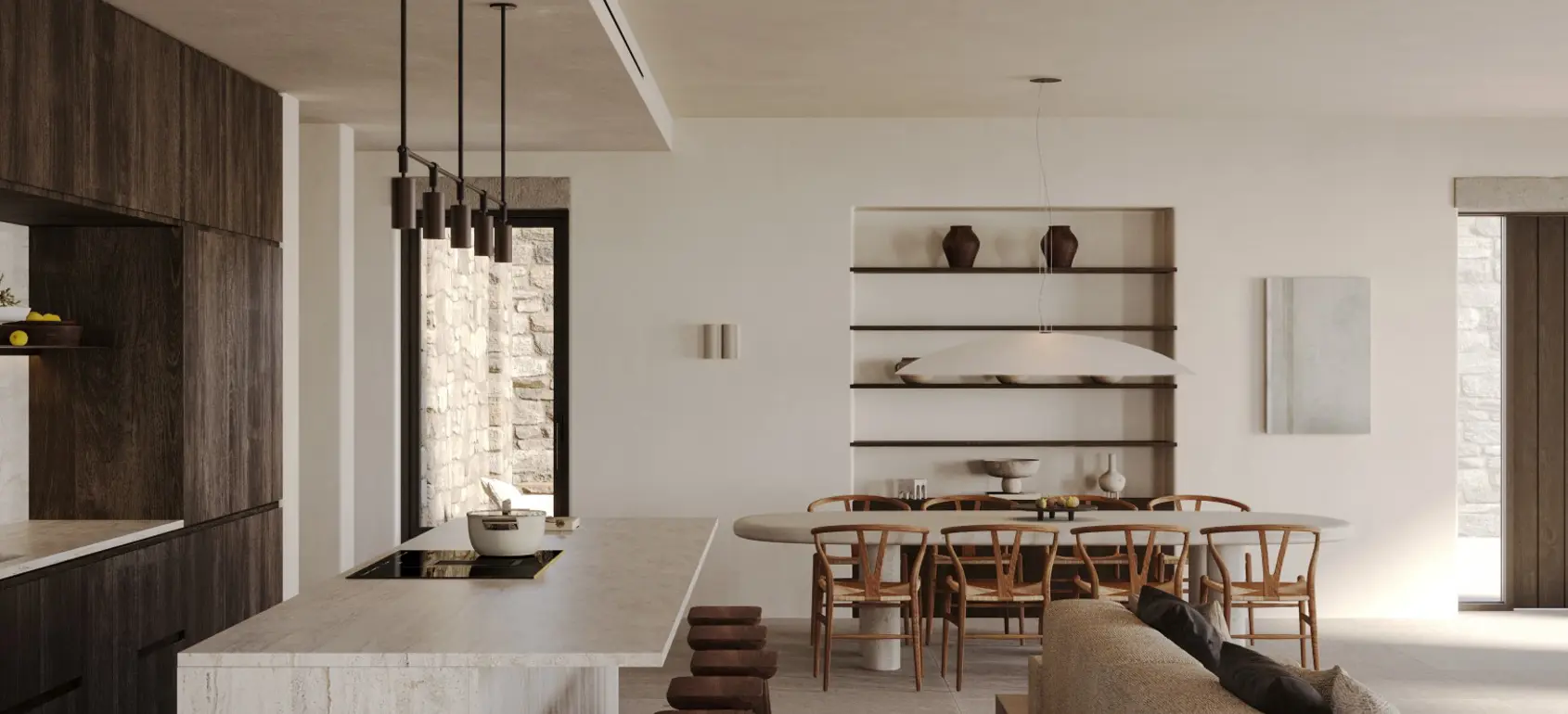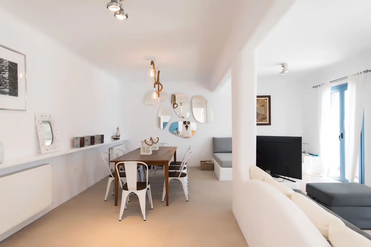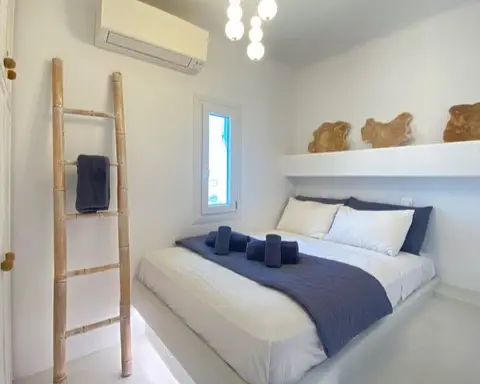 Occupying 600 sqm within a 4,000 sqm plot, the villa has been crafted to the highest standards, seamlessly blending natural elements with iconic Cycladic architecture. Clean white volumes, stone facades, wooden pergolas, and sculpted in-cave sections harmonize with the surrounding landscape, while the fluid integration of indoor and outdoor spaces creates a living experience deeply connected to the Aegean environment.