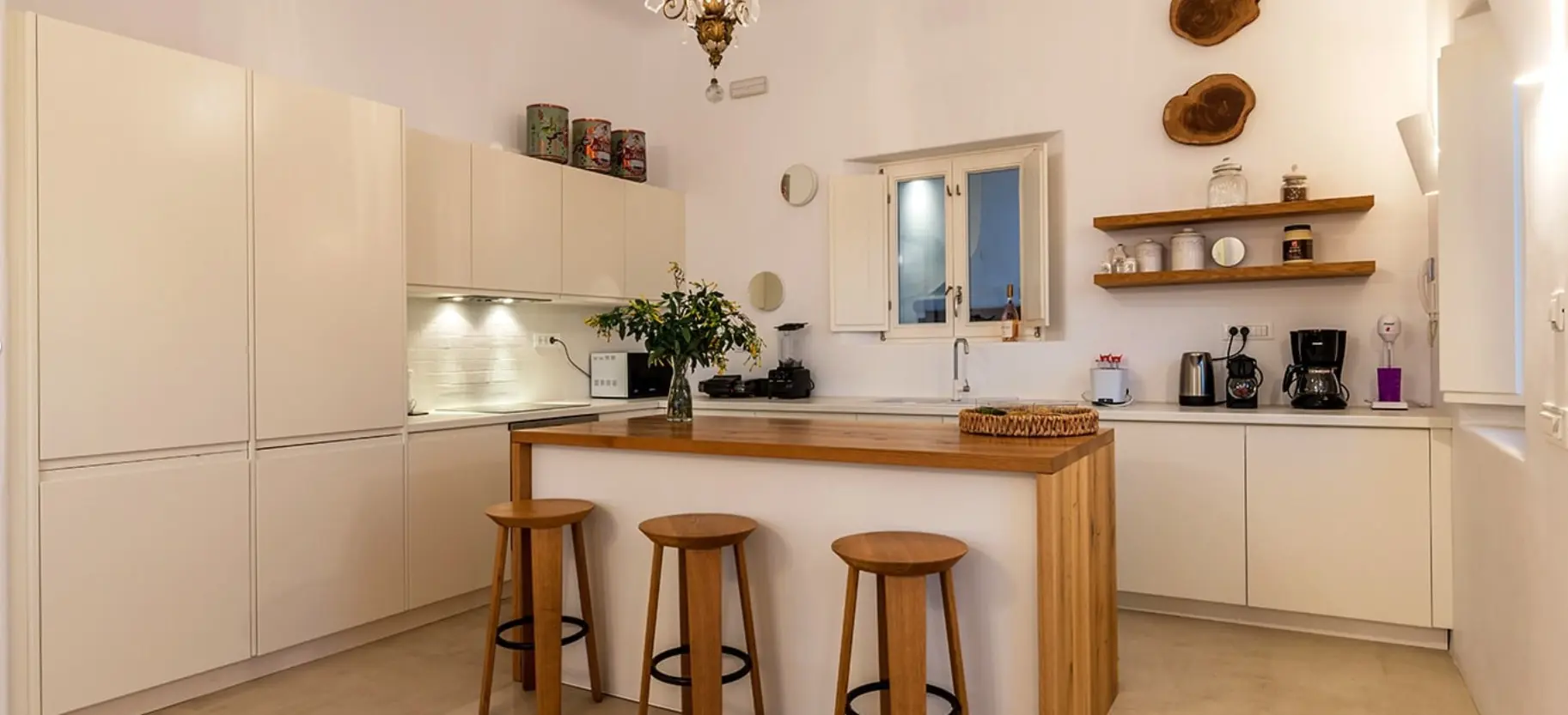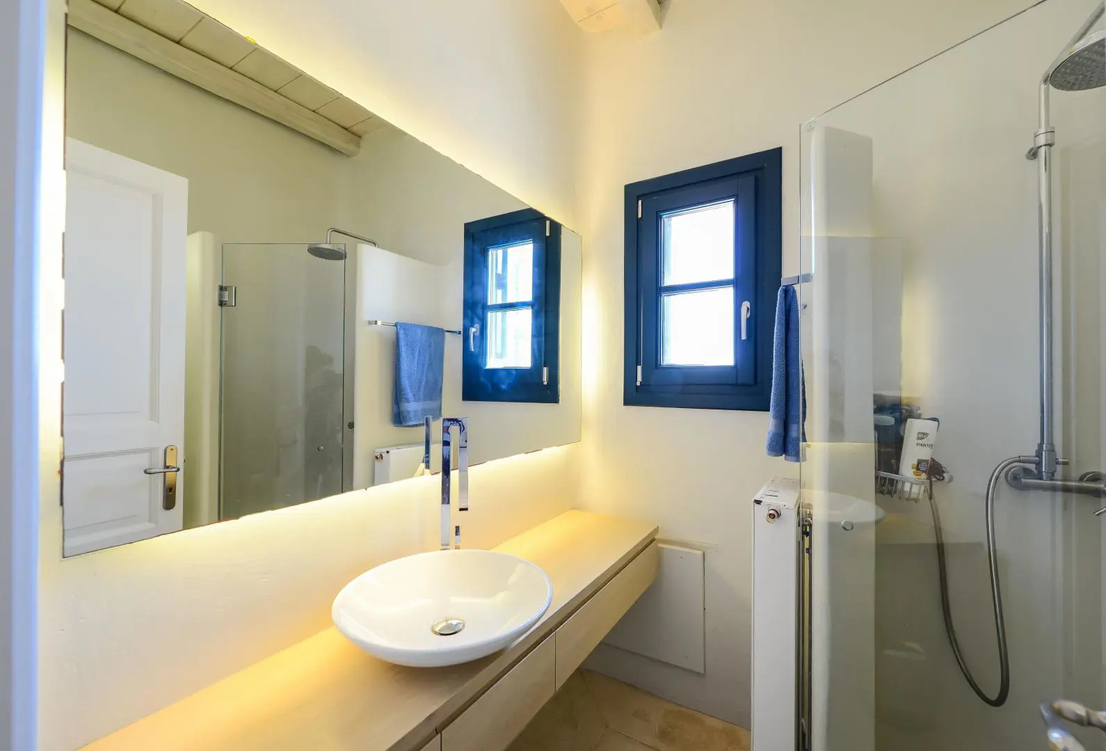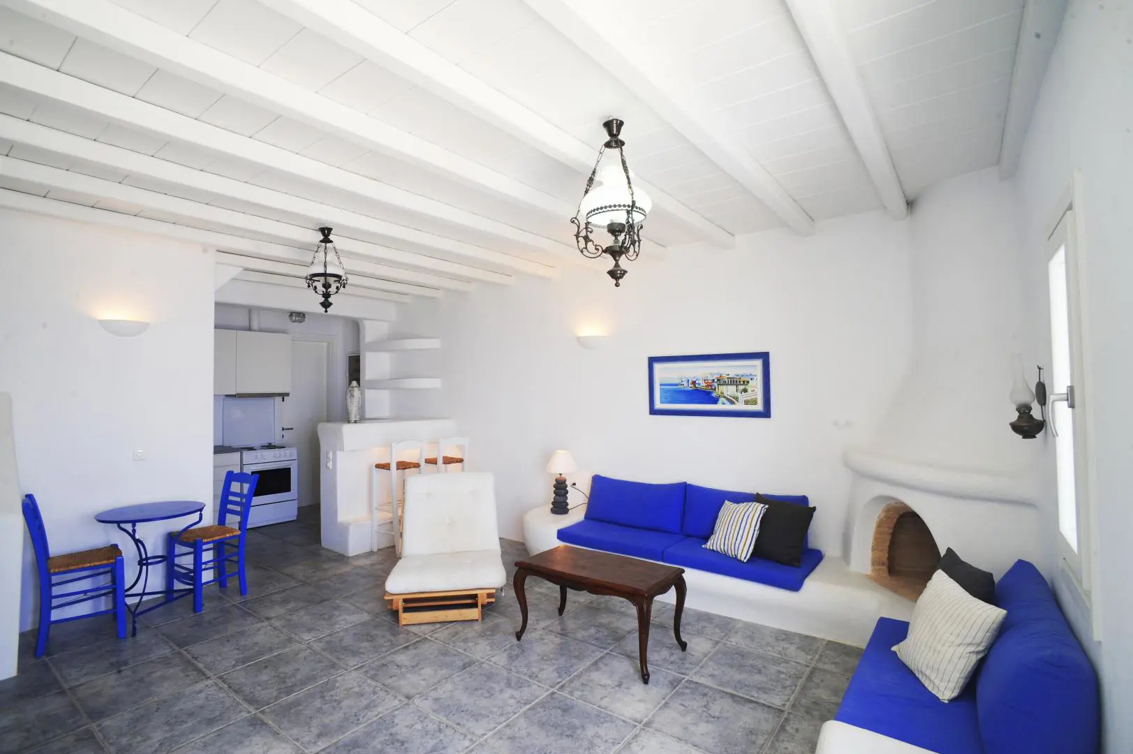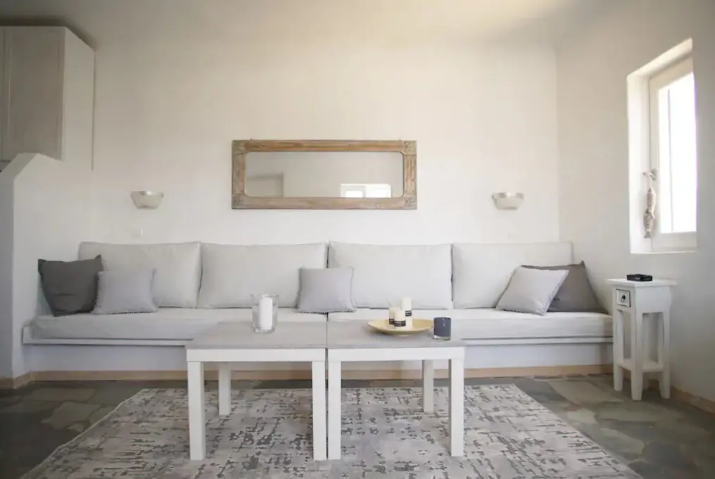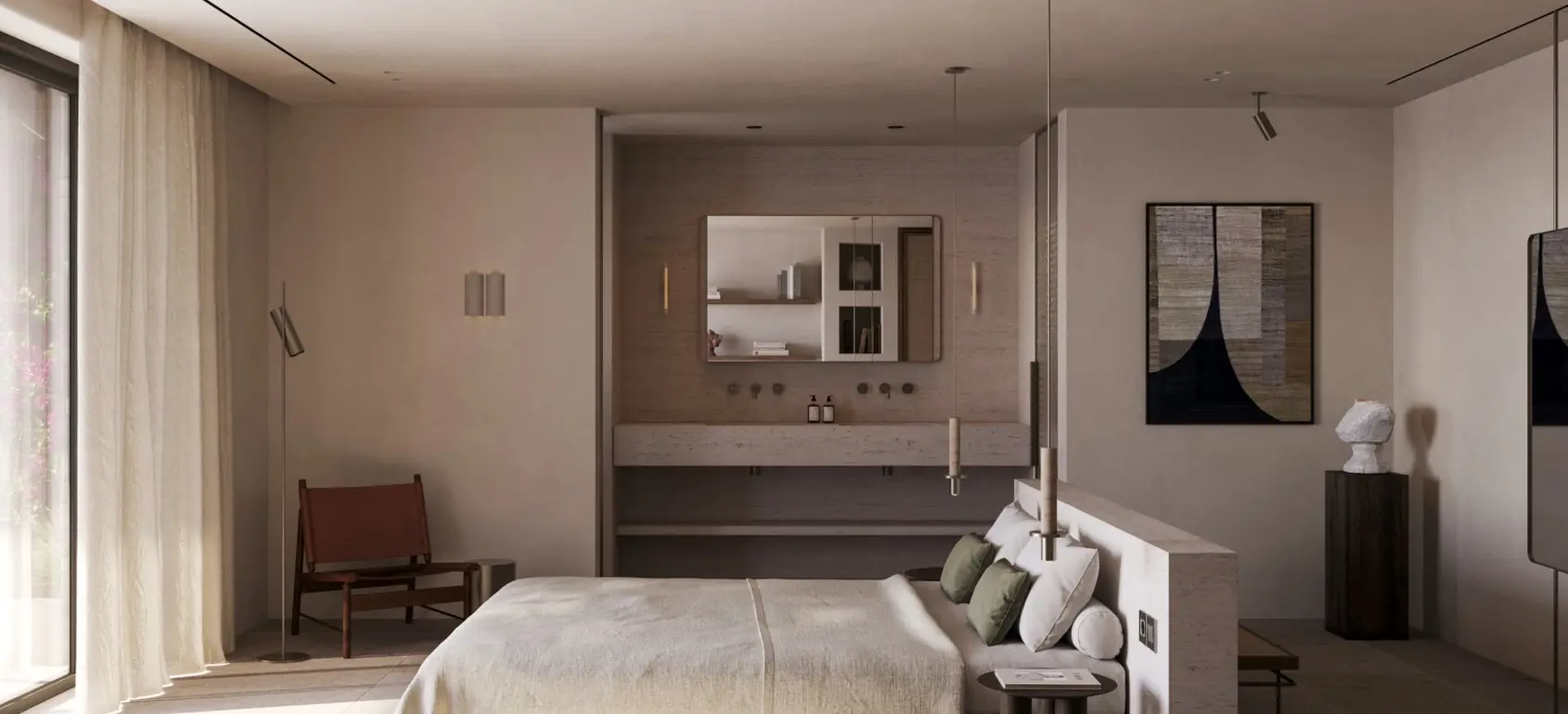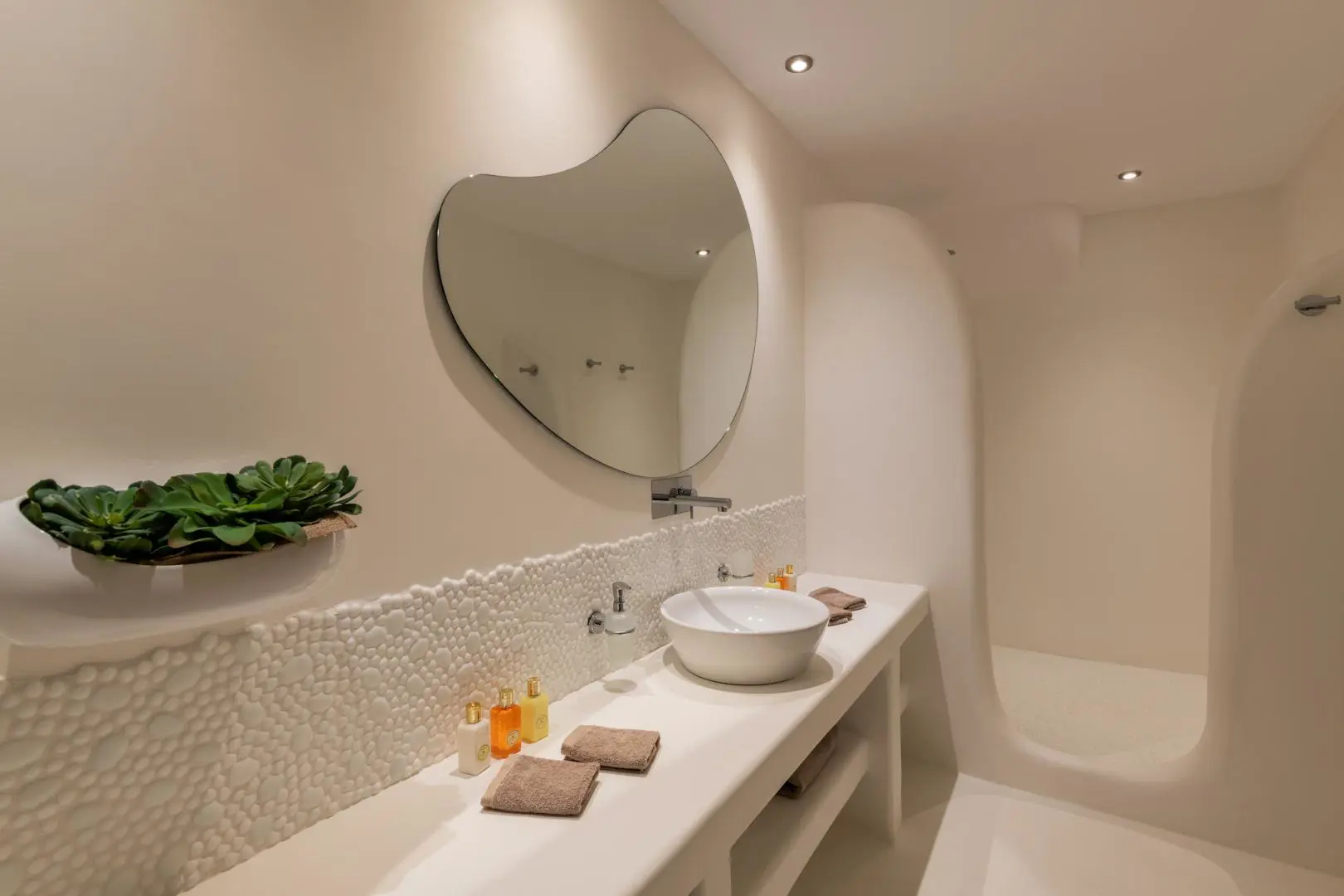 Occupying 600 sqm within a 4,000 sqm plot, the villa has been crafted to the highest standards, seamlessly blending natural elements with iconic Cycladic architecture. Clean white volumes, stone facades, wooden pergolas, and sculpted in-cave sections harmonize with the surrounding landscape, while the fluid integration of indoor and outdoor spaces creates a living experience deeply connected to the Aegean environment.