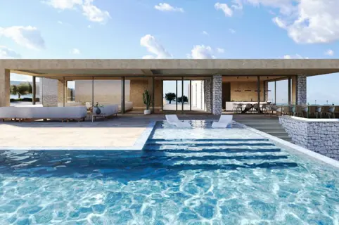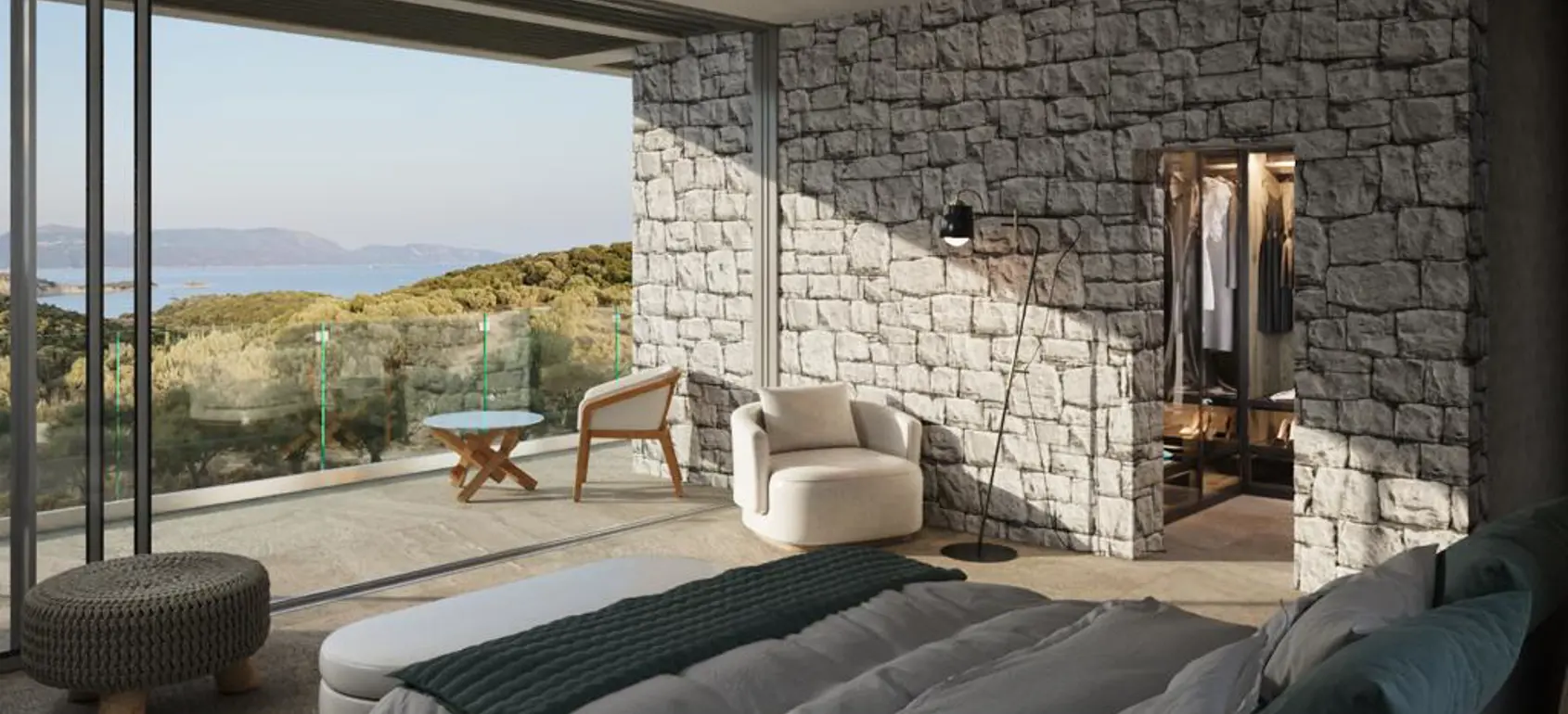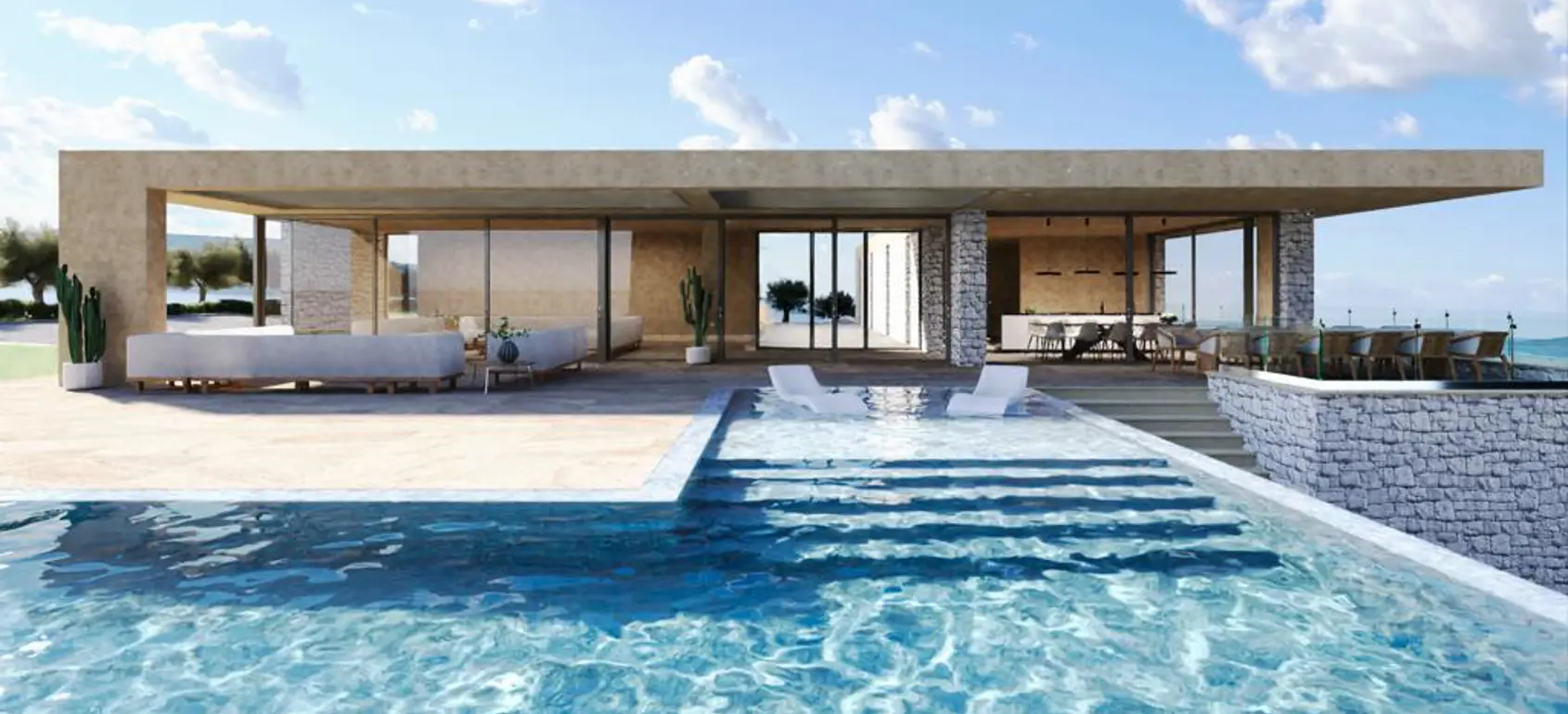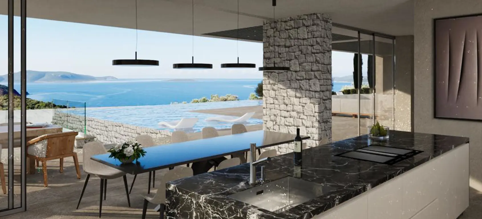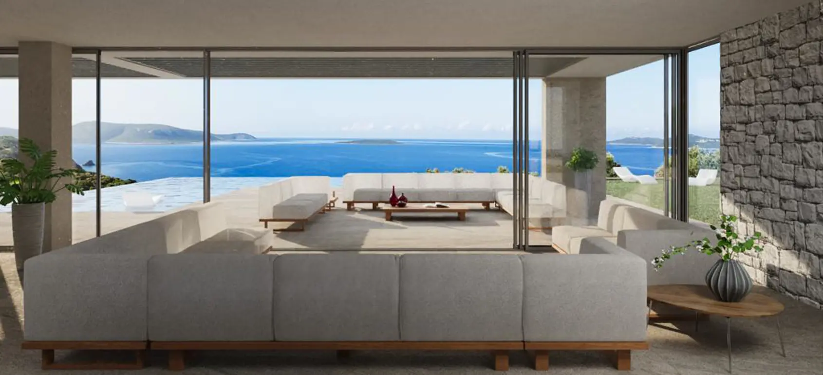 This beautiful, brand-new villa combines generous proportions with modern interior detailing. Entrance to the property is impressive. The upper level, where the reception areas and the kitchen are mainly located, is an exceptionally bright space combining floor-to-ceiling glazing and open plan living. The reception room is situated at the front of the upper-level plan, where floor-to-ceiling glazing capture the panoramic sea views. The dining area and adjoining modern kitchen have been well-designed for the practicalities of family life in mind. Each of the four bedrooms have built-in wardrobes, floor to ceiling glazing and en-suite bathrooms. From the outdoor areas and the infinity swimming pool you can gaze the sea and the small islets, while the land plot will be turned into a haven of green. The property will be fenced with alarm system as well as solar panels which will offer considerable cost savings throughout the year.