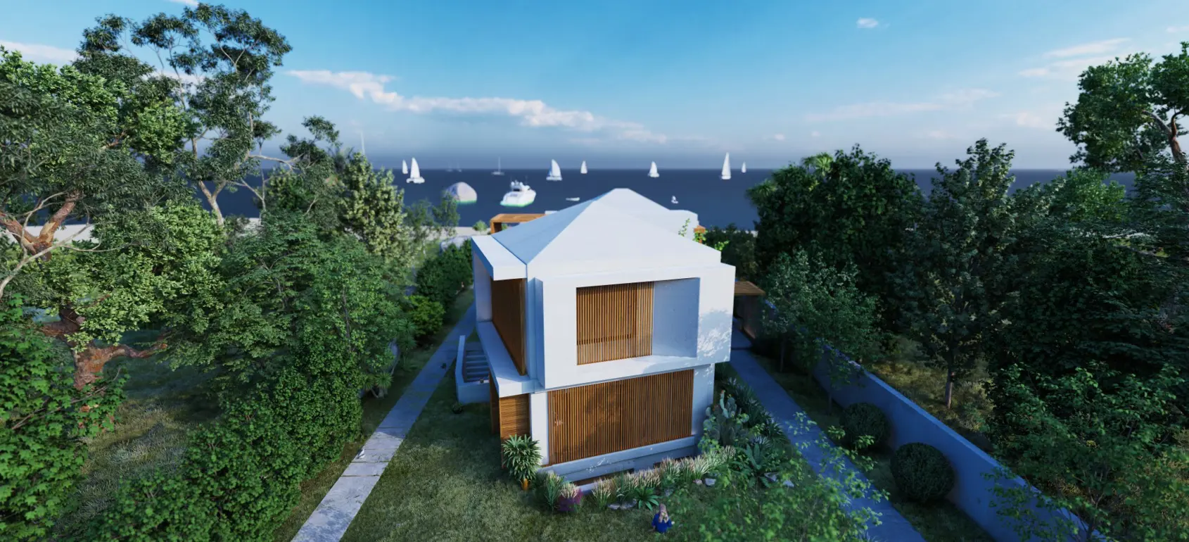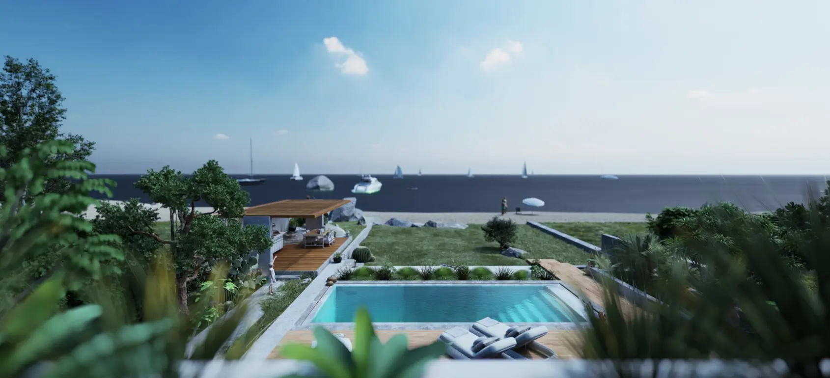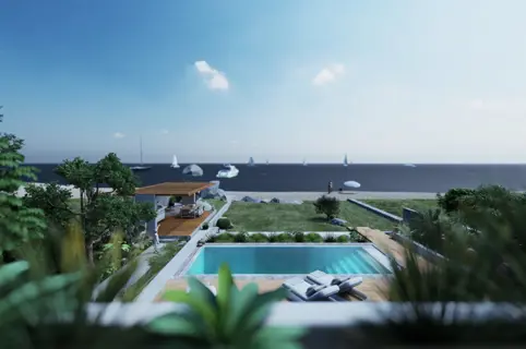 This villa is being built on a 1,820 sqm land plot adjacent to the sea. Modern aesthetics are the characteristics of this visually appealing villa.