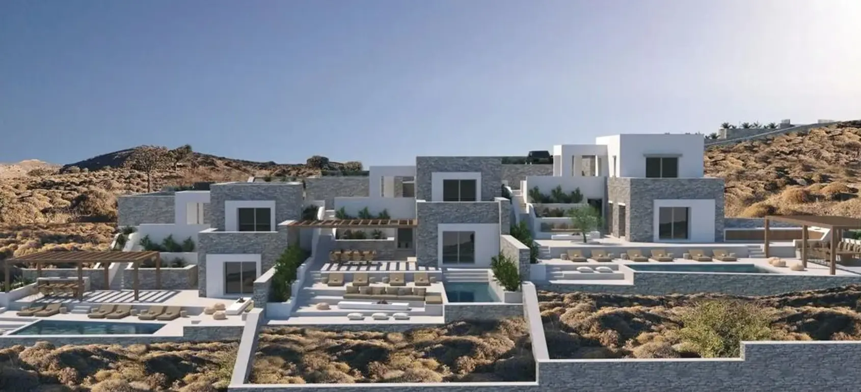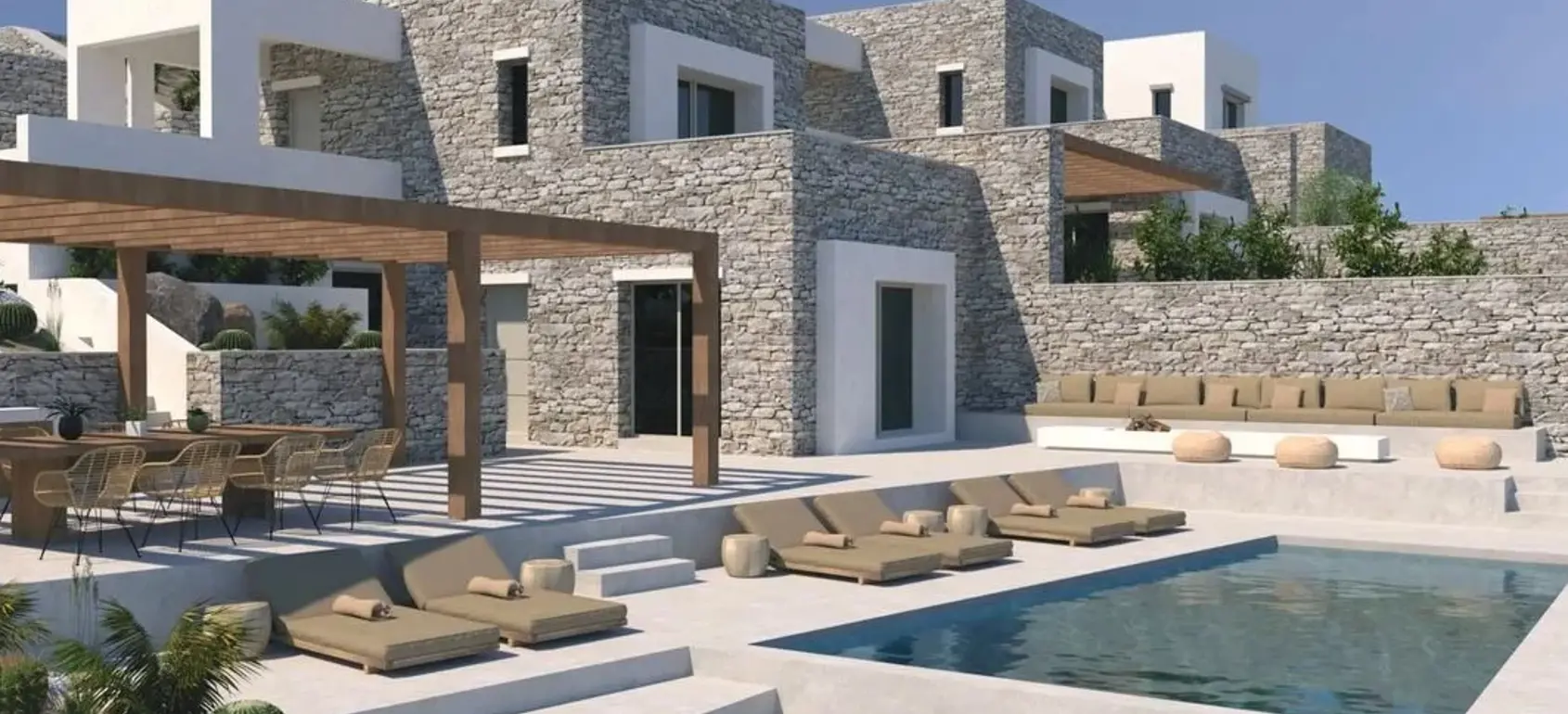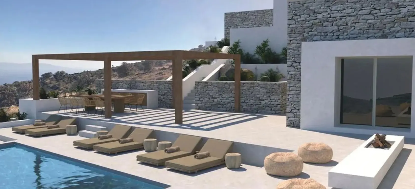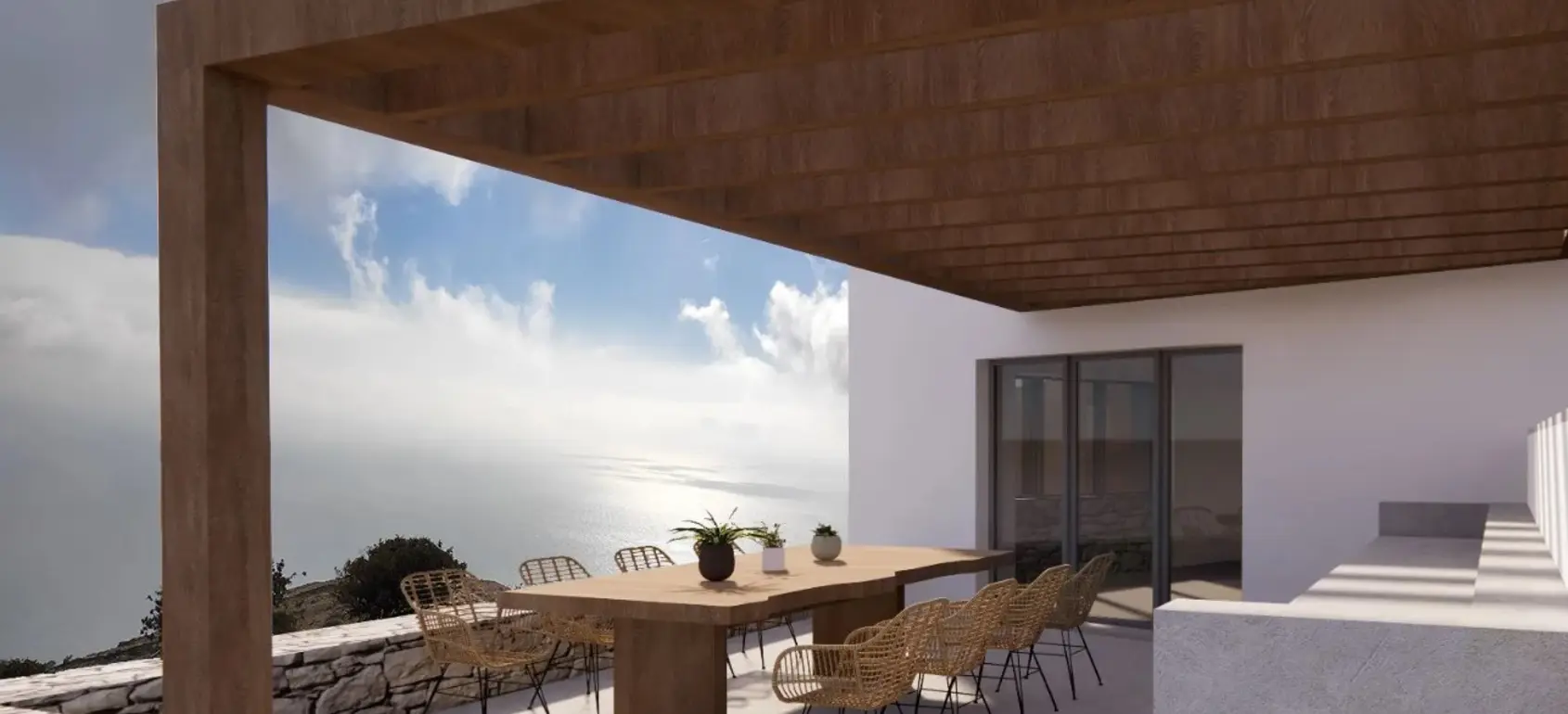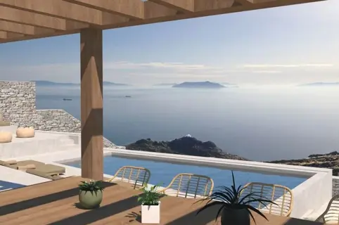 The house comprises a spacious living room with open space kitchen and two bedrooms with private bathrooms. From the outdoor area with the private swimming pool, one can enjoy magnificent panoramic views of the Aegean Sea.