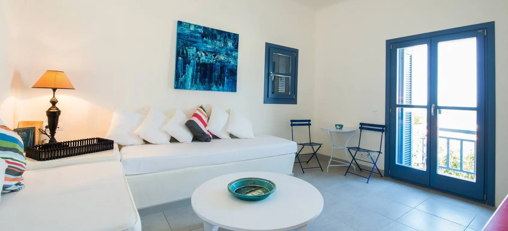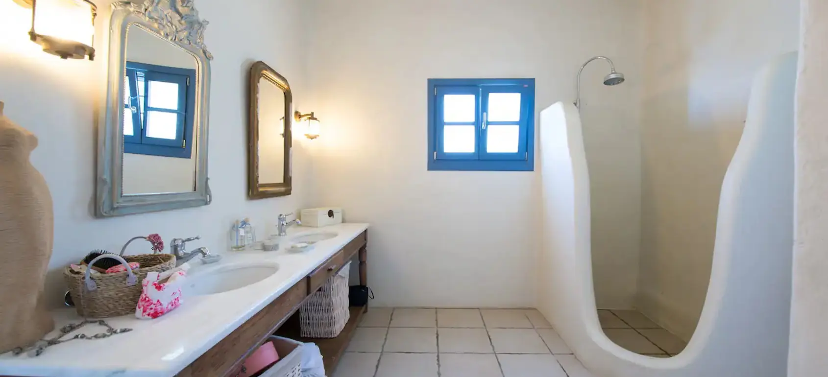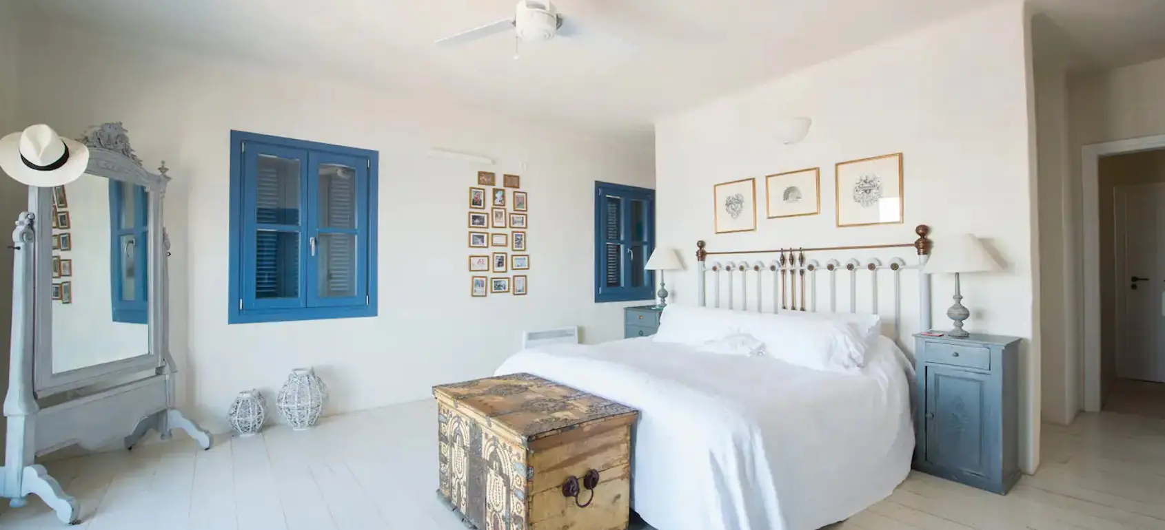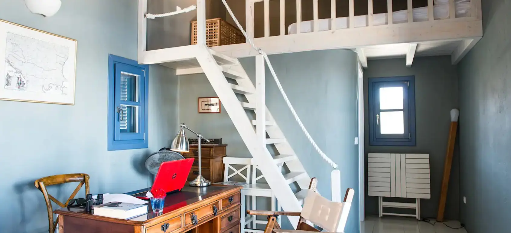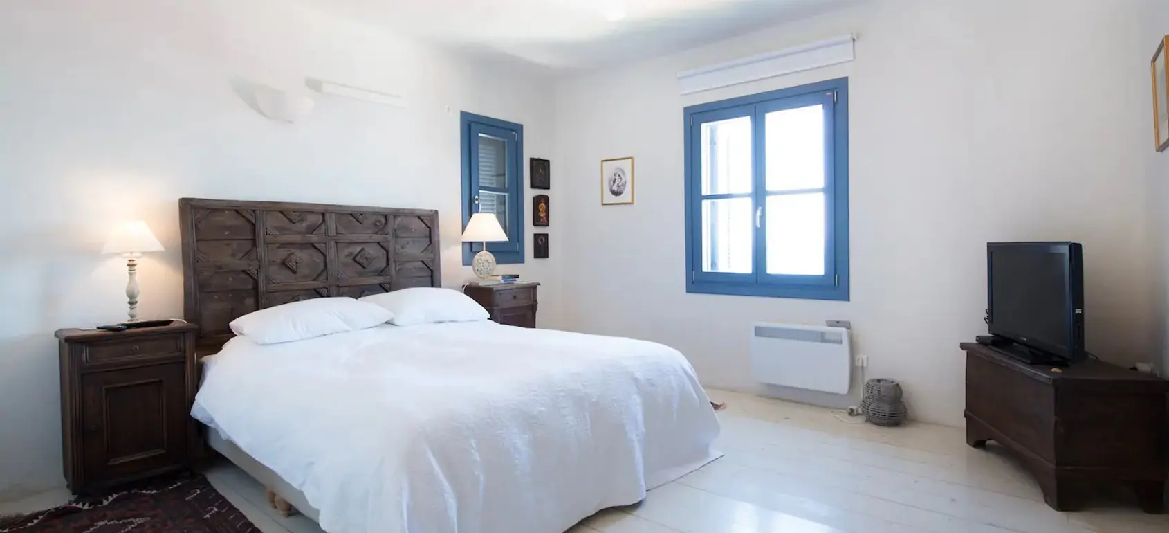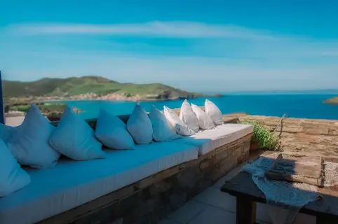 The main house is entered via a ground floor entrance with stunning views of the light house and leads to three bedrooms, all en suite . Both the master bedroom and the second bedroom open out onto separate balconies with wonderful views of the Aegean and Kea’s lighthouse. Stairs to the top floor lead to the light and airy living, dining and kitchen areas. A large terrace surrounds the top floor with unequalled views of Kea harbour. A large dining area and bbq and an outdoor cooking area offer spectacular sunsets al fresco. A separate studio/study with a bathroom and a platform gallery currently serves as an office with sleeping accommodation. The second area is an independent studio room which is reached externally and has an extra en suite bedroom with two balconies providing stunning views. The third area has been set up as a large independent apartment on the lower ground floor. It has an independent entrance from the street, five bedrooms as well as three bathrooms and provide ample spacious accommodation. It has a large well-appointed sitting room with a well equipped kitchen and double doors leading on to the long balcony which stretches the width of the house and has good views of the bay. The apartment also has access to a roof top terrace with stunning views. A utility room and a separate cellar with ample storage complete the overall building. There is also covered parking for two cars.