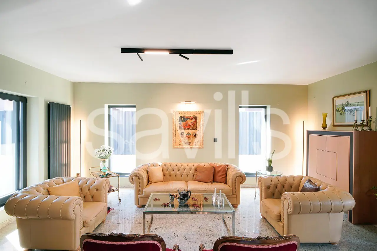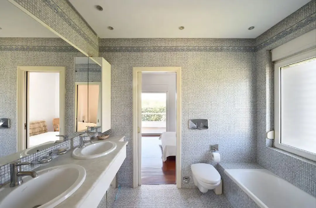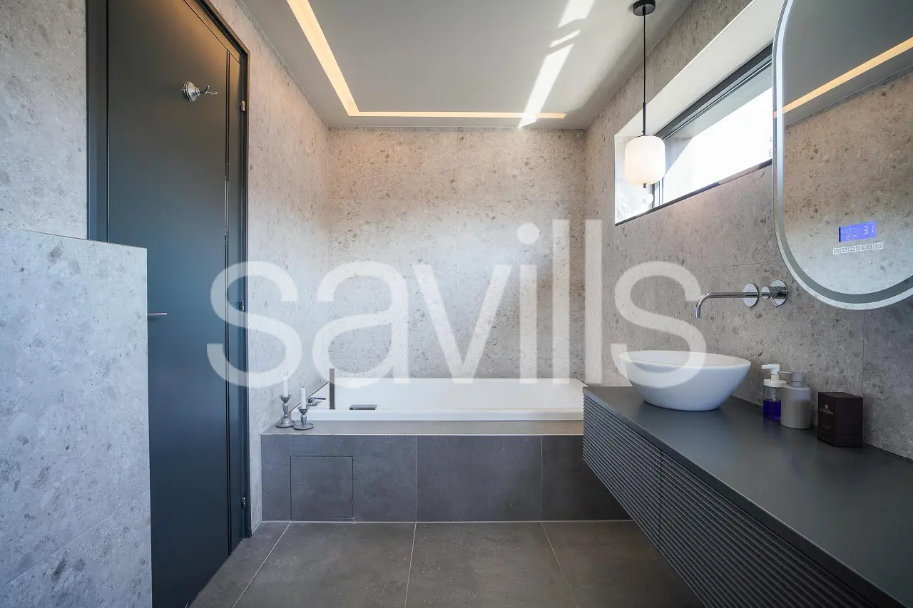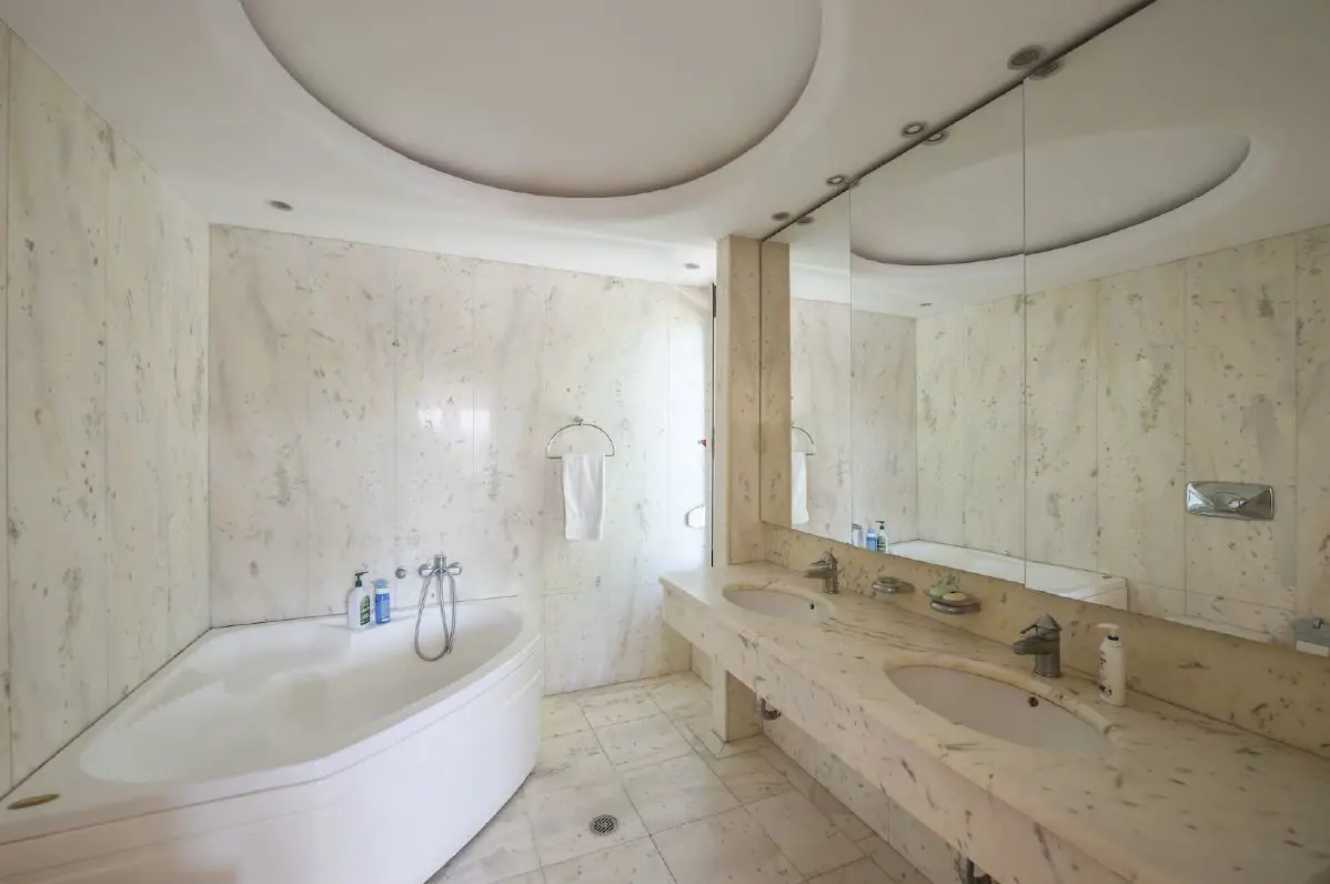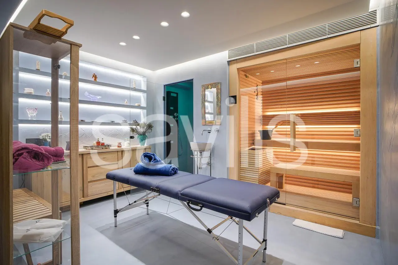 Internal accommodation extends to 600 sqm and each room has been skilfully designed to exploit the levels of natural light throughout. Inside the villa’s walls, you will find luxurious, traditional living spaces. The ground floor is composed of the living room, the dining area, the kitchen and a bathroom. There are three bedrooms and two bathrooms on the first floor, while on the lower level there is a playroom with extra kitchenette, two more bedrooms and auxiliary spaces, along with the internal swimming pool and sauna area.