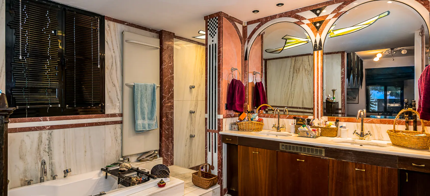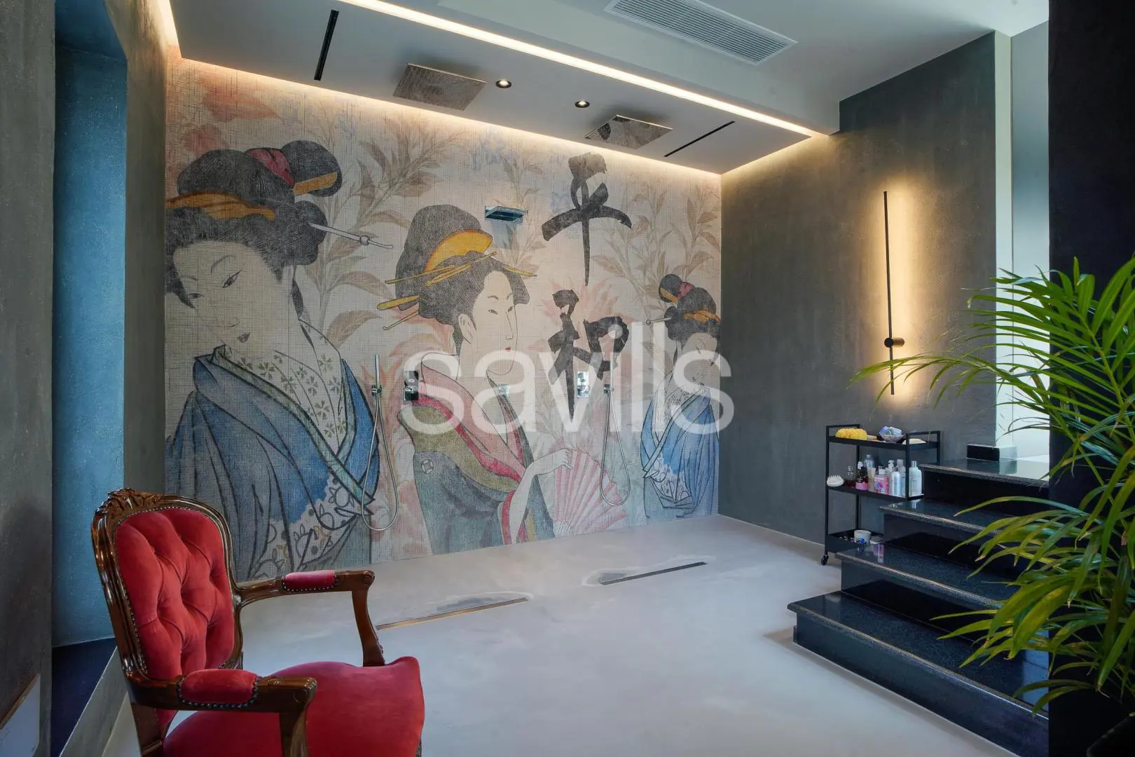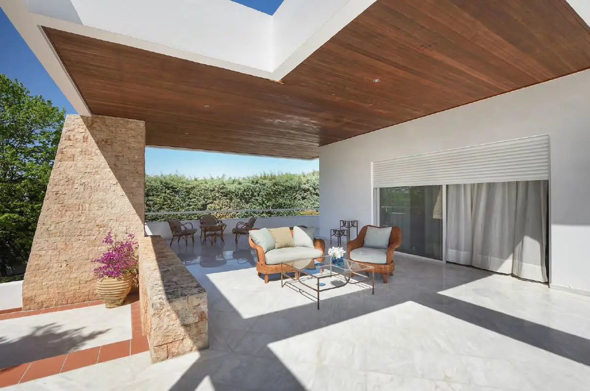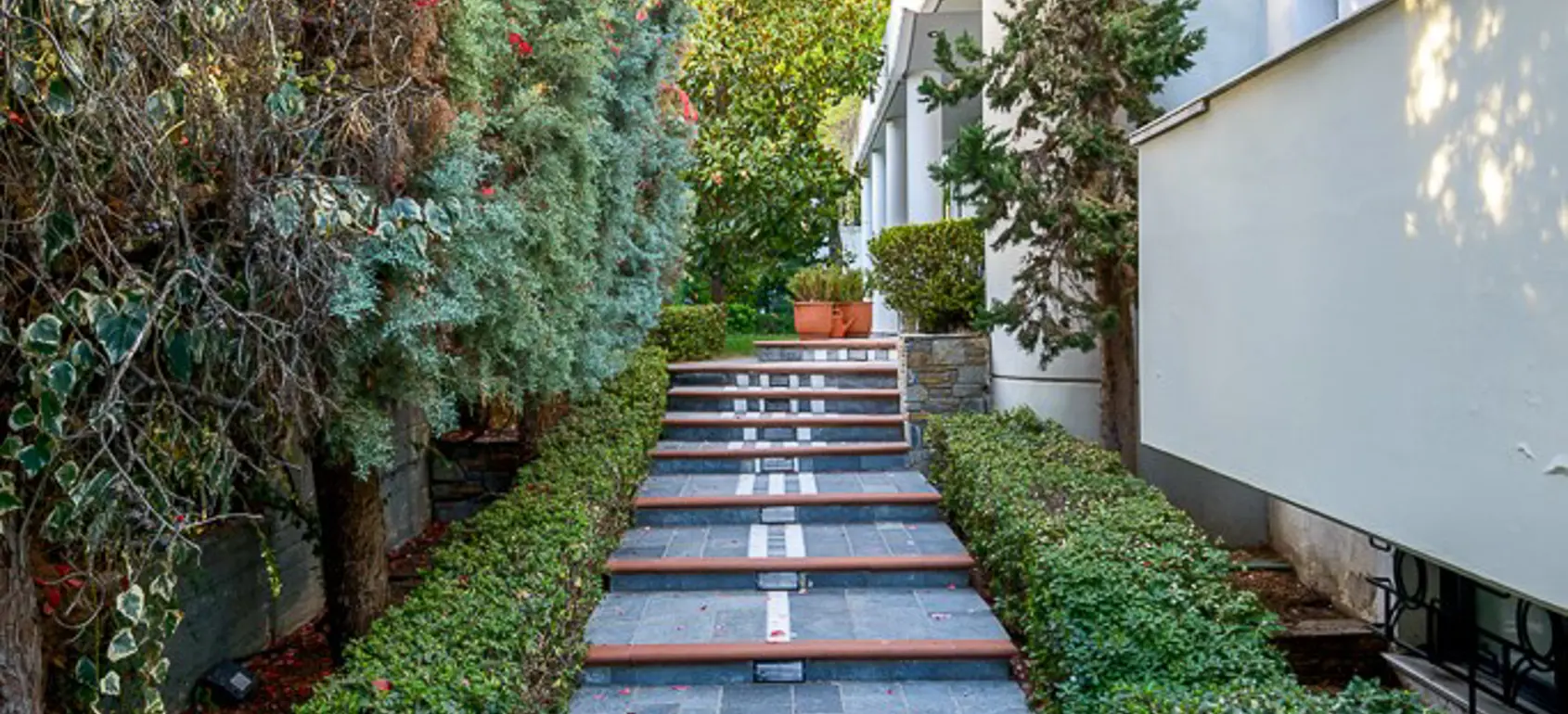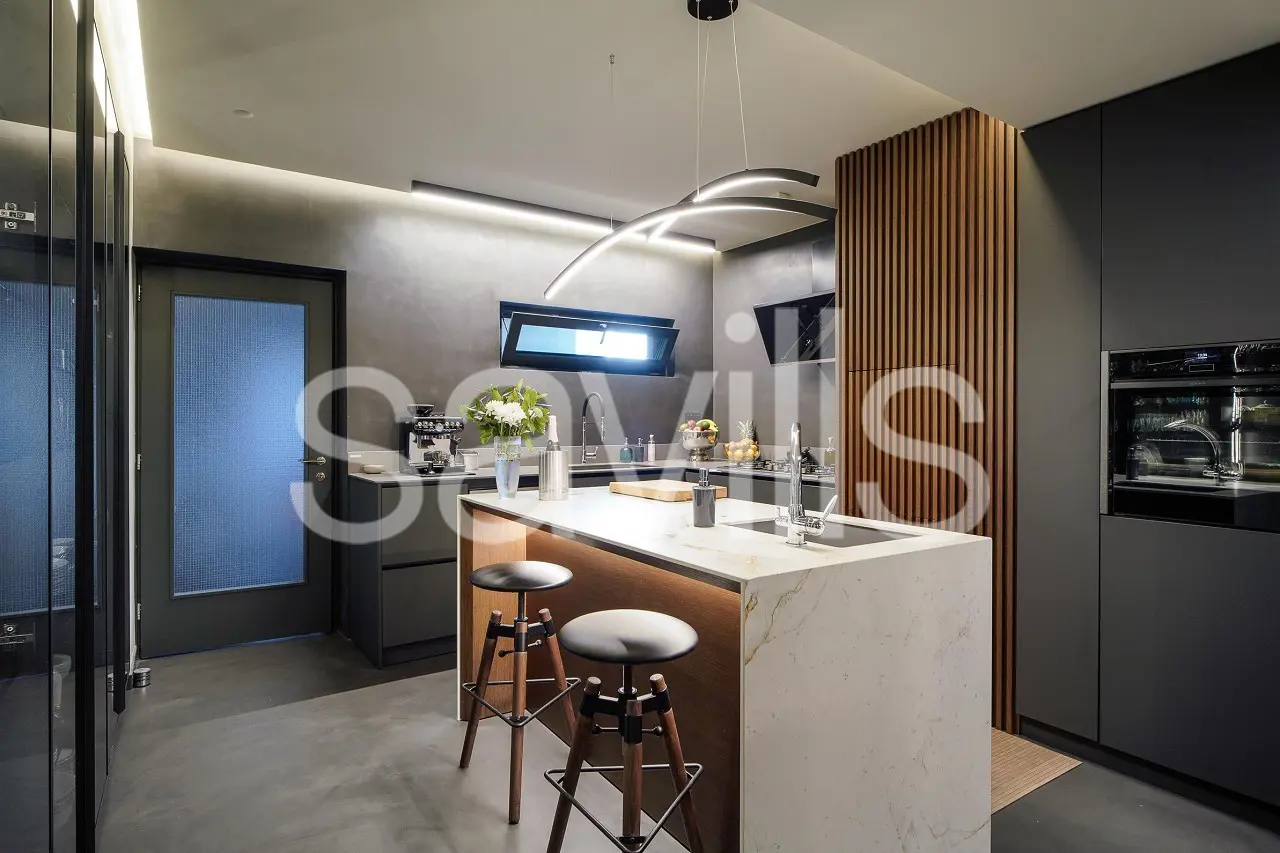 Internal accommodation extends to 600 sqm and each room has been skilfully designed to exploit the levels of natural light throughout. Inside the villa’s walls, you will find luxurious, traditional living spaces. The ground floor is composed of the living room, the dining area, the kitchen and a bathroom. There are three bedrooms and two bathrooms on the first floor, while on the lower level there is a playroom with extra kitchenette, two more bedrooms and auxiliary spaces, along with the internal swimming pool and sauna area.