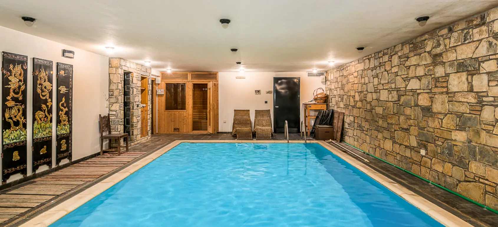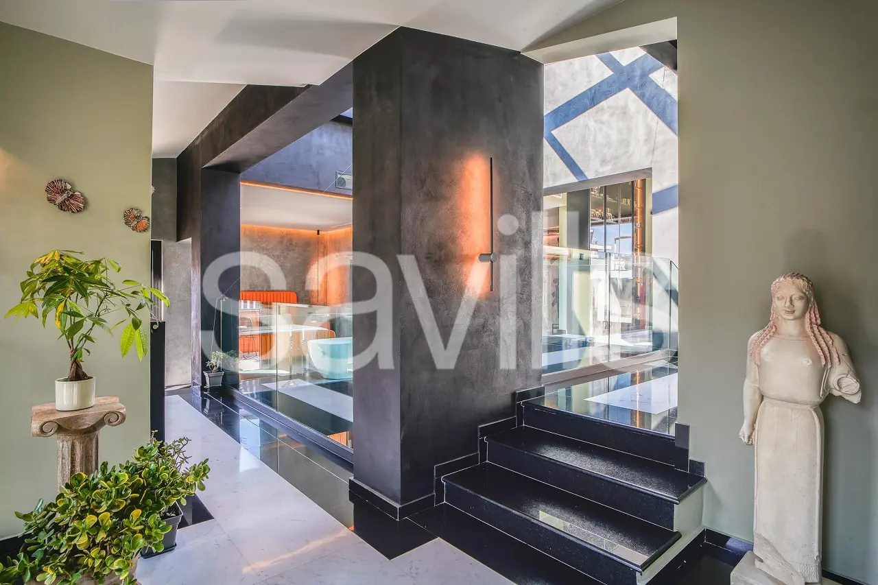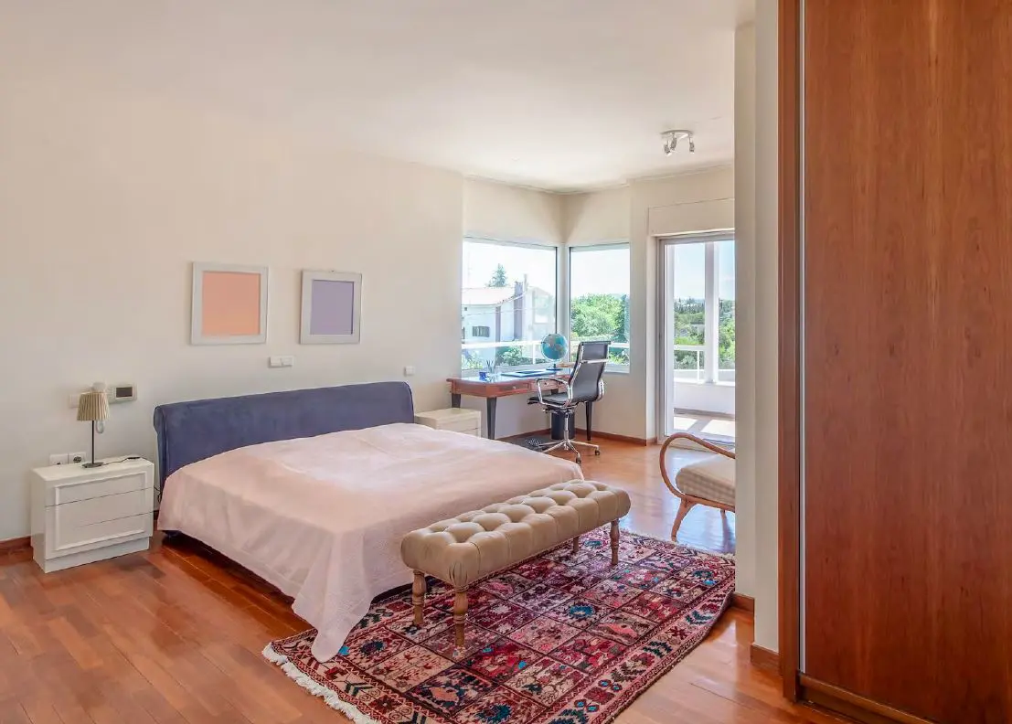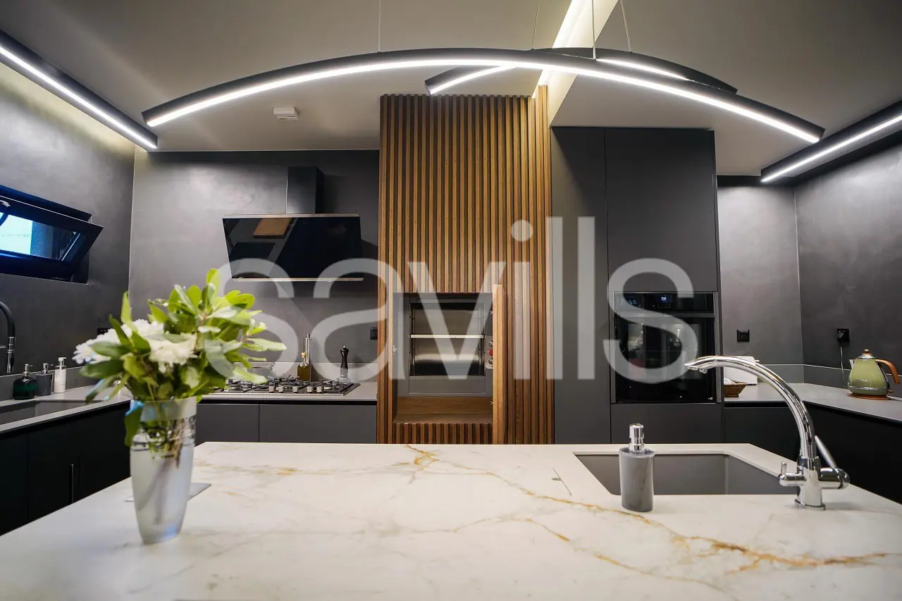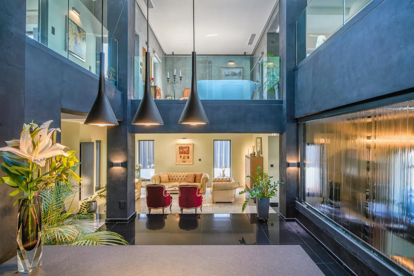 Internal accommodation extends to 600 sqm and each room has been skilfully designed to exploit the levels of natural light throughout. Inside the villa’s walls, you will find luxurious, traditional living spaces. The ground floor is composed of the living room, the dining area, the kitchen and a bathroom. There are three bedrooms and two bathrooms on the first floor, while on the lower level there is a playroom with extra kitchenette, two more bedrooms and auxiliary spaces, along with the internal swimming pool and sauna area.