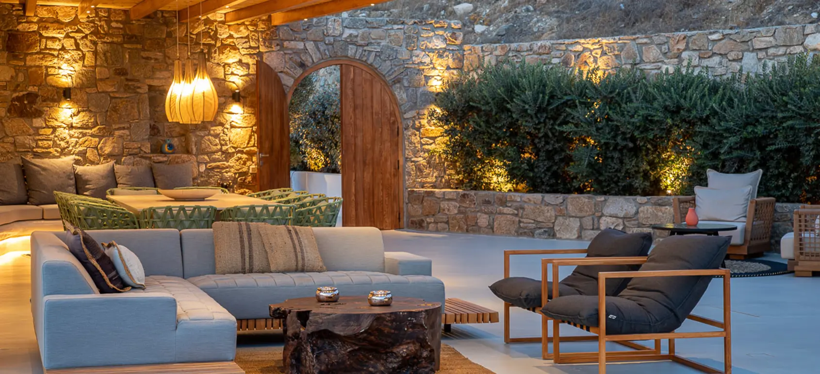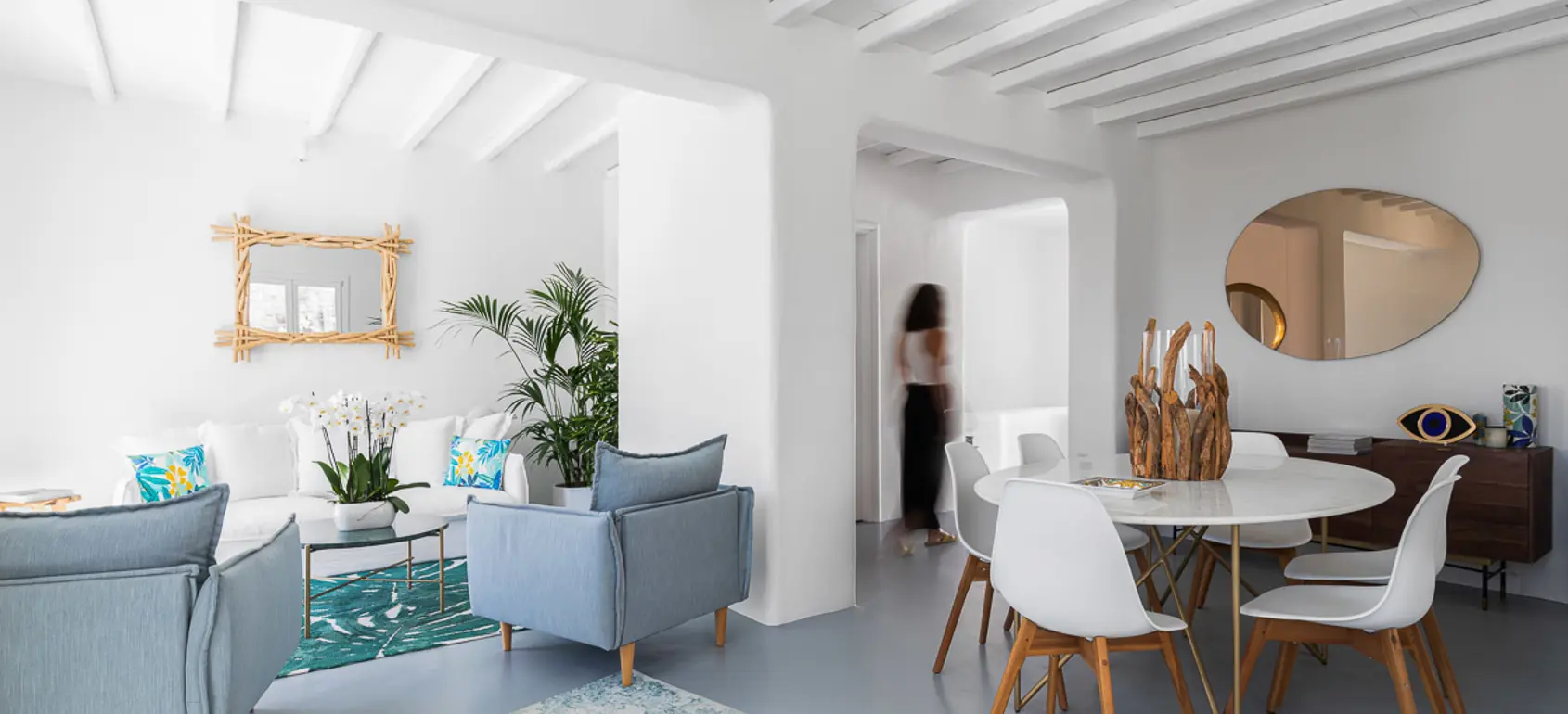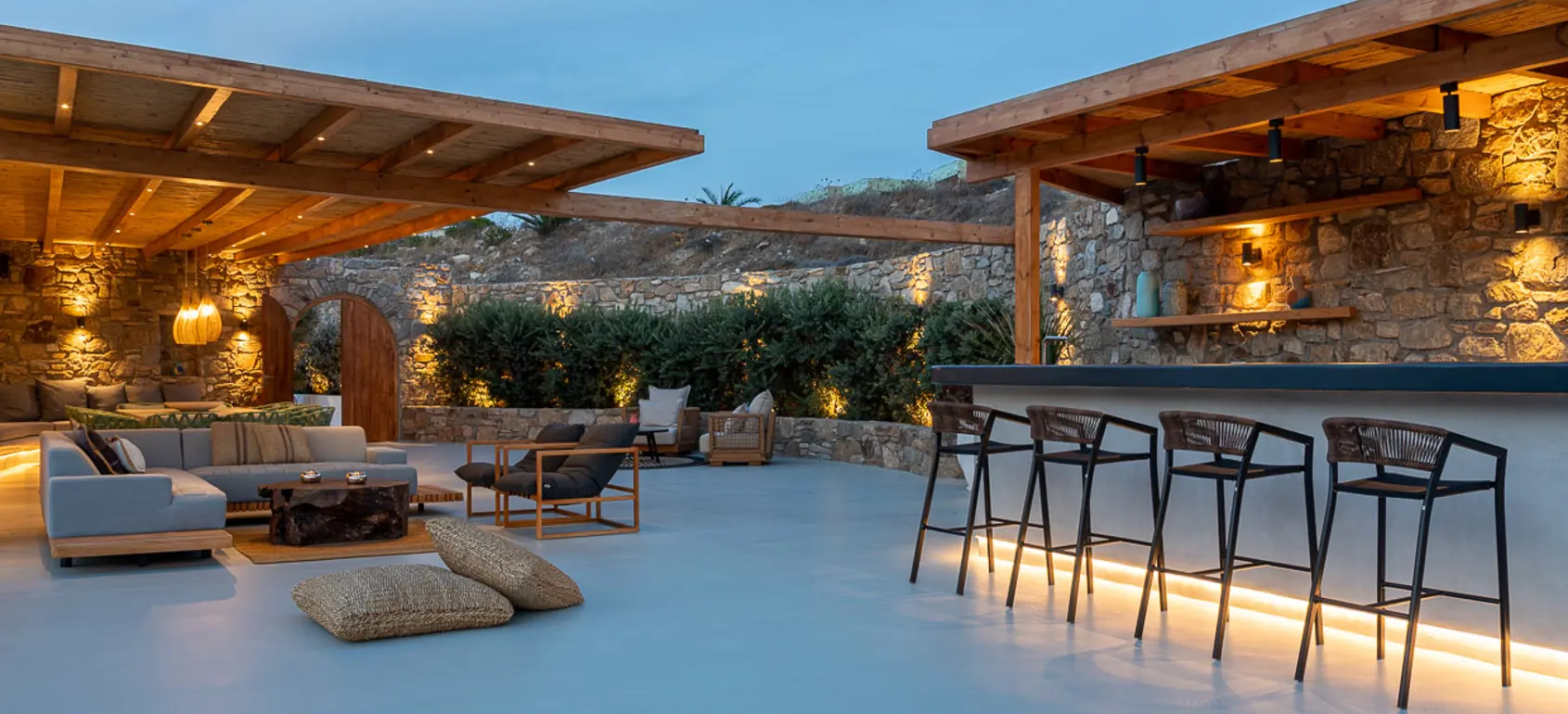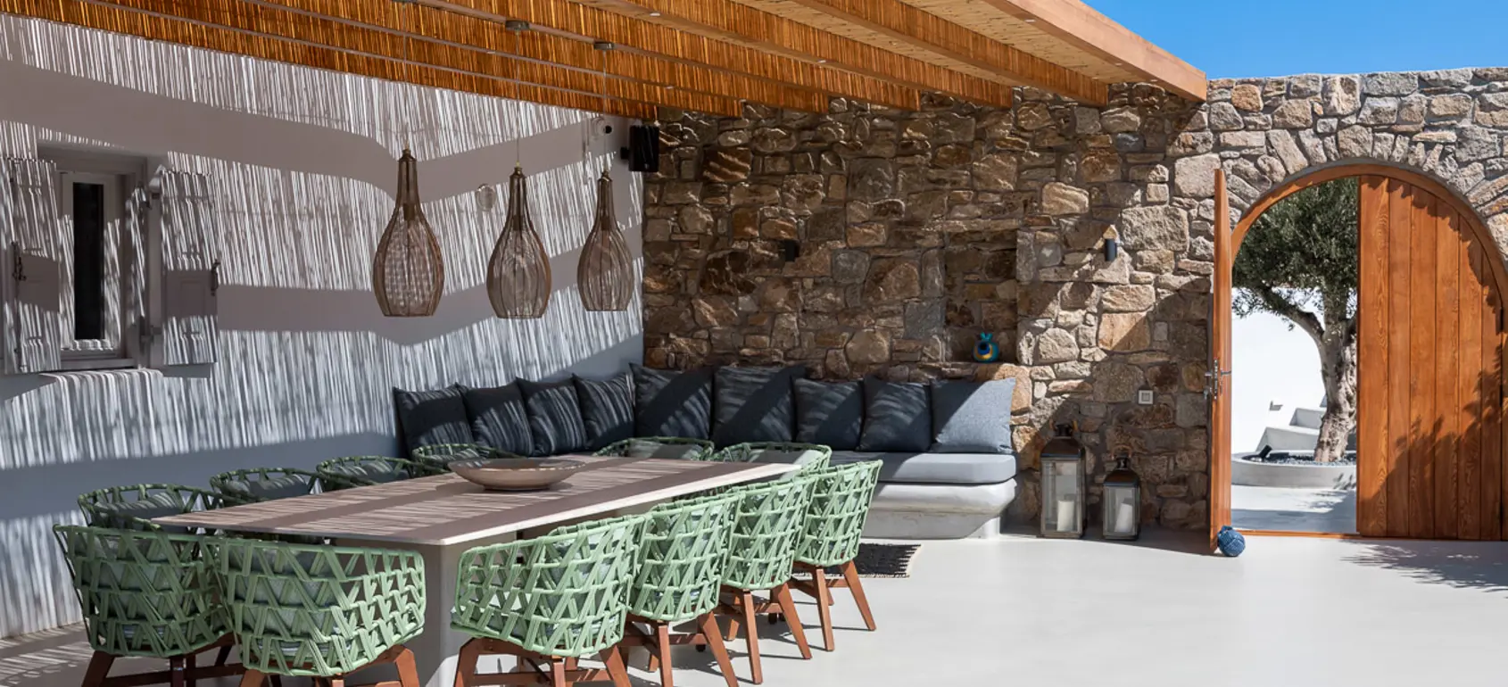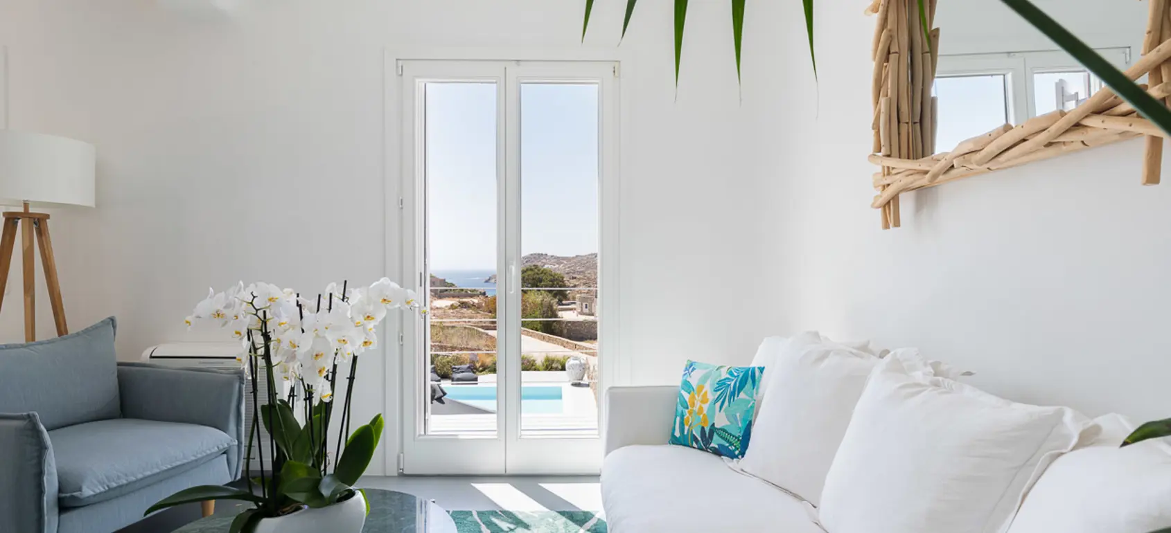Stepping outside, the terrace, accessed through a traditional large door, invites you to immerse yourself in the beauty of the location. From serene mornings on the terrace to refreshing swims, relaxing afternoon and golden-hour drinks, this residence offers everything needed to enjoy the essence of Mykonos island. The swimming pool is perfect for guests to unwind while enjoying the breathtaking landscape and sea views. Additionally, the property provides parking space and all the amenities of a modern residence.