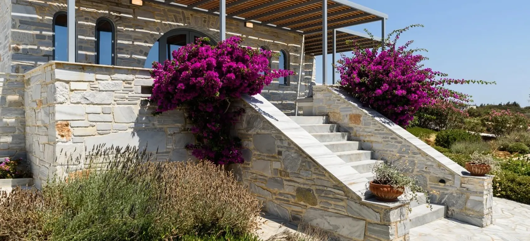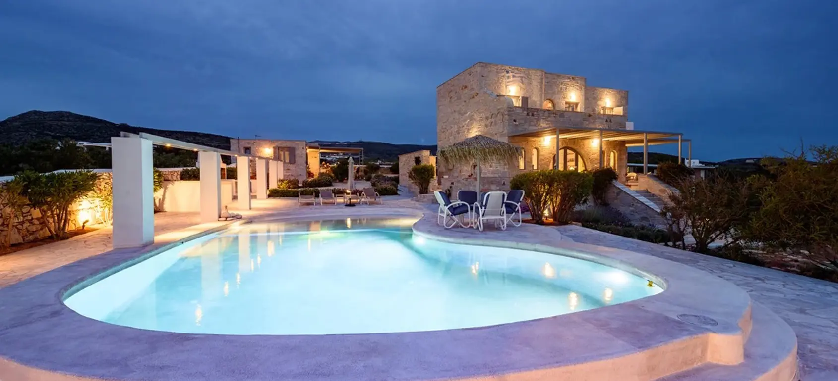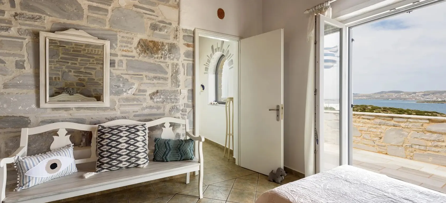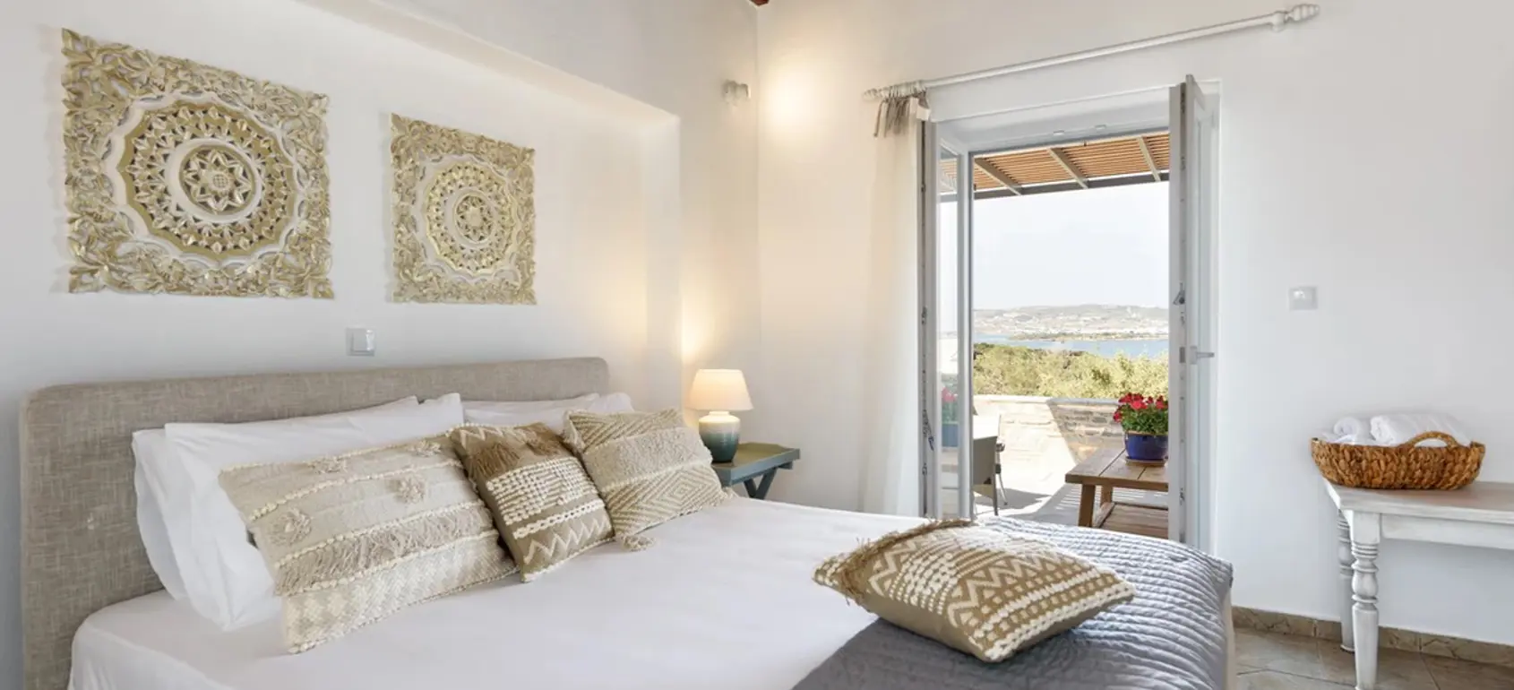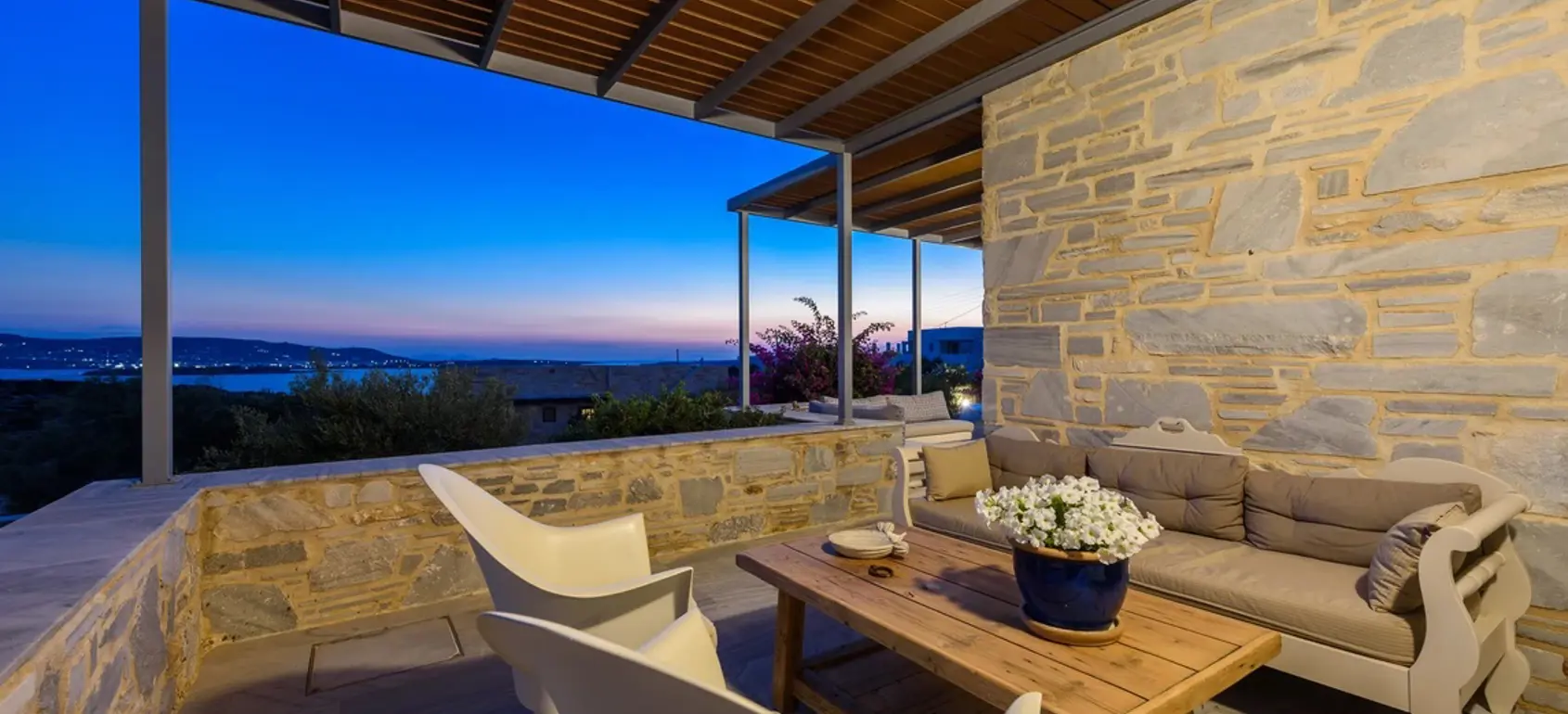 The villa is nestled in an exquisite area of Paros, offering beautiful views of the Aegean Sea and the island of Antiparos. It boasts a private, secluded small beach within just 150m, providing an unparalleled sense of tranquillity, luxurious simplicity and an enviable location.