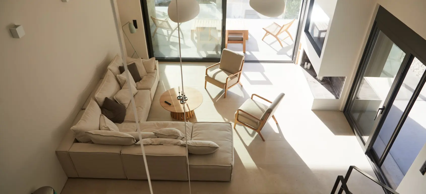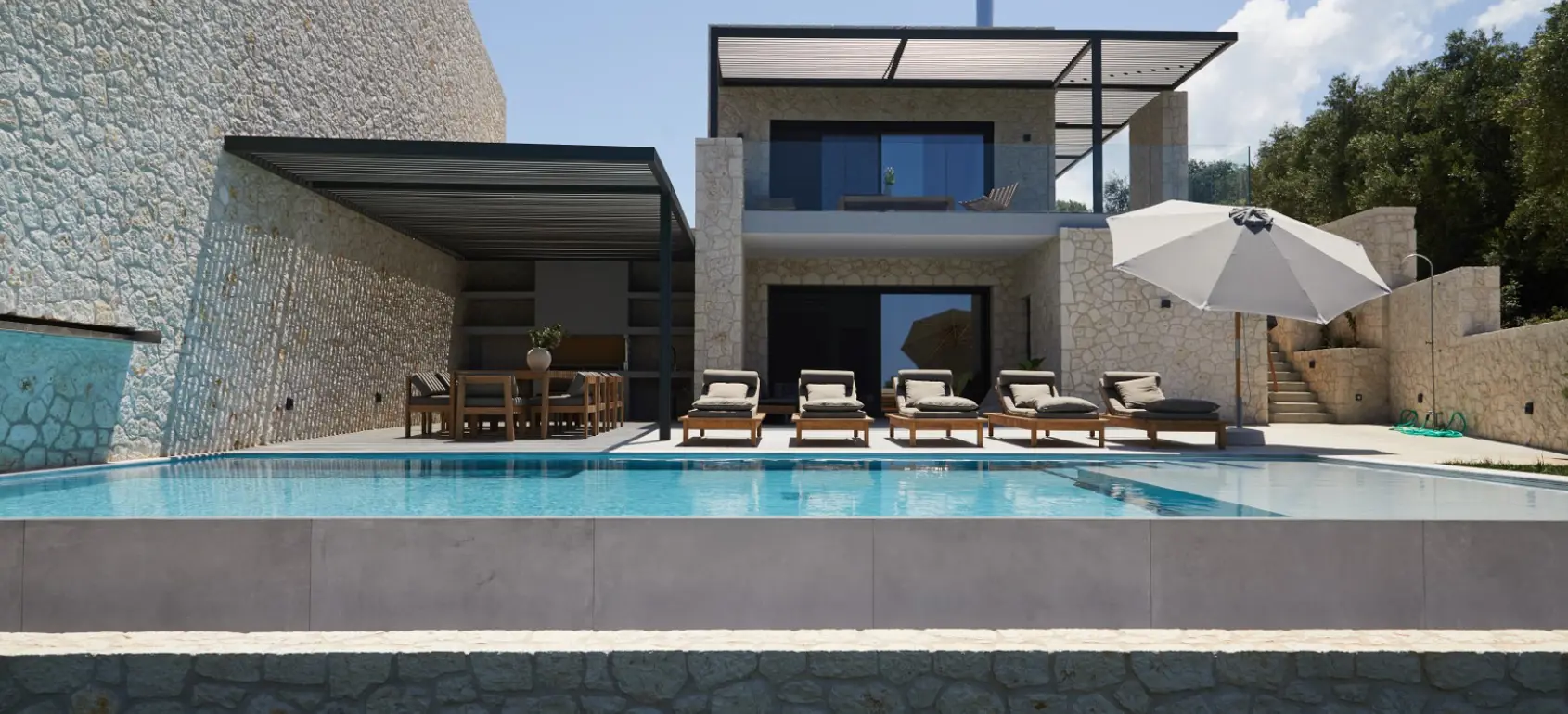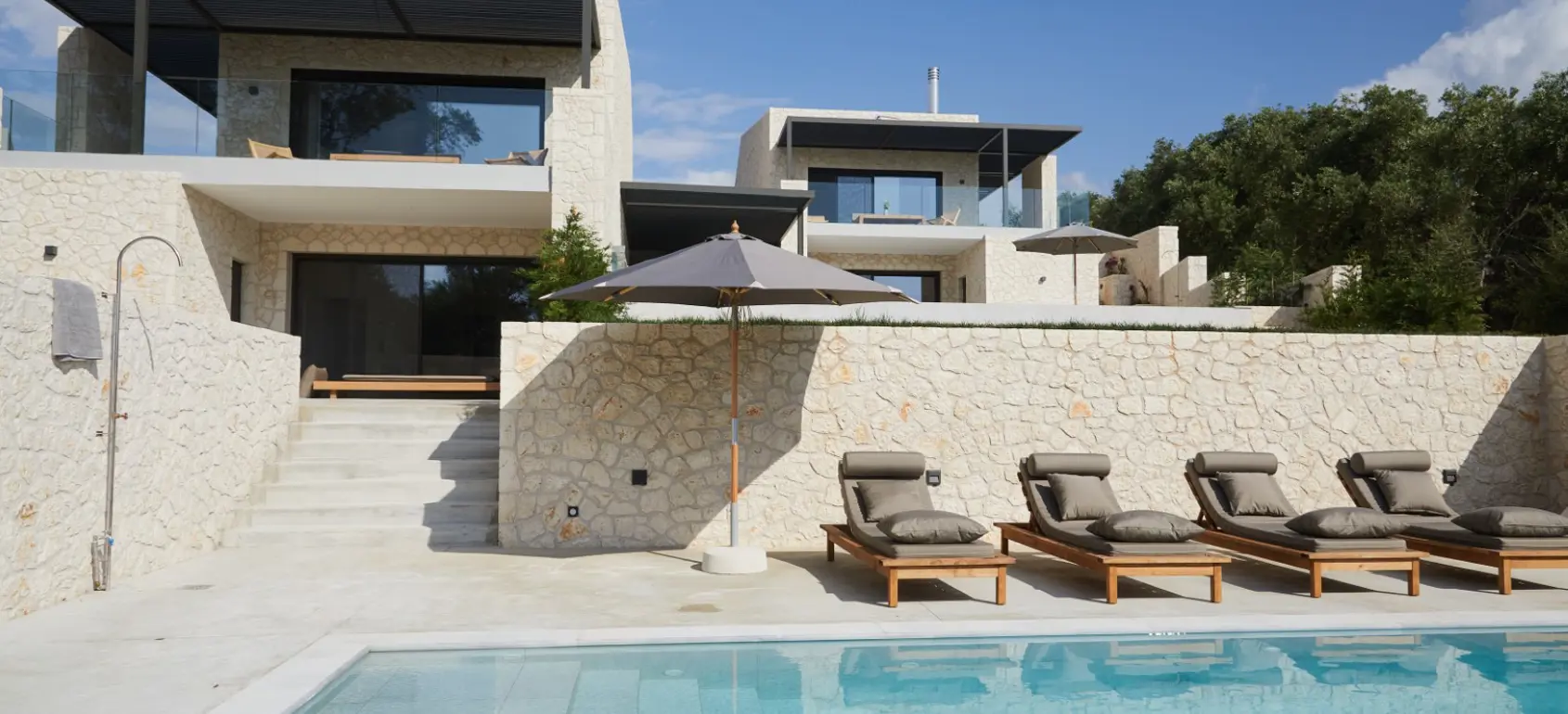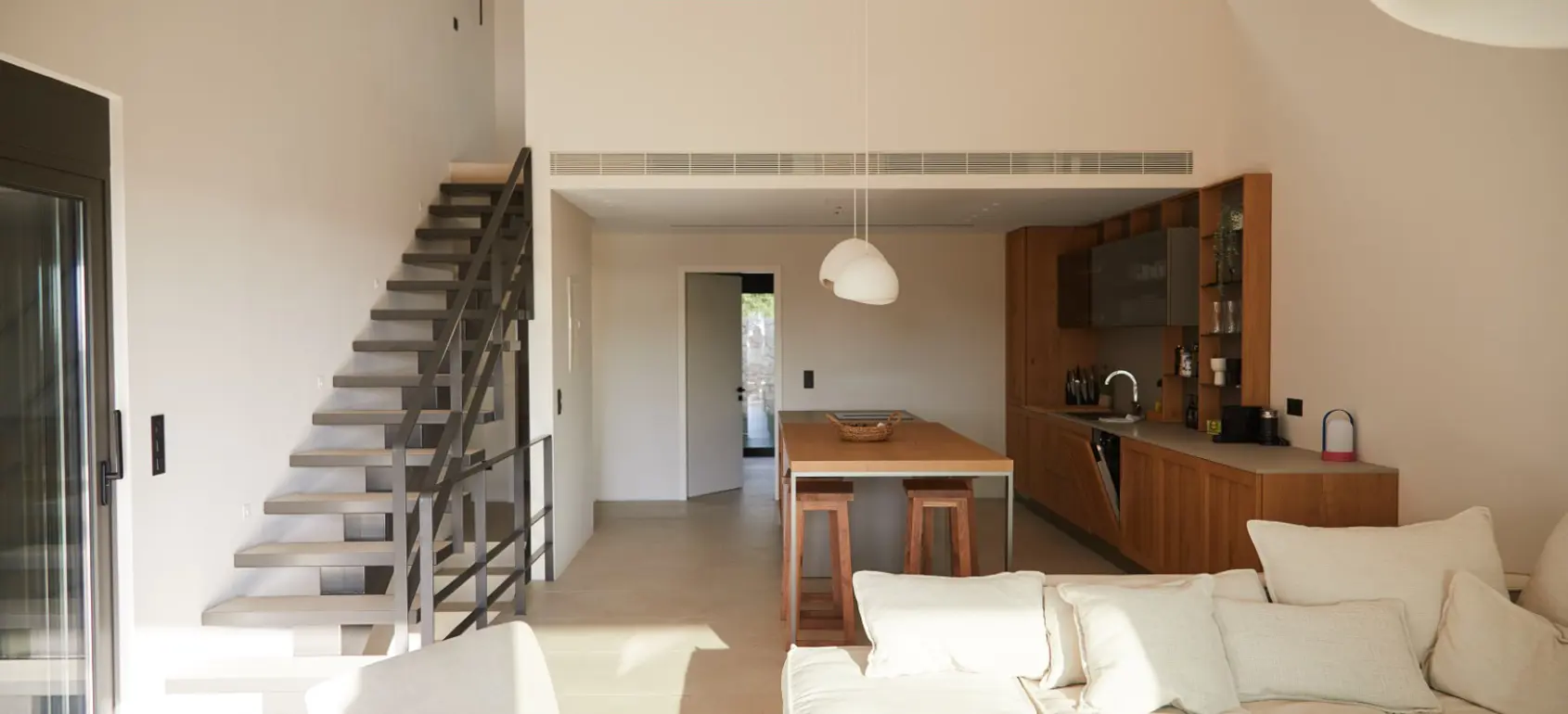A relaxing and intimate living interior and exterior space saturated with both elegance and luxury, all that, gently flowing inside of the stone walls. Here, the open plan major part of the ground floor in both villas is dedicated to the living/dining space and the kitchen, which one of the ensuite bedrooms are also located here. There are also two ensuite bedrooms positioned in the lower level of the house, while the fourth bedroom stands on the mezzanine level with its private bathroom. The villas are designed to provide privacy and give guests a sense of seclusion and tranquility. Due to the clever arrangement of the houses on the slope, each villa has privacy and is not directly visible from the other villa.