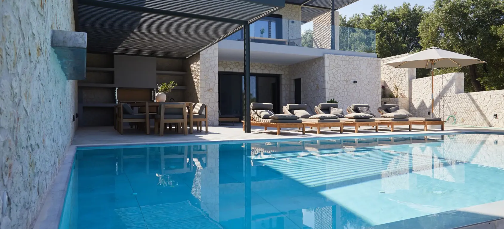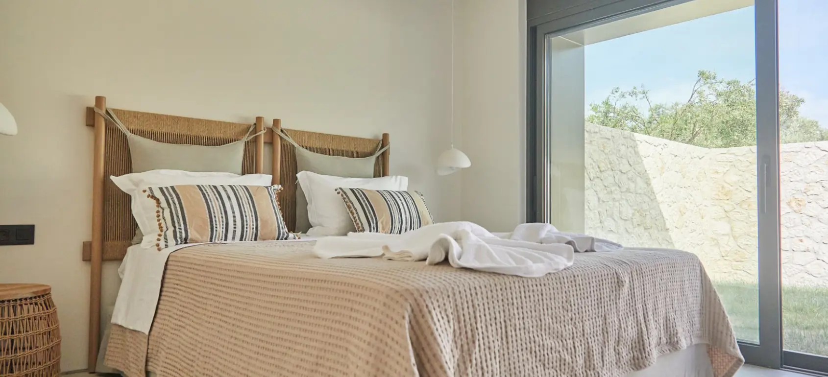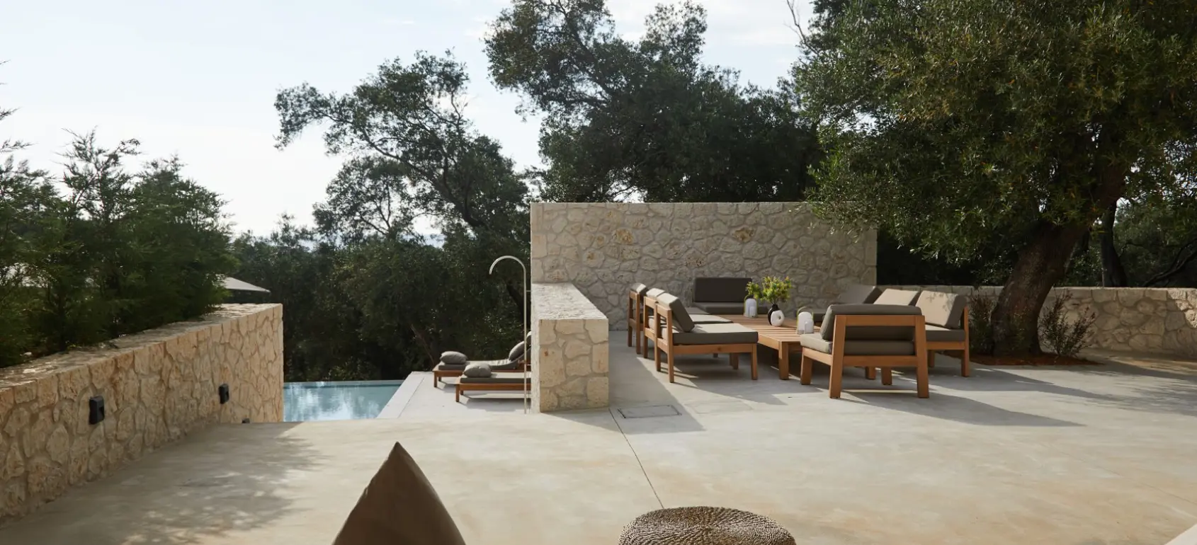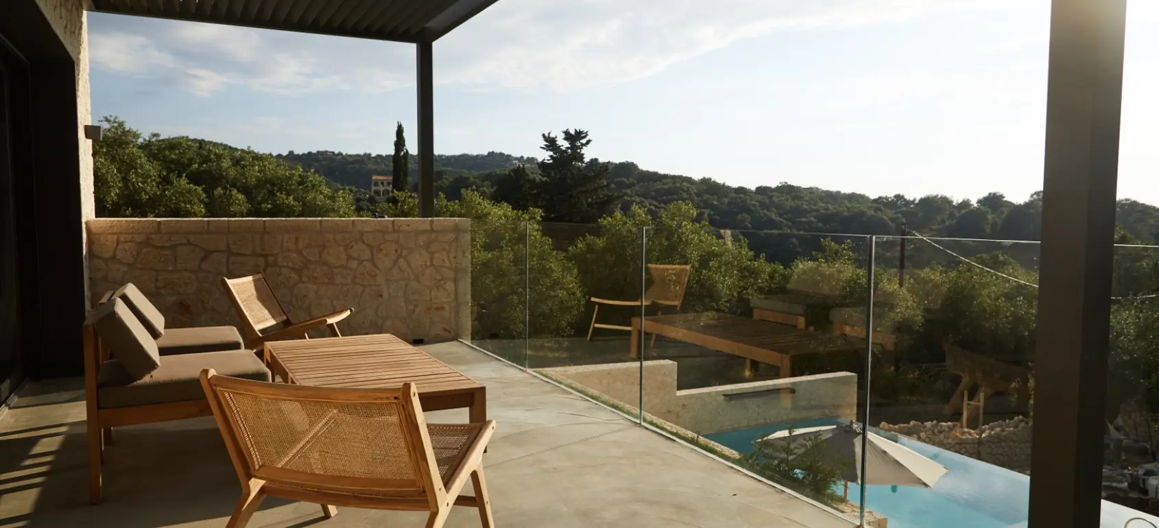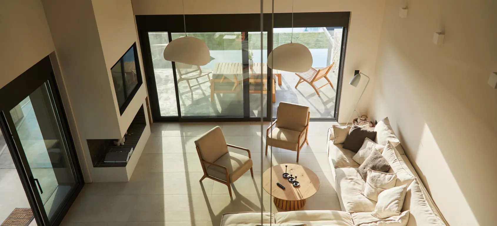 A relaxing and intimate living interior and exterior space saturated with both elegance and luxury, all that, gently flowing inside of the stone walls. Here, the open plan major part of the ground floor in both villas is dedicated to the living/dining space and the kitchen, which one of the ensuite bedrooms are also located here. There are also two ensuite bedrooms positioned in the lower level of the house, while the fourth bedroom stands on the mezzanine level with its private bathroom. The villas are designed to provide privacy and give guests a sense of seclusion and tranquility. Due to the clever arrangement of the houses on the slope, each villa has privacy and is not directly visible from the other villa.