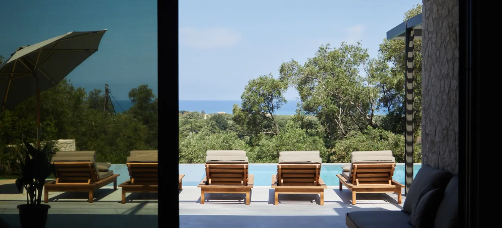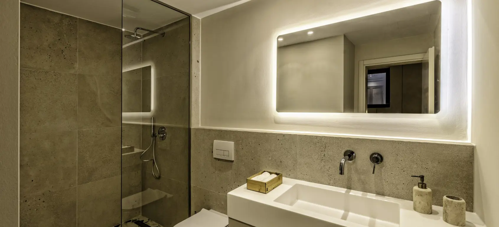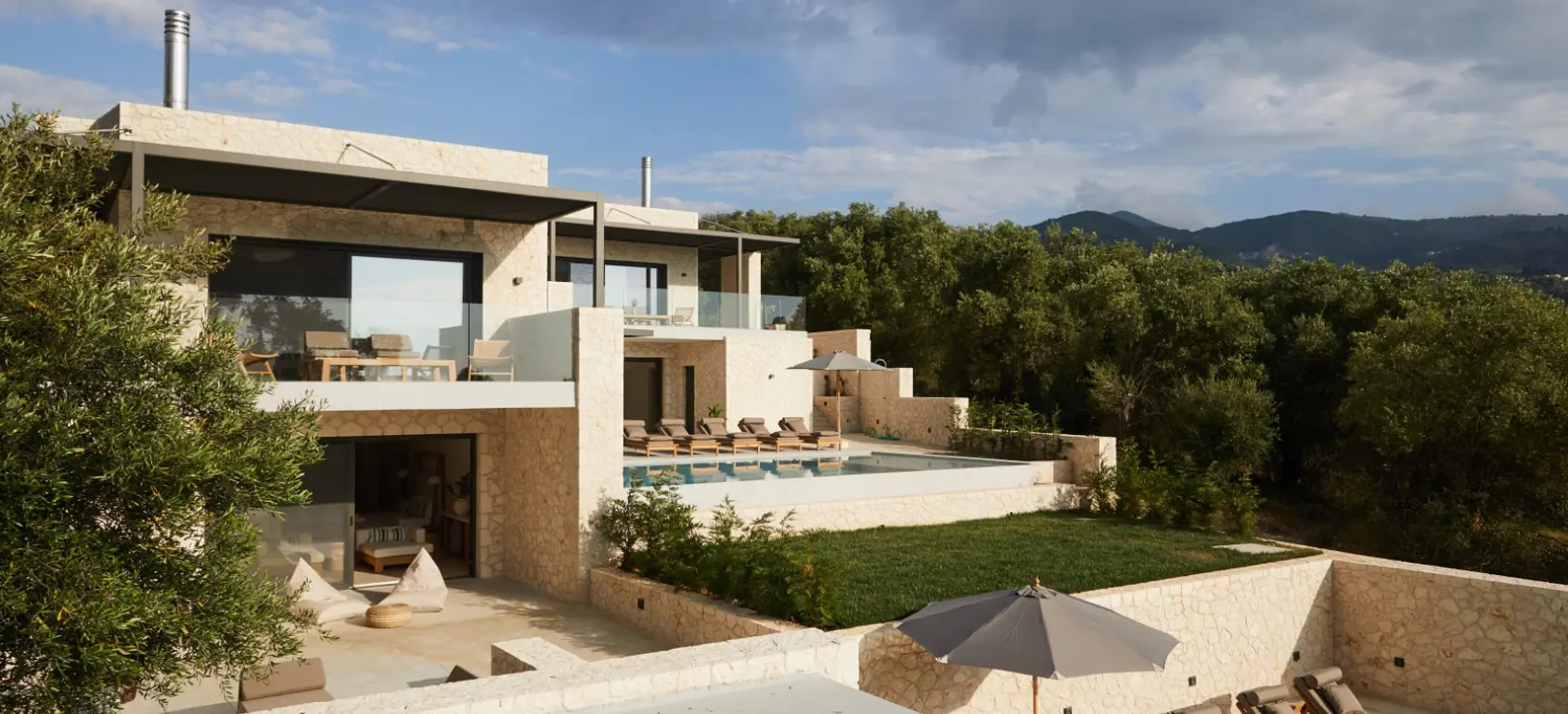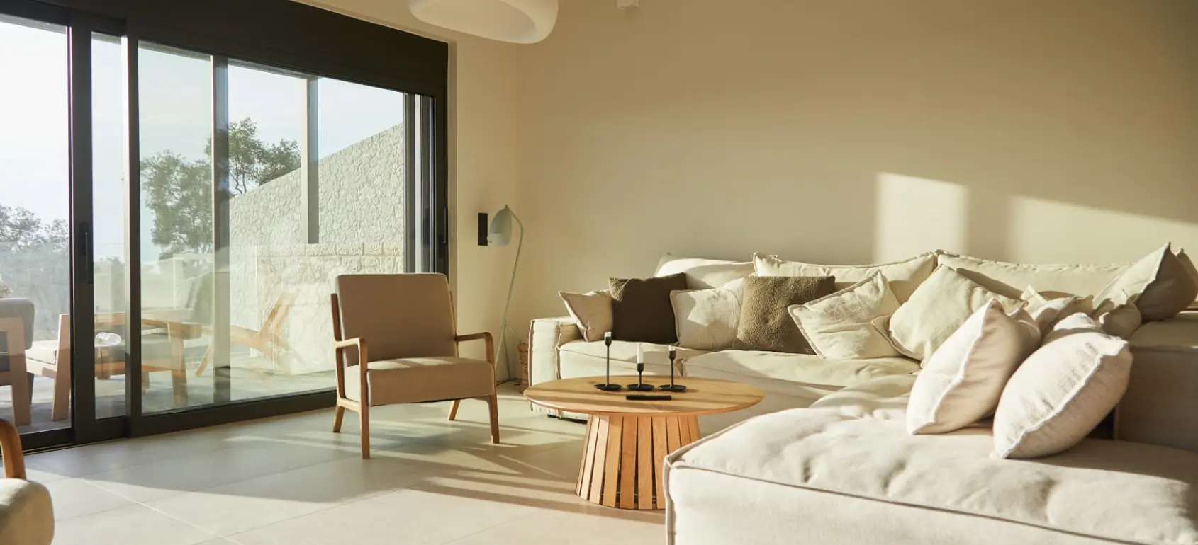 A relaxing and intimate living interior and exterior space saturated with both elegance and luxury, all that, gently flowing inside of the stone walls. Here, the open plan major part of the ground floor in both villas is dedicated to the living/dining space and the kitchen, which one of the ensuite bedrooms are also located here. There are also two ensuite bedrooms positioned in the lower level of the house, while the fourth bedroom stands on the mezzanine level with its private bathroom. The villas are designed to provide privacy and give guests a sense of seclusion and tranquility. Due to the clever arrangement of the houses on the slope, each villa has privacy and is not directly visible from the other villa.