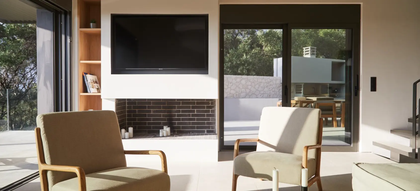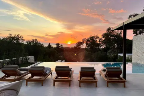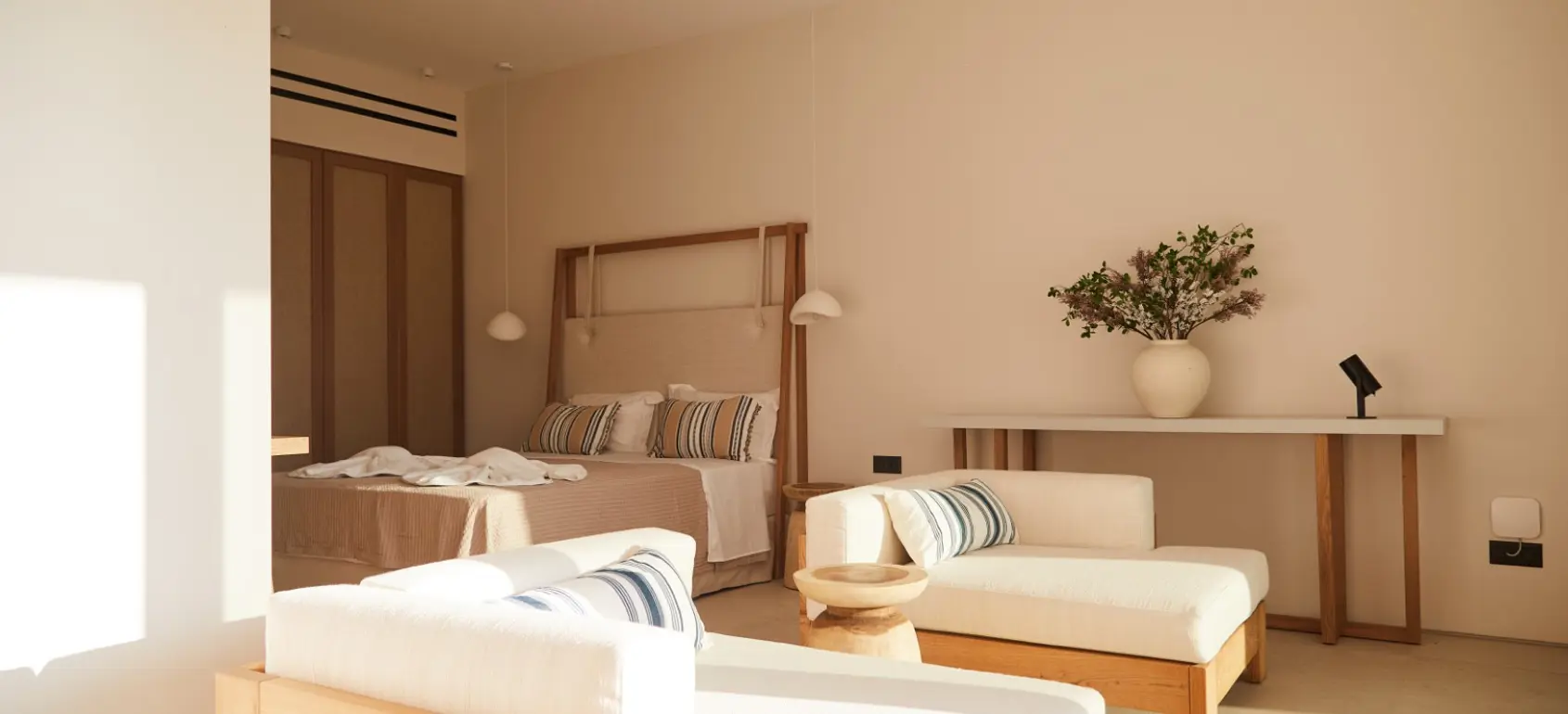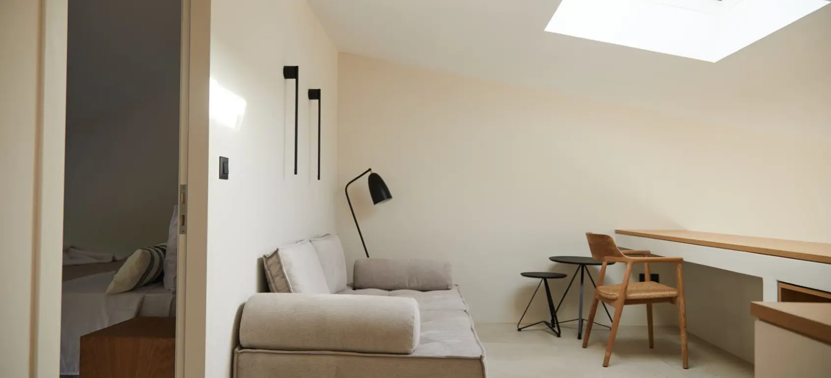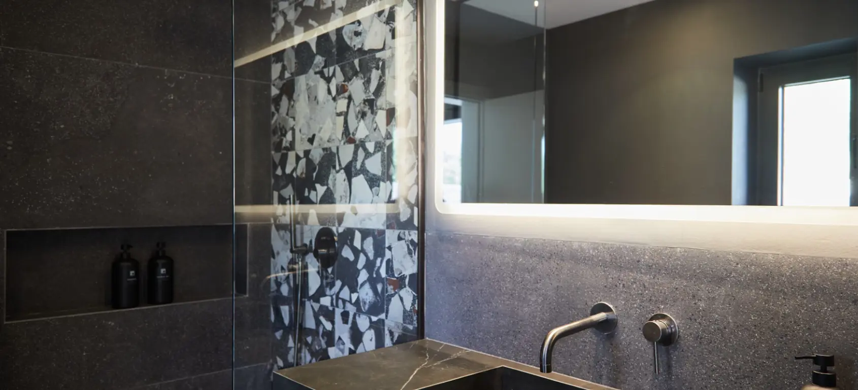 A relaxing and intimate living interior and exterior space saturated with both elegance and luxury, all that, gently flowing inside of the stone walls. Here, the open plan major part of the ground floor in both villas is dedicated to the living/dining space and the kitchen, which one of the ensuite bedrooms are also located here. There are also two ensuite bedrooms positioned in the lower level of the house, while the fourth bedroom stands on the mezzanine level with its private bathroom. The villas are designed to provide privacy and give guests a sense of seclusion and tranquility. Due to the clever arrangement of the houses on the slope, each villa has privacy and is not directly visible from the other villa.