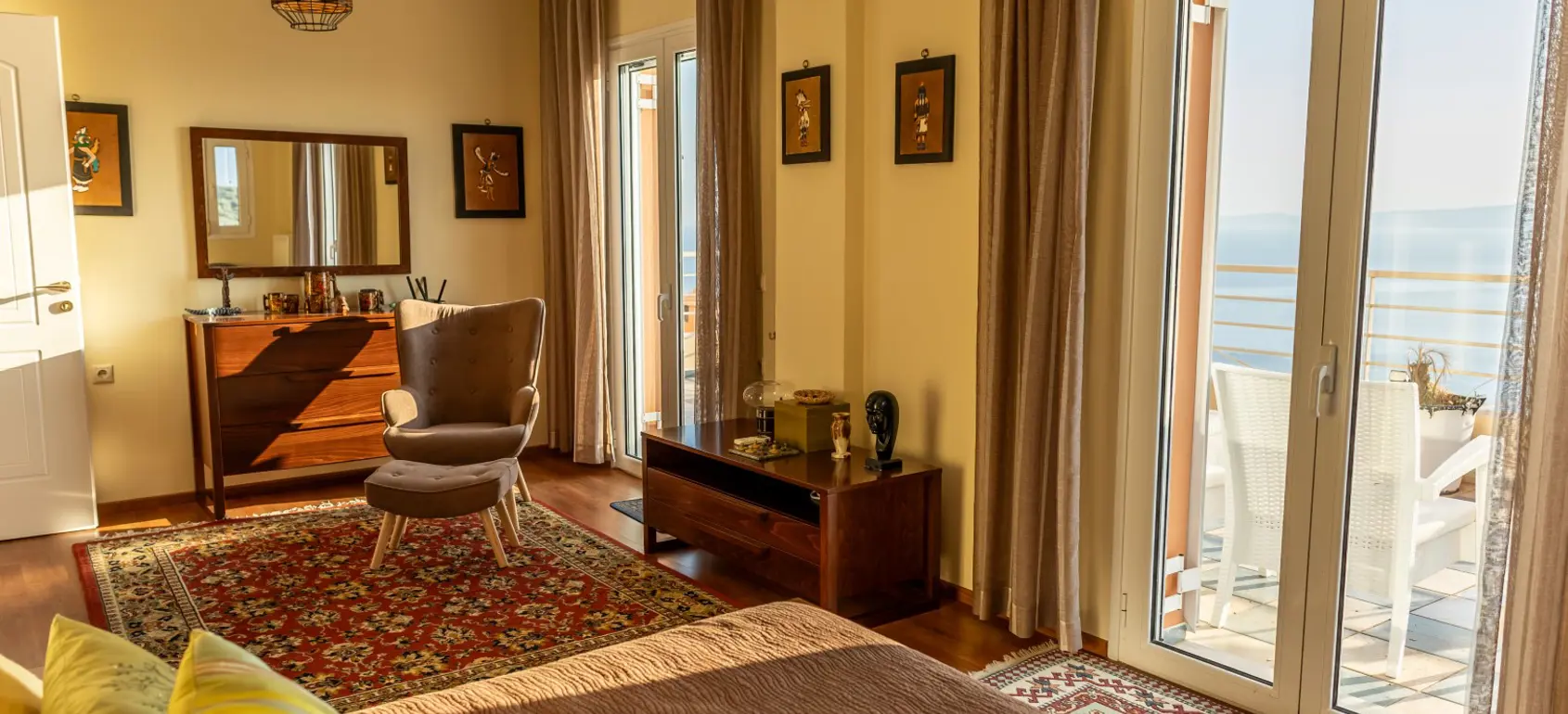 As you arrive at the villa you will be greeted by breathtaking vistas of azure waters and the Messinian Gulf and Kalamata town.