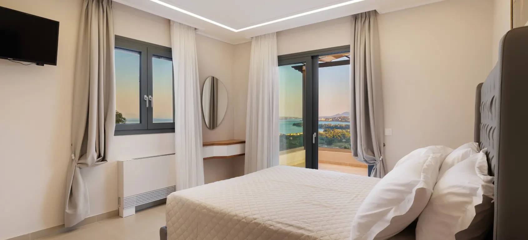 Designed to deliver an elevated living experience, the residence exudes luxury and comfort throughout. Expansive outdoor areas invite relaxation and entertainment, while the interiors showcase contemporary elegance, thoughtfully curated with high-end furnishings and meticulous attention to detail. The villa features five spacious bedrooms, each with its own en suite bathroom, ensuring privacy and comfort for all guests. Additionally, a fully independent guest studio provides an ideal space for visitors or staff. Every room enjoys sweeping views of the lush landscape, the Ionian Sea, and Corfu Town, with the villa’s terraces offering the most idyllic vantage points to soak in the scenery. A beautifully landscaped garden unfolds on a lower level, complete with ample space for a children’s play area.